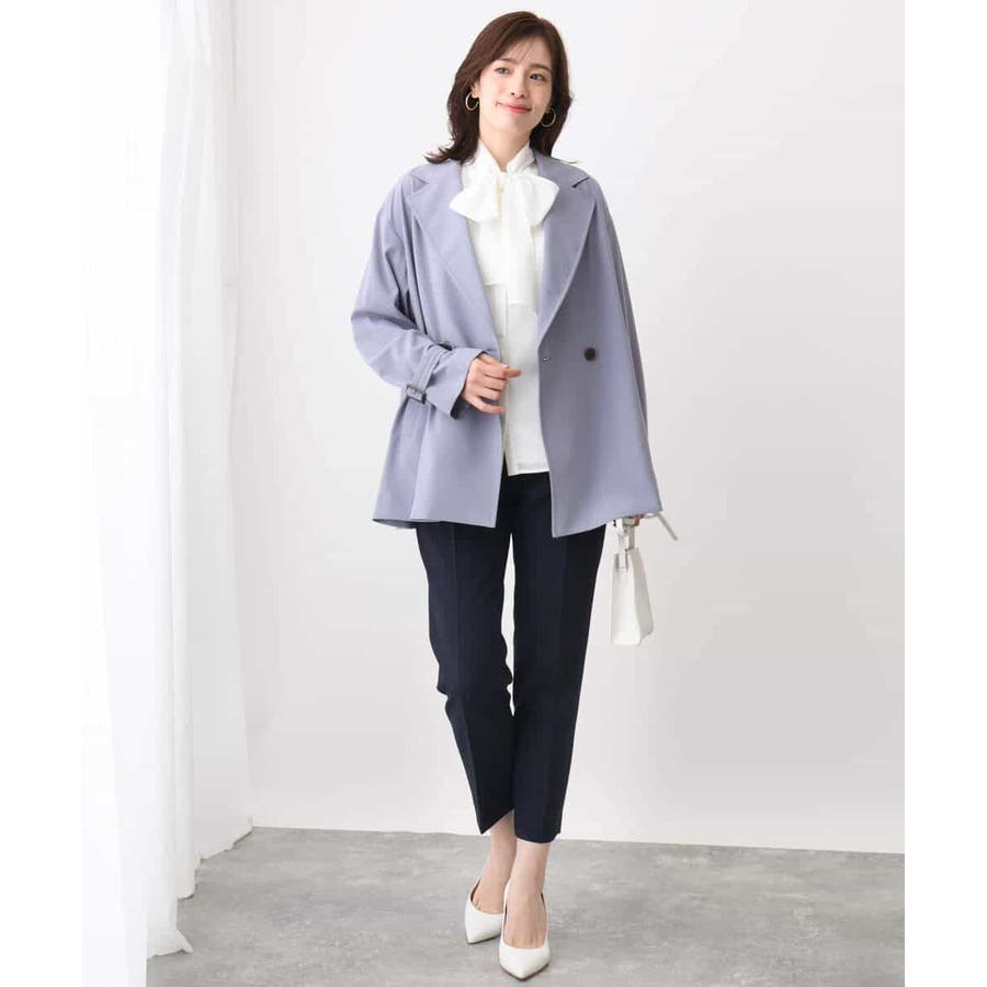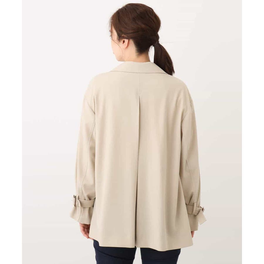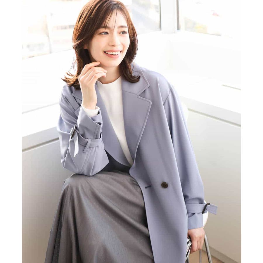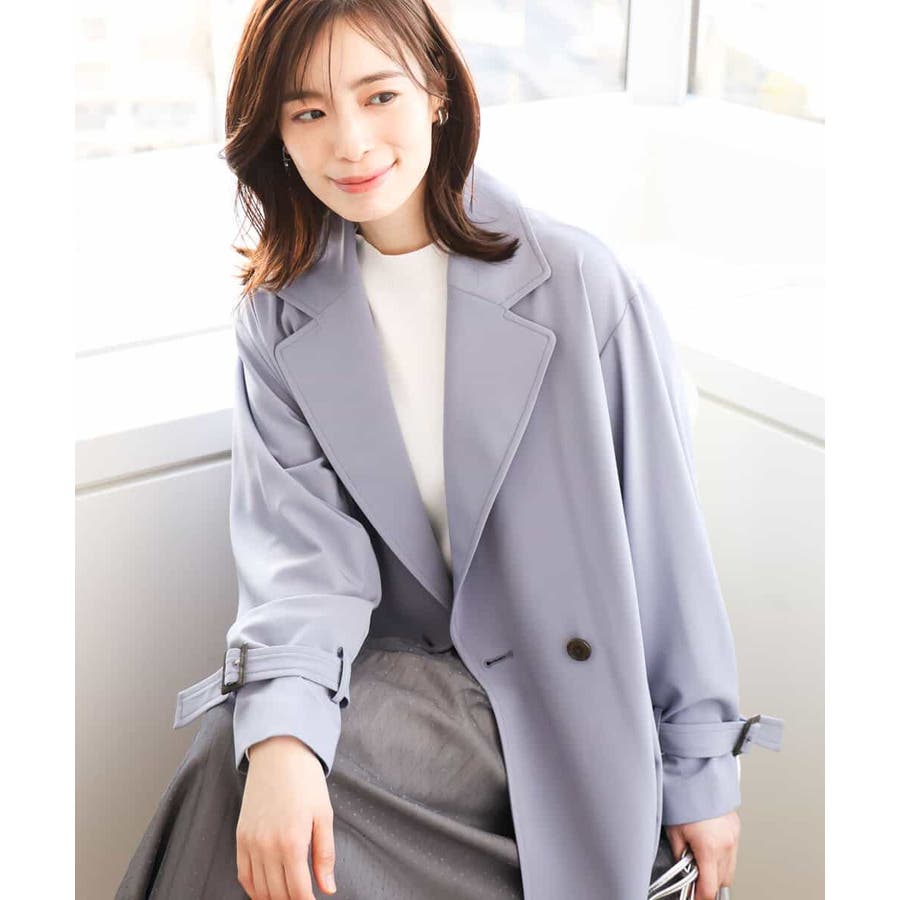 ゆったりとしたデザインに短めの着丈がバランス良く着こなせるショートトレンチコート。やわらかな素材なのでゆったりシルエットもこなれ感のある着こなしに。