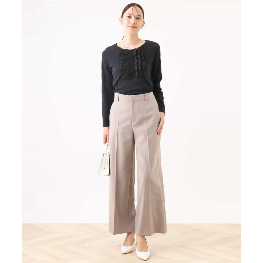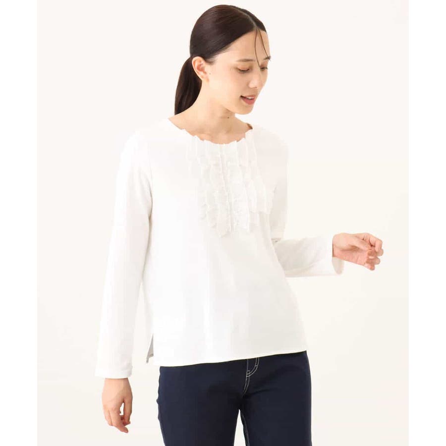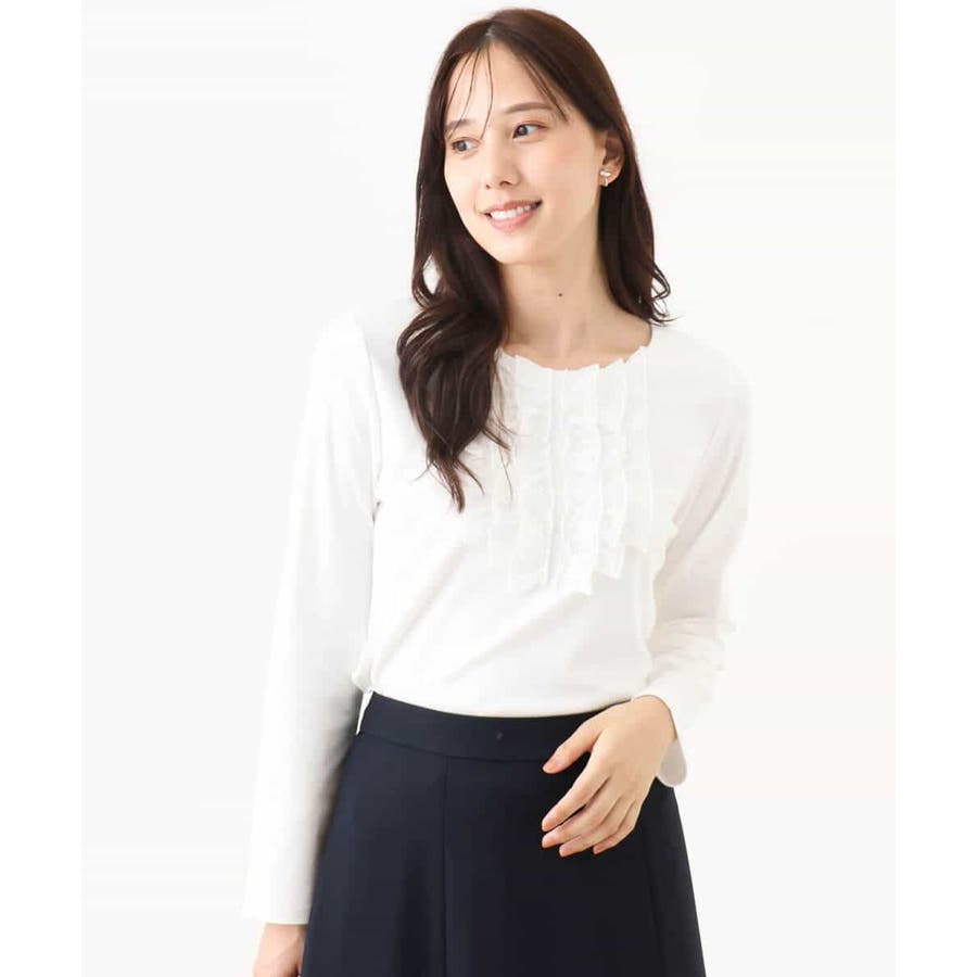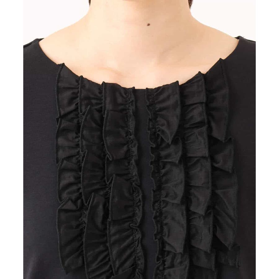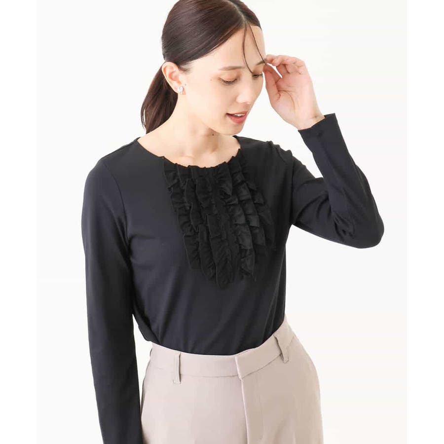 胸元のミニフリルディテールでジャケットインナーにも華やかなカットソー。フリル部分は薄手で微光沢が上品な別布仕立てになっています。裾脇のスリットでトップスアウトでも決まるデザインです。