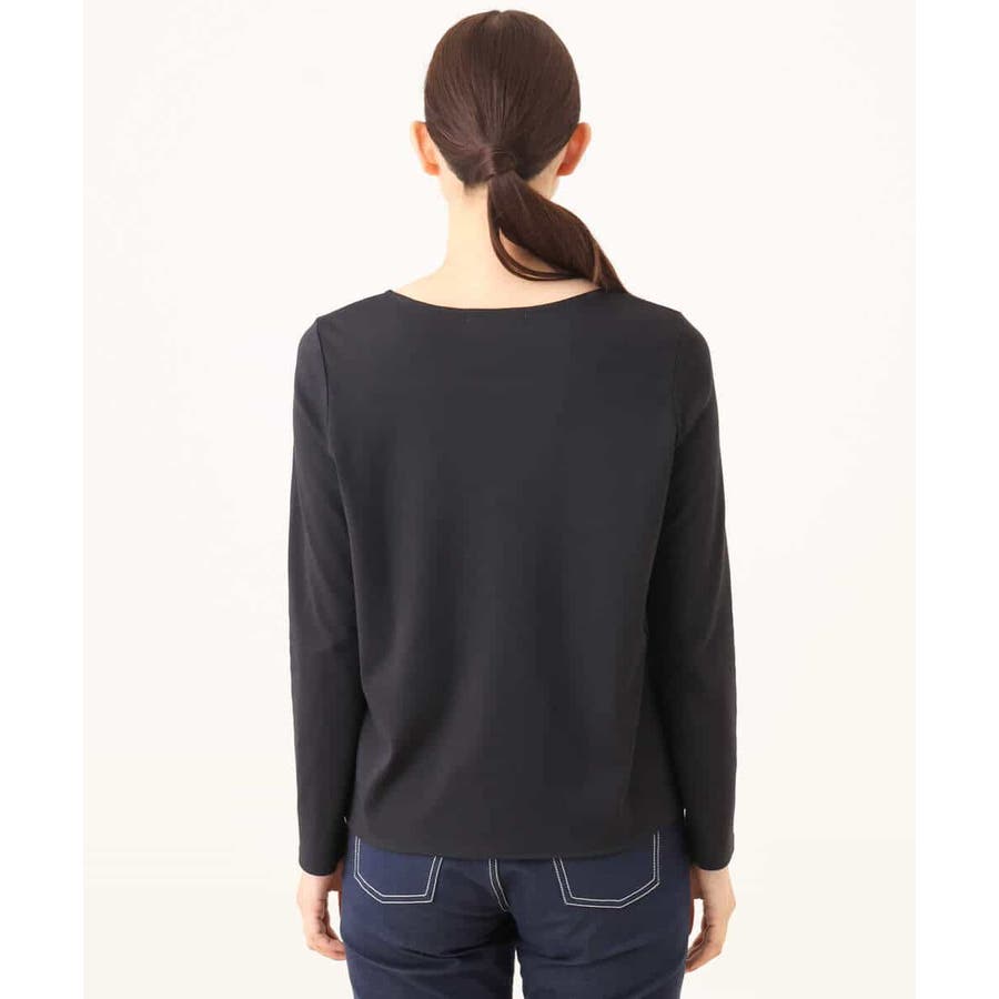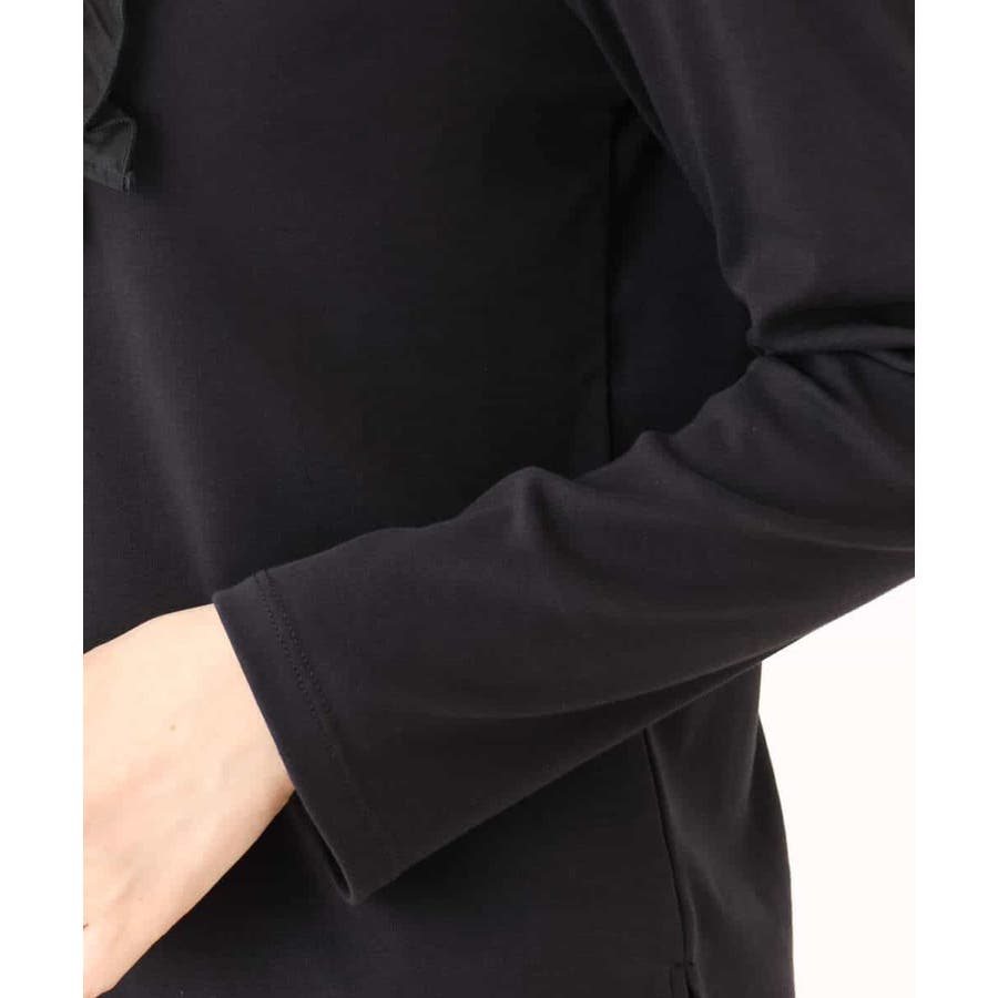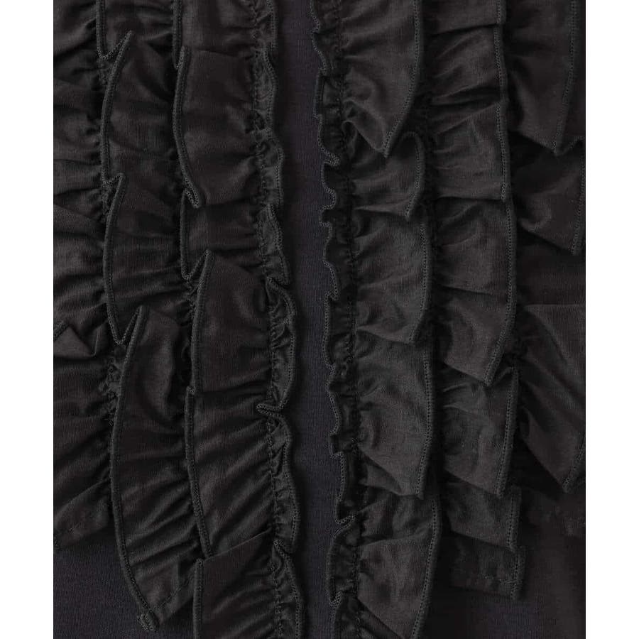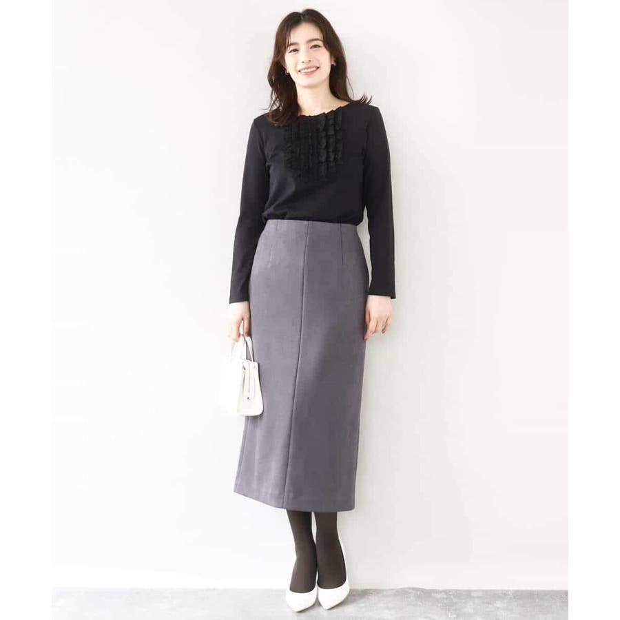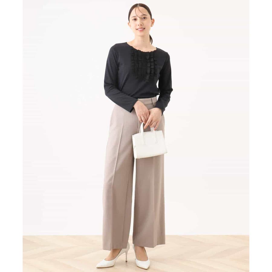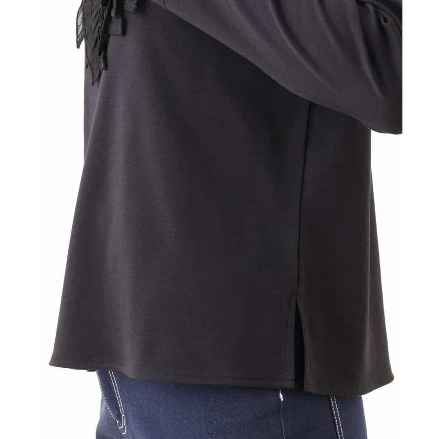 胸元のミニフリルディテールでジャケットインナーにも華やかなカットソー。フリル部分は薄手で微光沢が上品な別布仕立てになっています。裾脇のスリットでトップスアウトでも決まるデザインです。