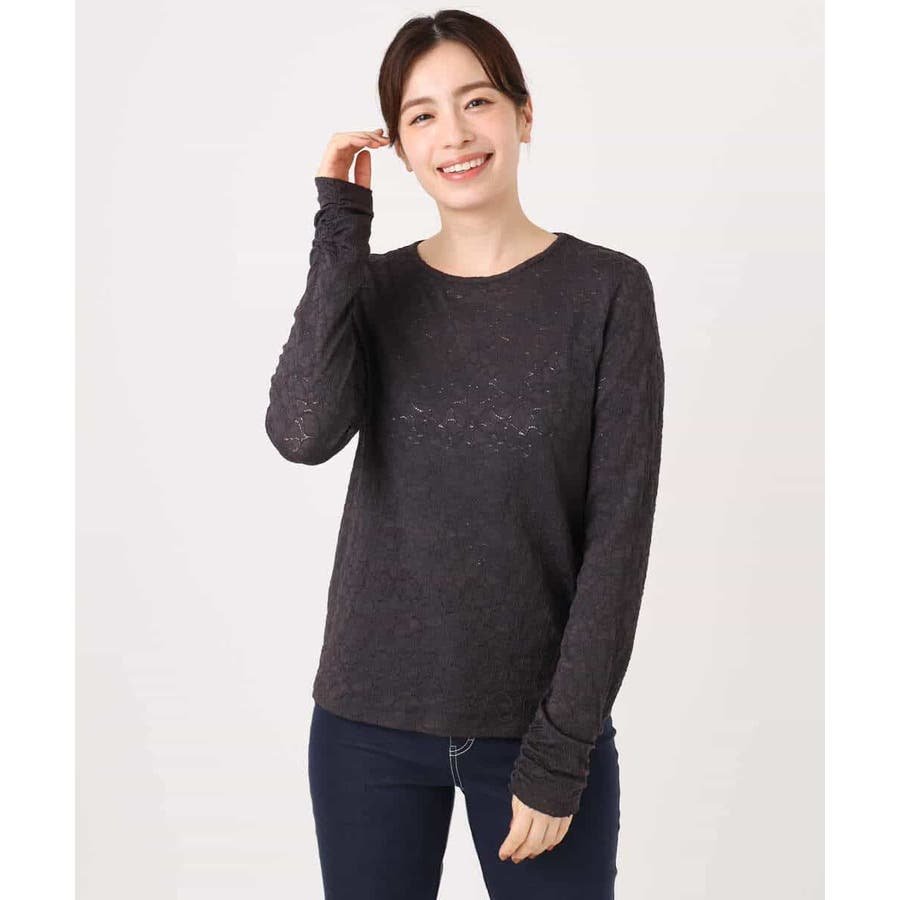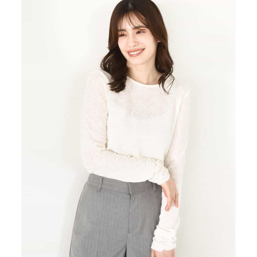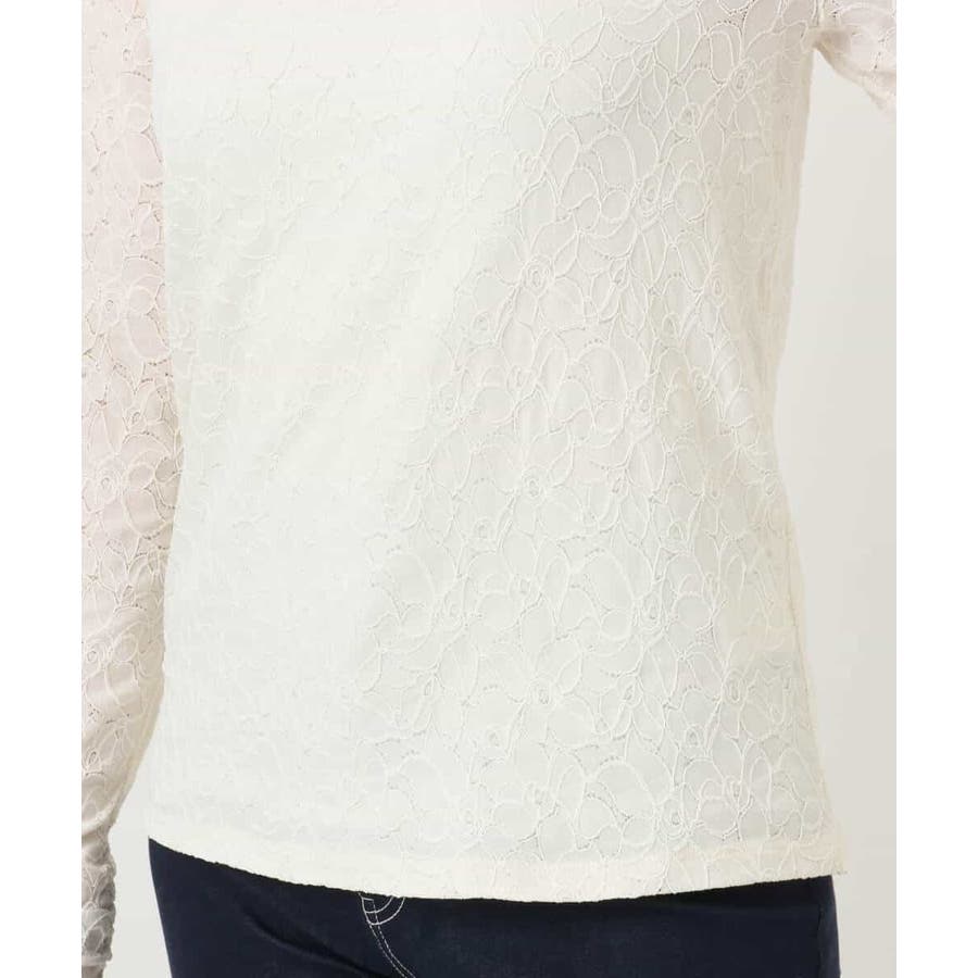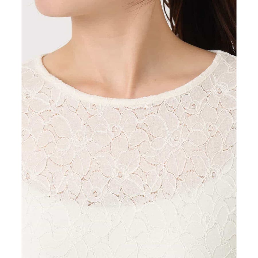 伸縮性のあるフラワーレース素材のカットソー。繊細すぎずきれいめもカジュアルもどちらにも相性◎。ほんのり透け感あり。