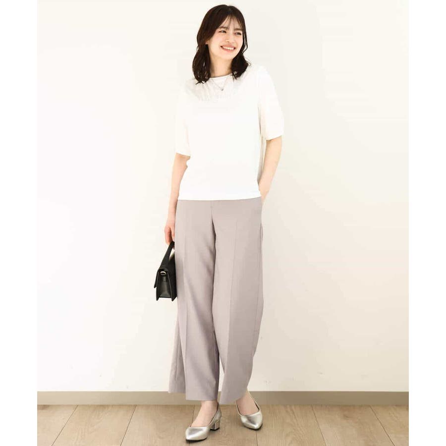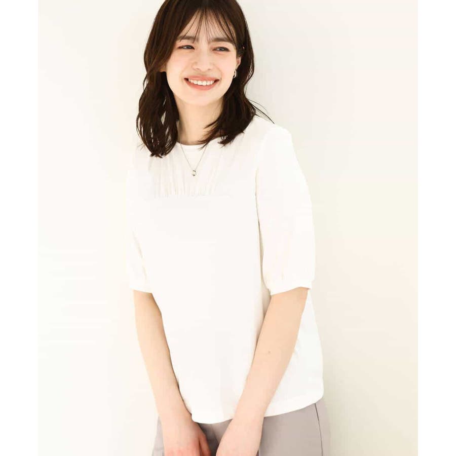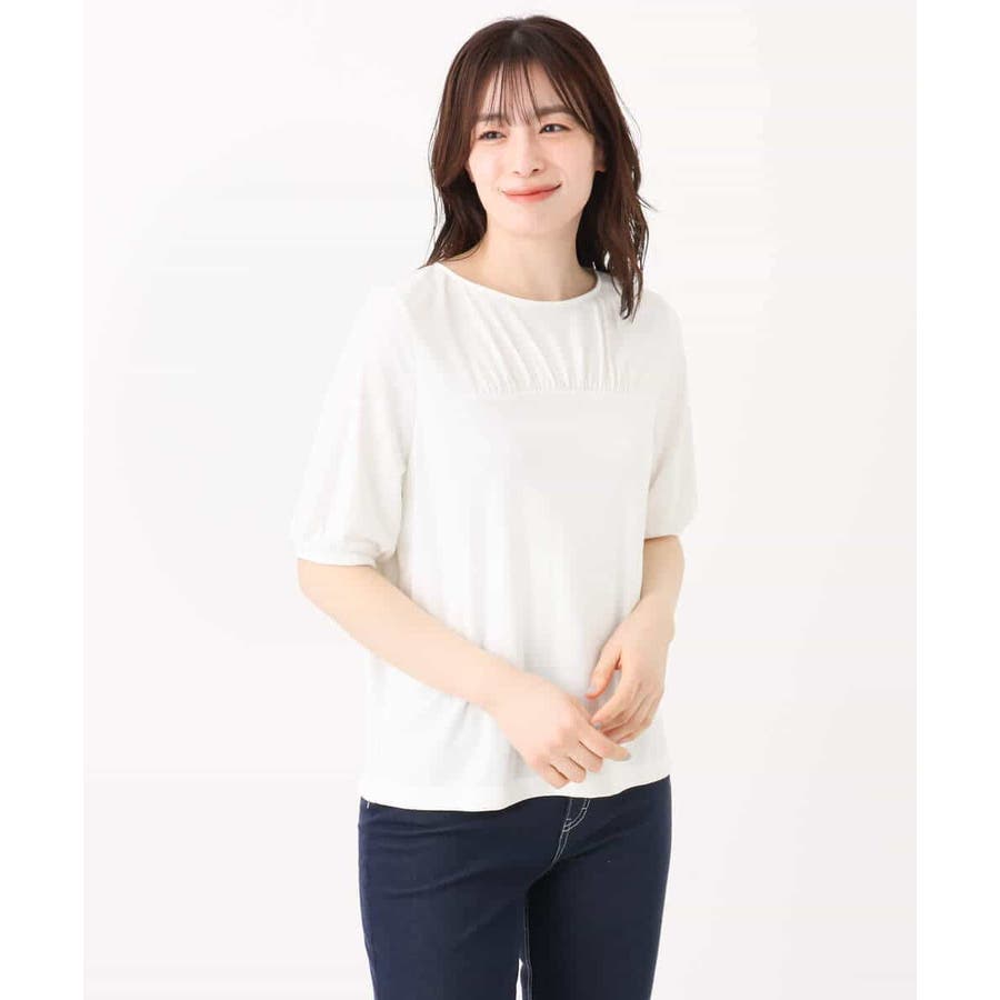 ヨーク部分のギャザーディティールとパフスリーブがフェミニンな印象のカットソー。ジャケットインナーにも便利なセットインスリーブデザインです。