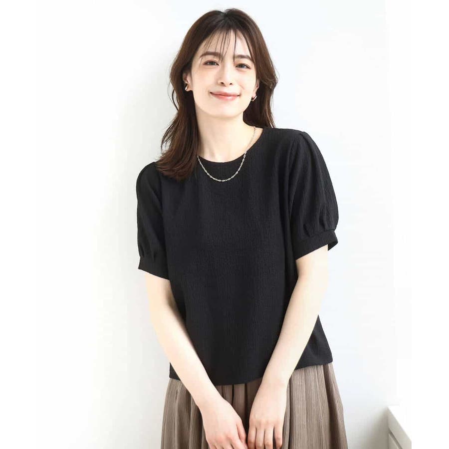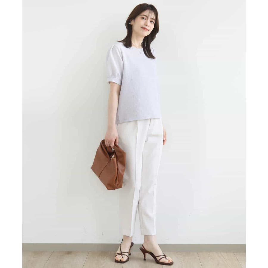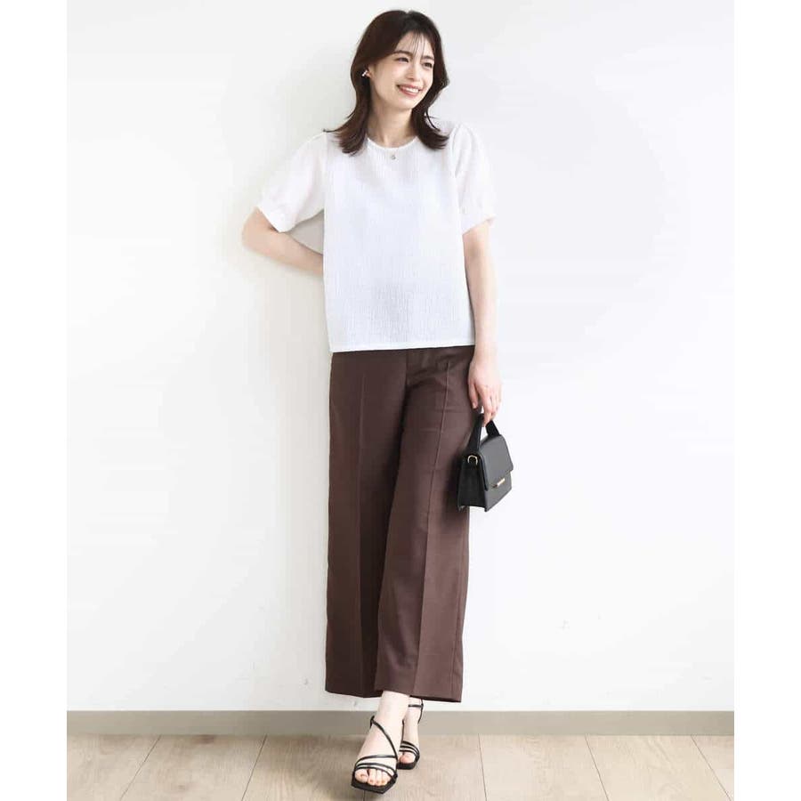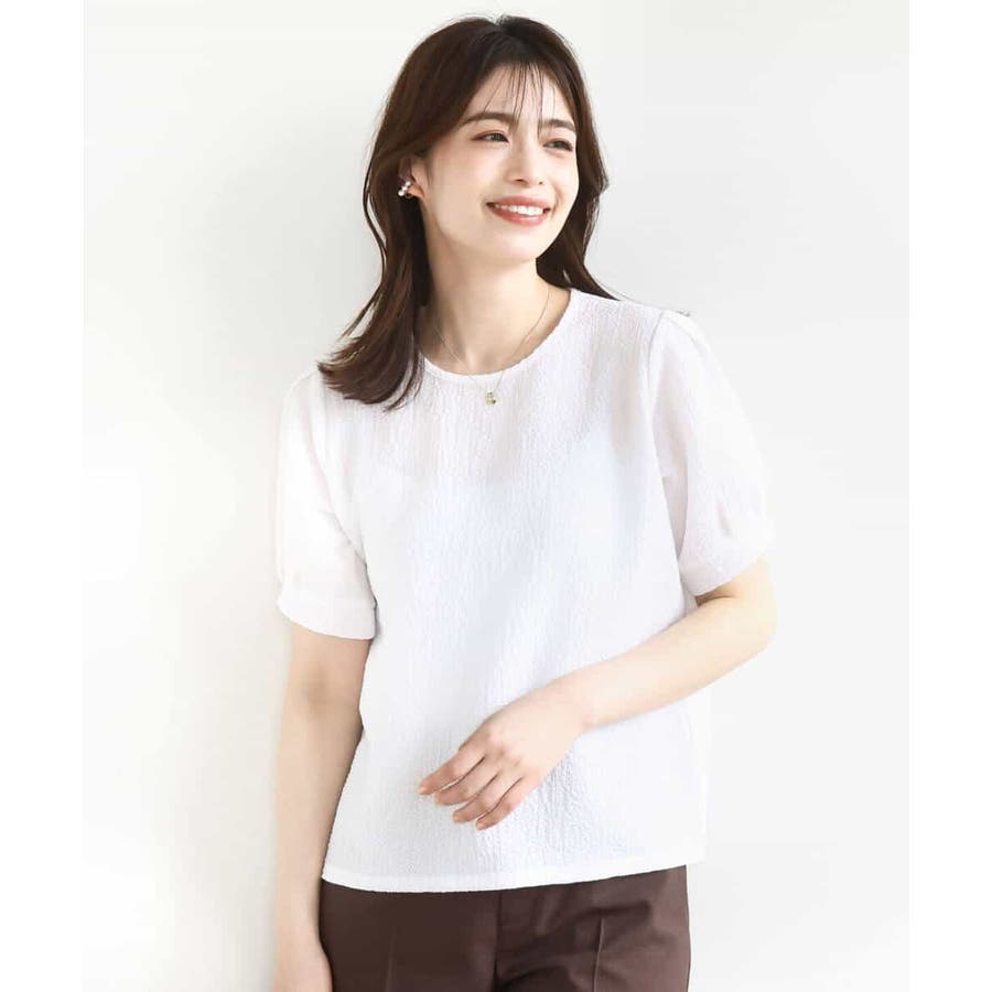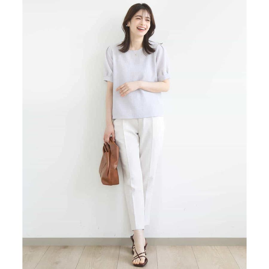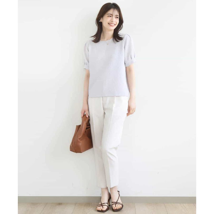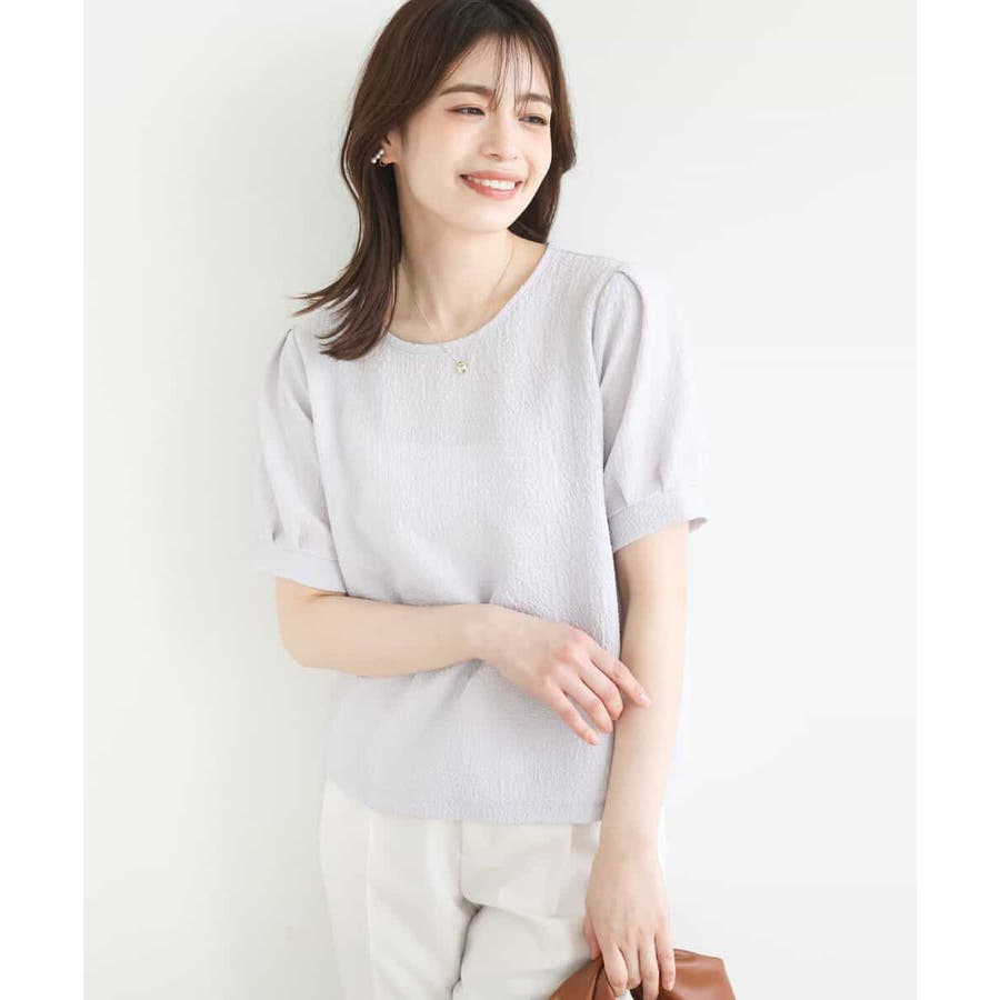 すっきりと開いたラウンドネックと甘すぎないタック入りのパフスリーブが一枚で決まるトップス。二の腕を程良くカバーしてくれる袖丈も嬉しい。