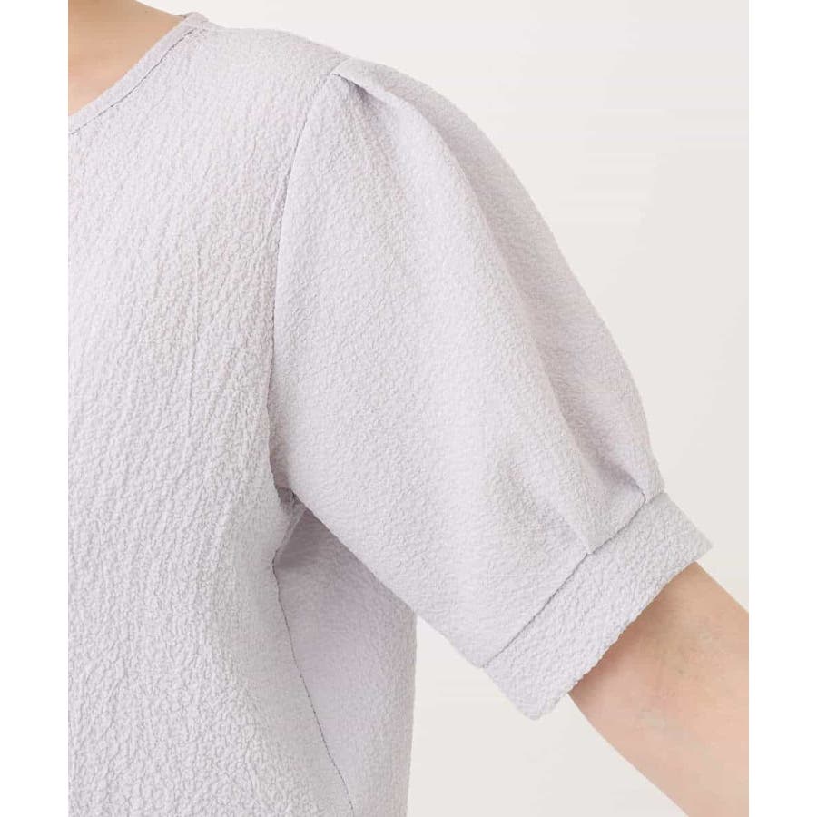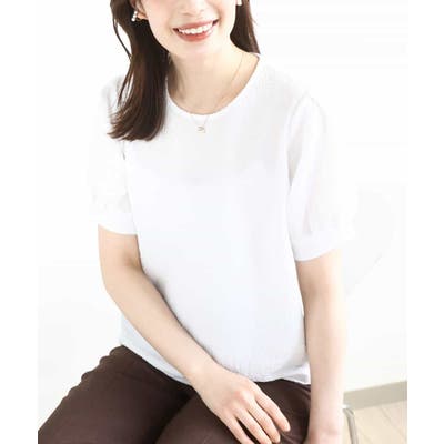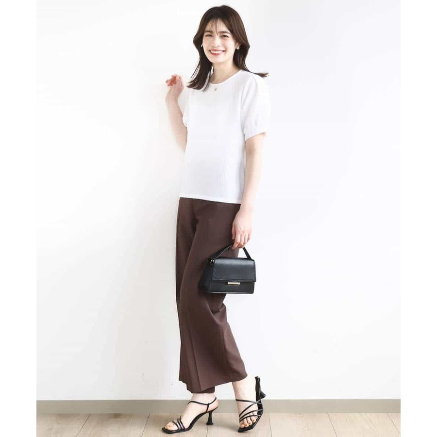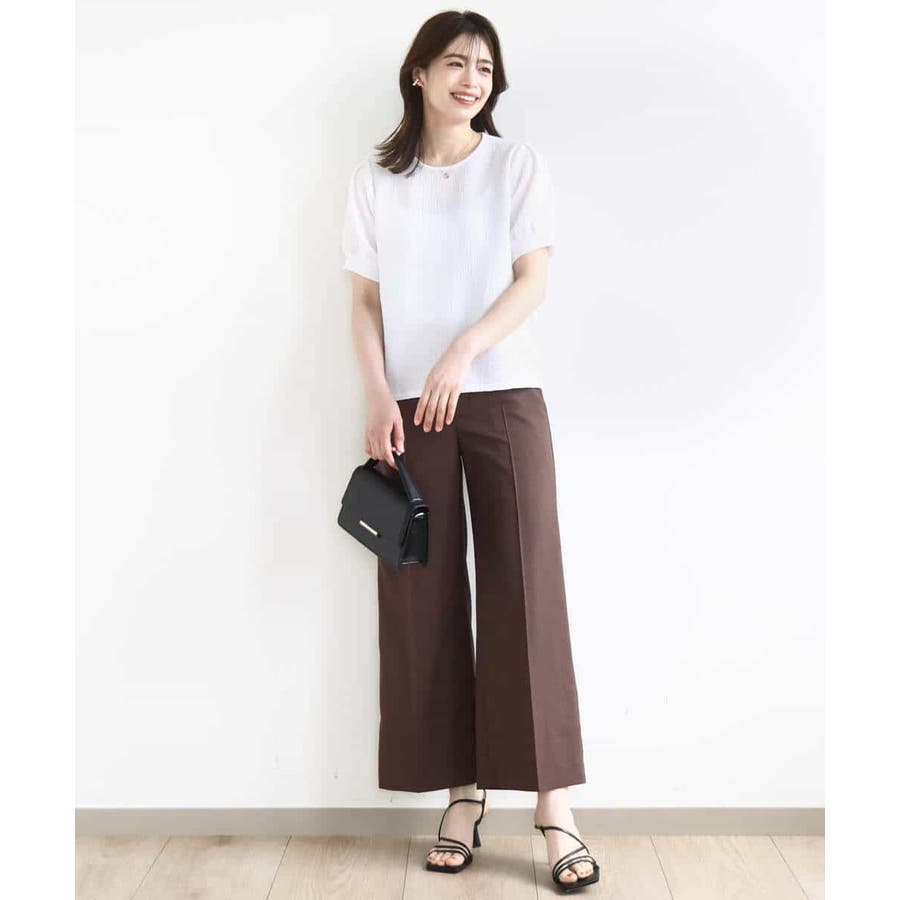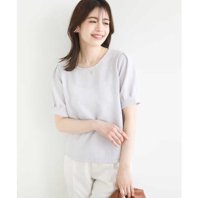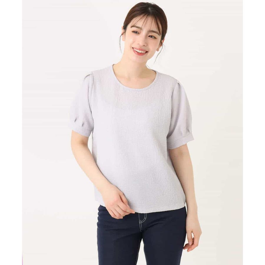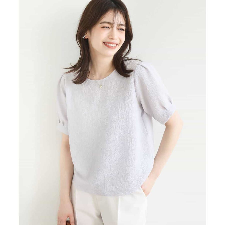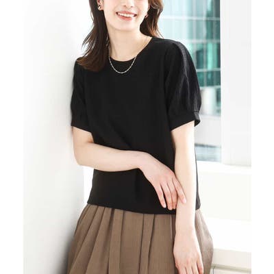すっきりと開いたラウンドネックと甘すぎないタック入りのパフスリーブが一枚で決まるトップス。二の腕を程良くカバーしてくれる袖丈も嬉しい。