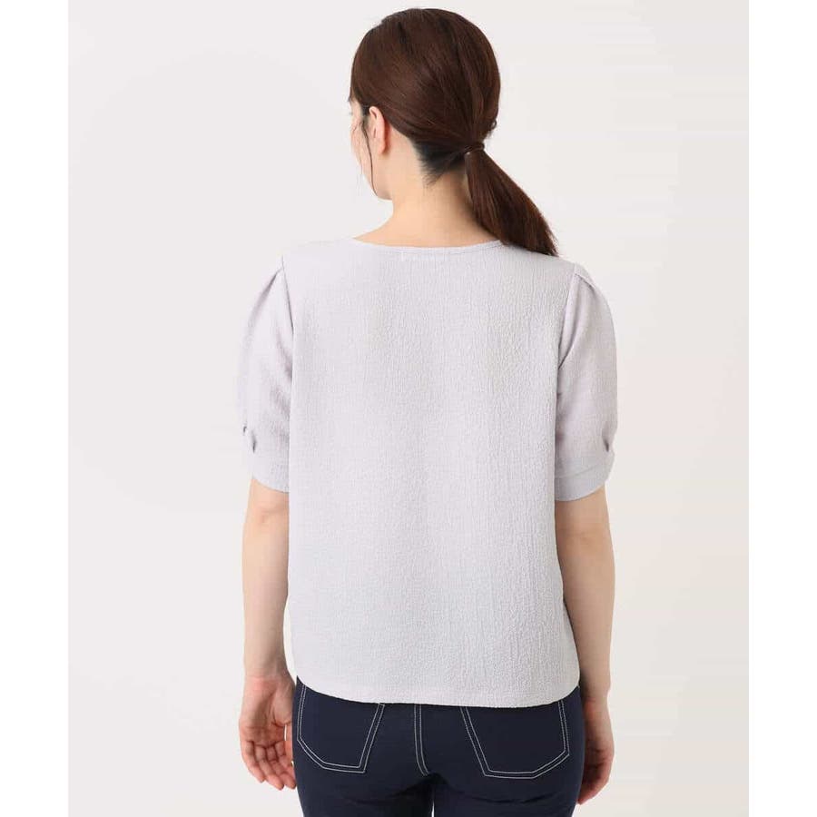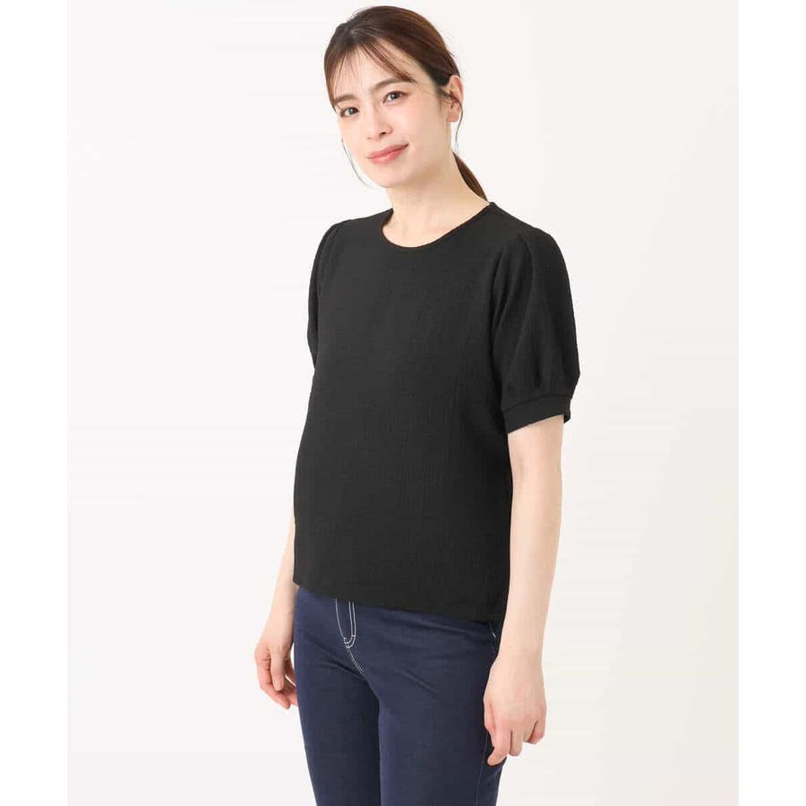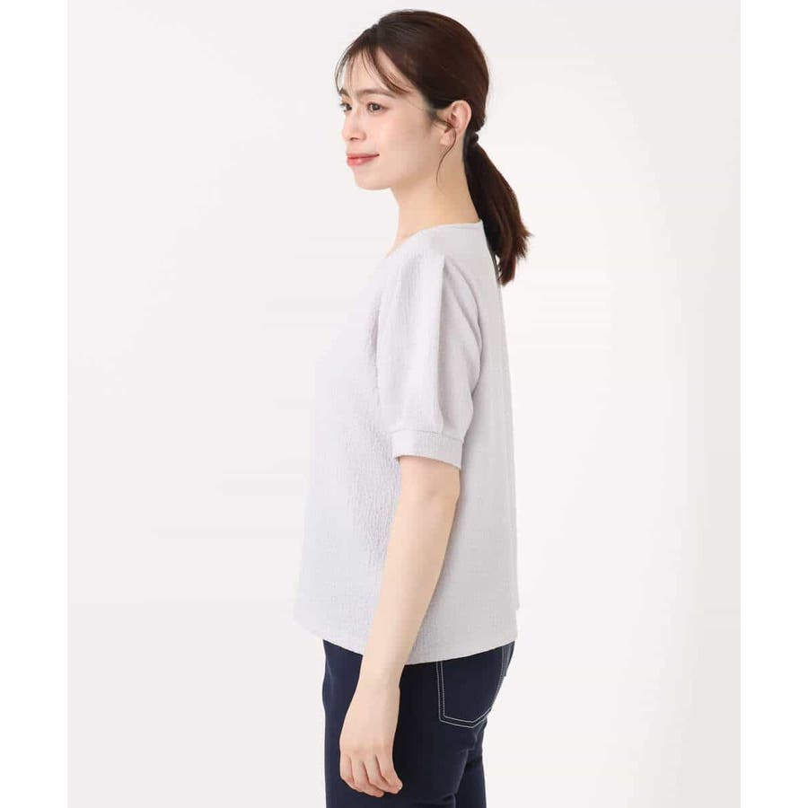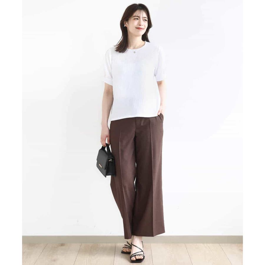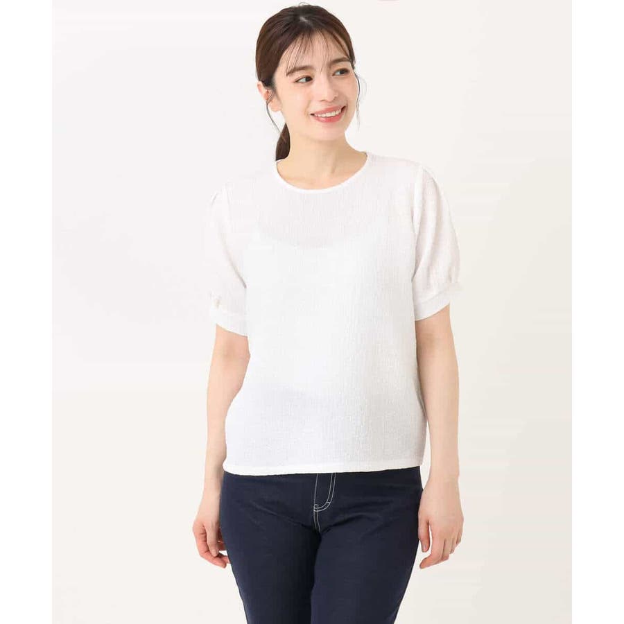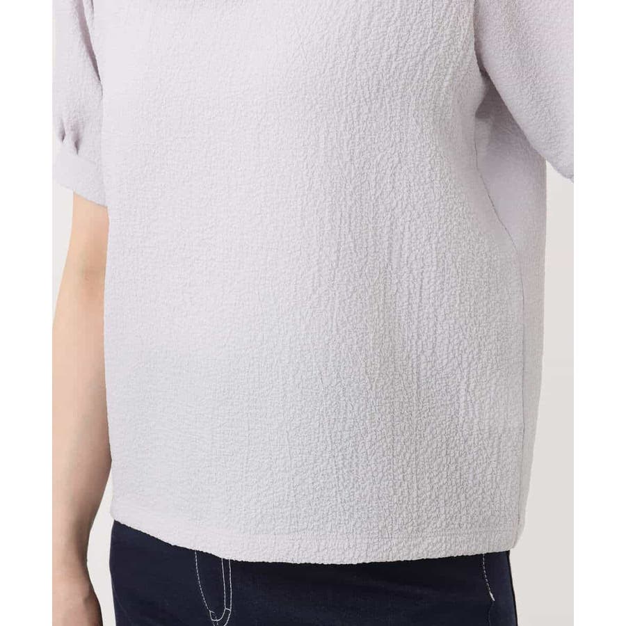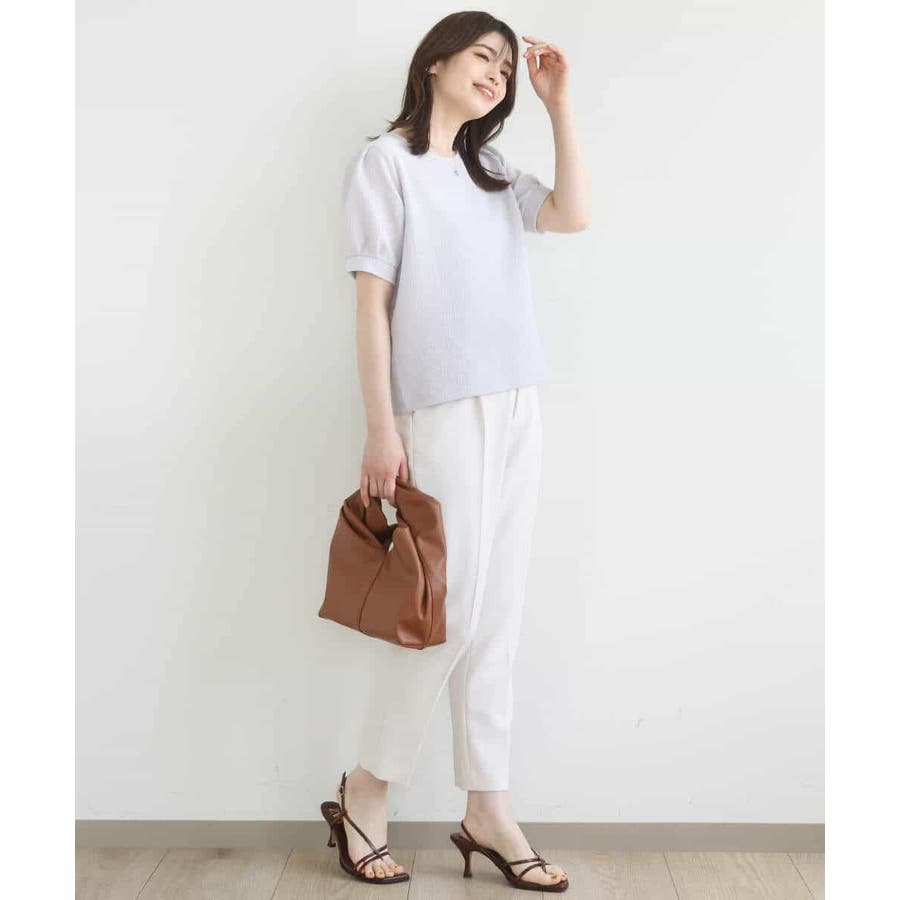 すっきりと開いたラウンドネックと甘すぎないタック入りのパフスリーブが一枚で決まるトップス。二の腕を程良くカバーしてくれる袖丈も嬉しい。