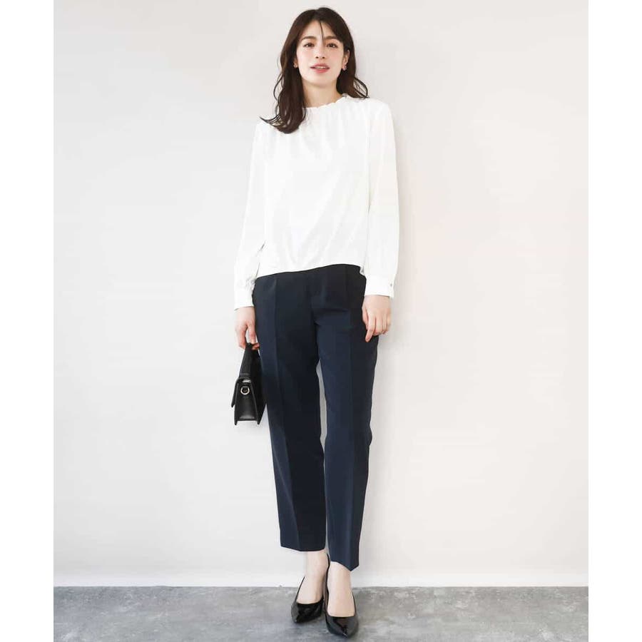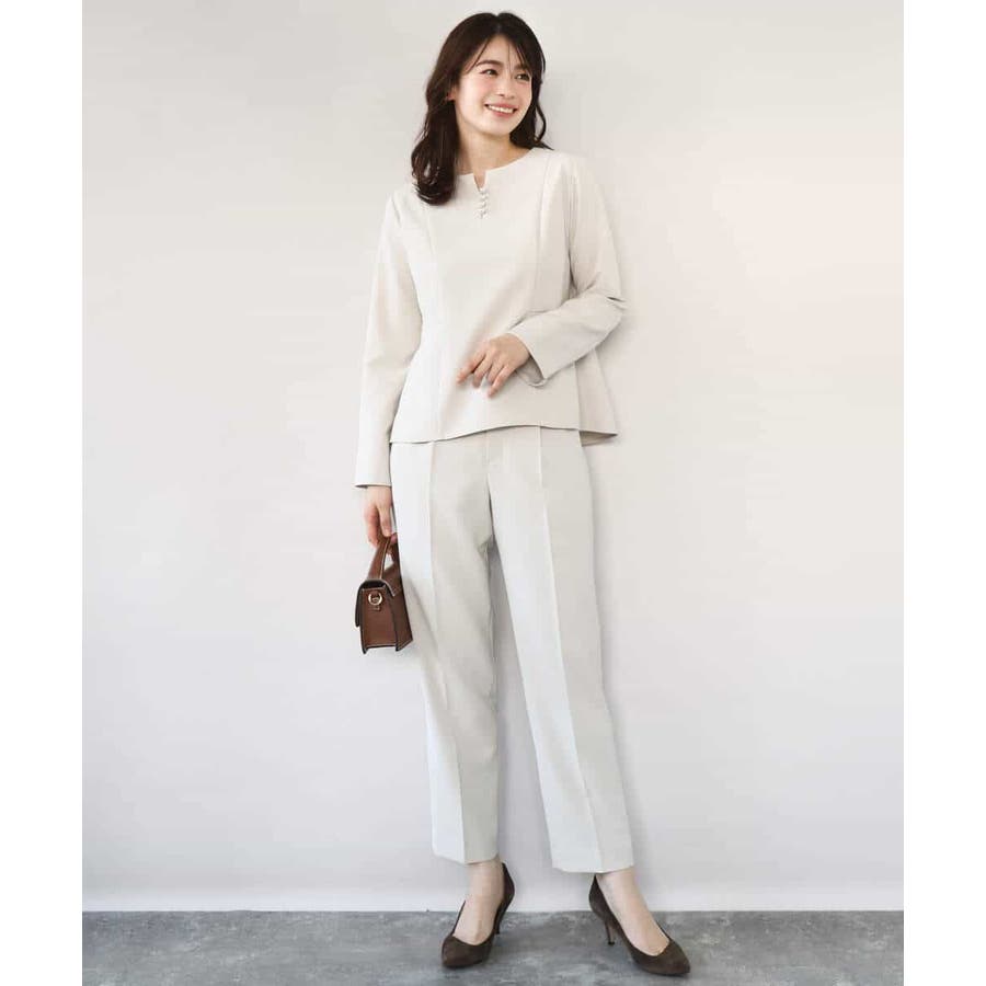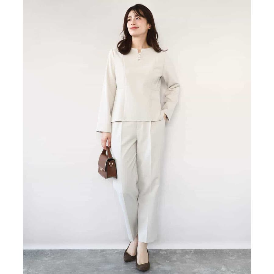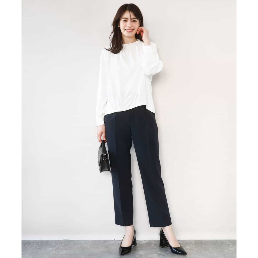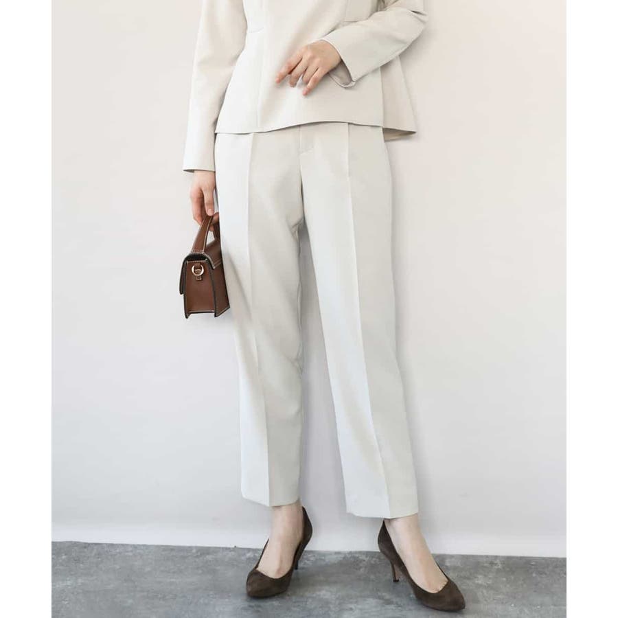 きれい見えのパンツはお仕事からお休みの日まで幅広く活躍してくれます。同素材のブラウスとセットアップでの着こなしもおすすめ。