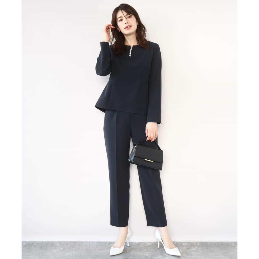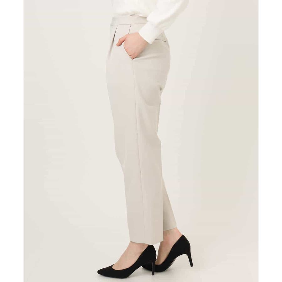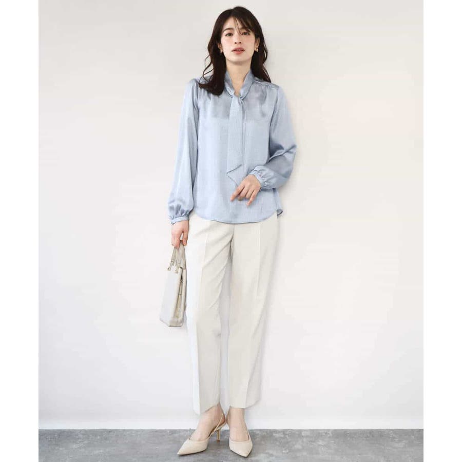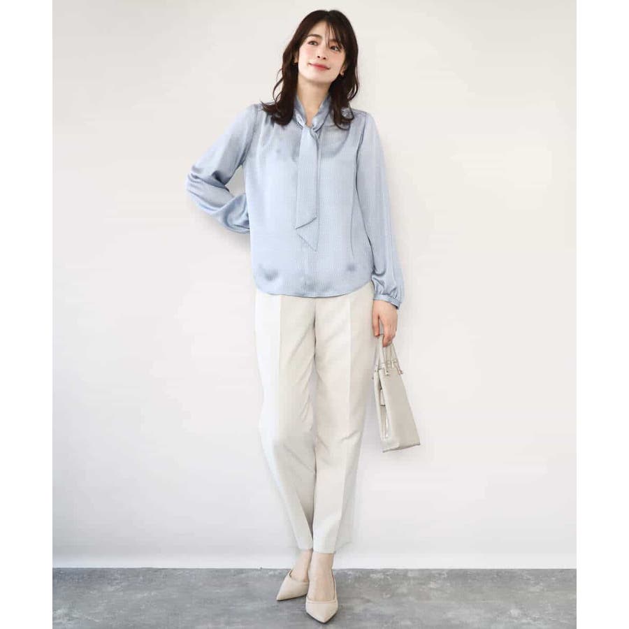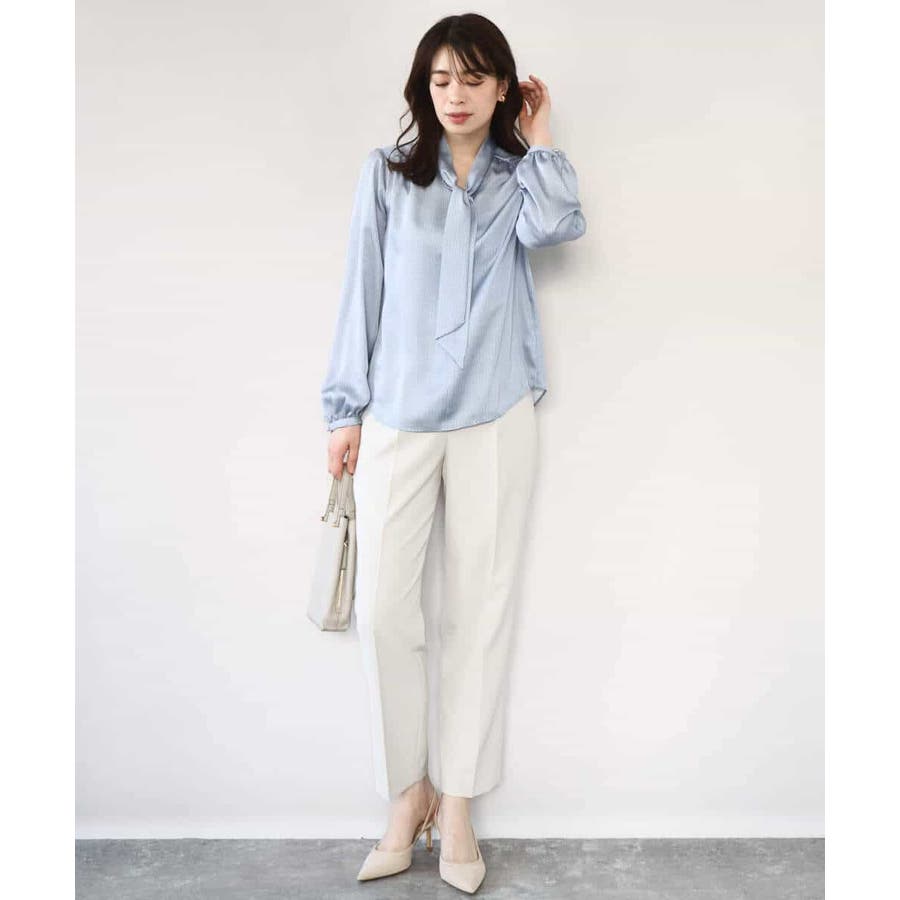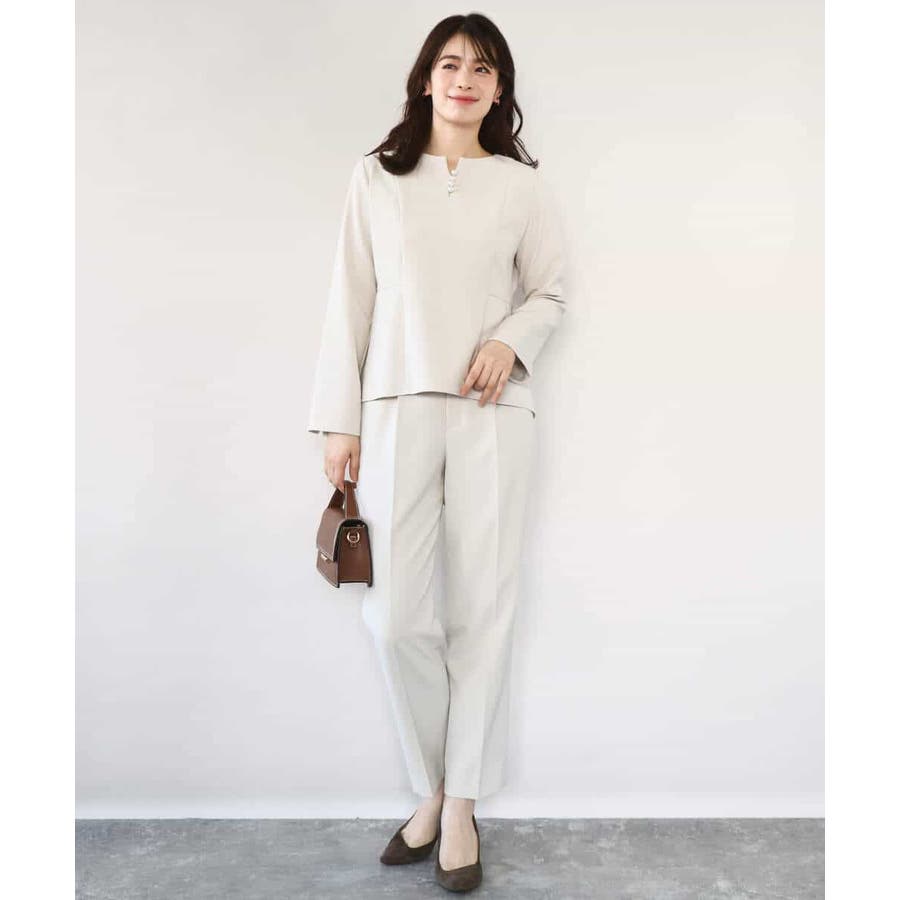 きれい見えのパンツはお仕事からお休みの日まで幅広く活躍してくれます。同素材のブラウスとセットアップでの着こなしもおすすめ。