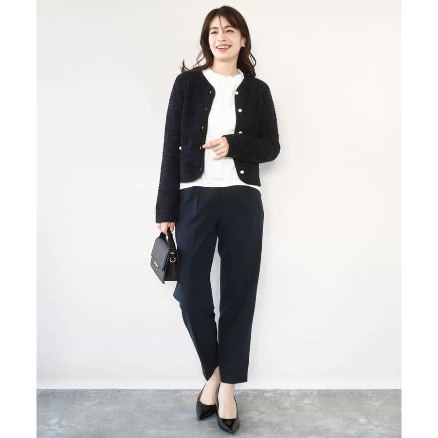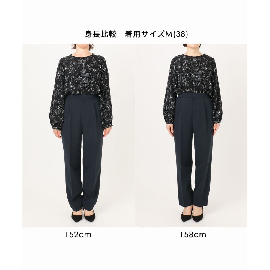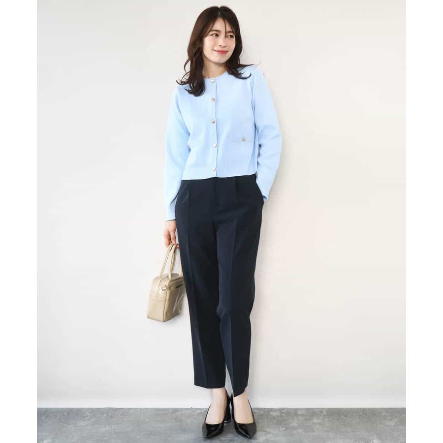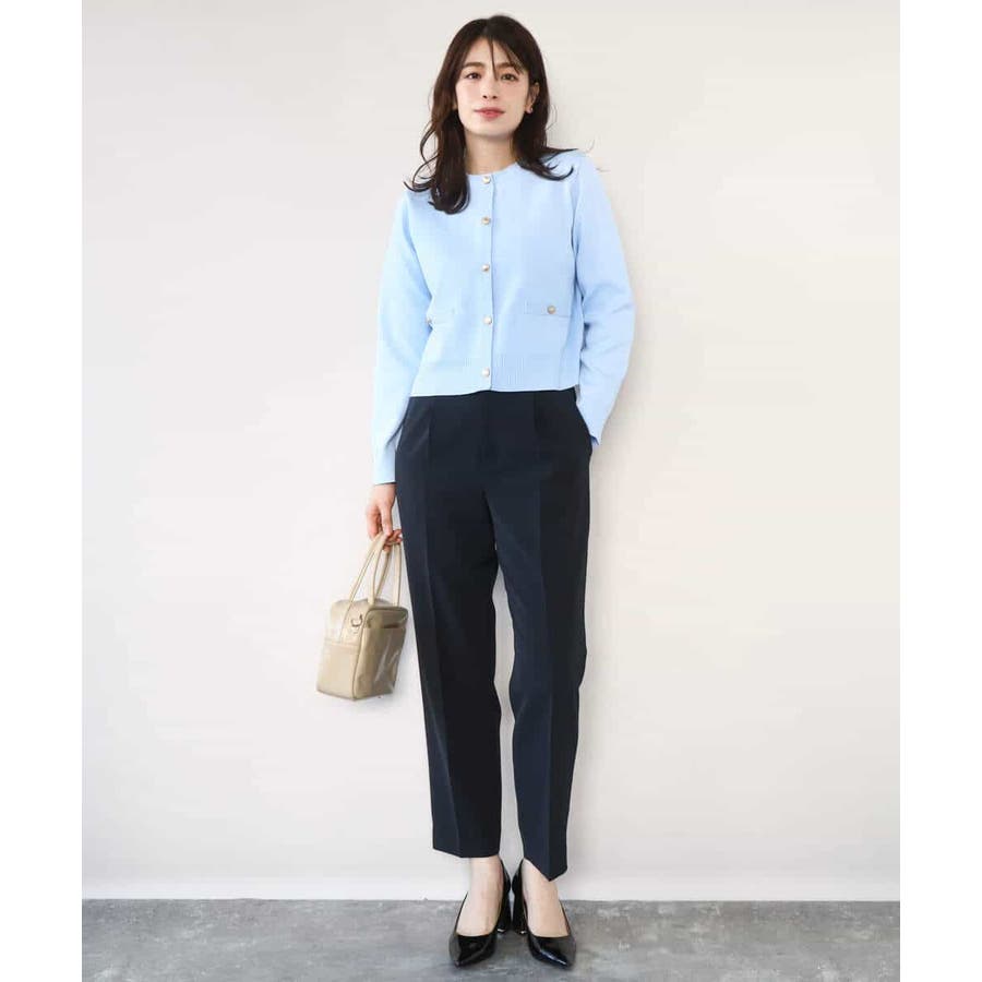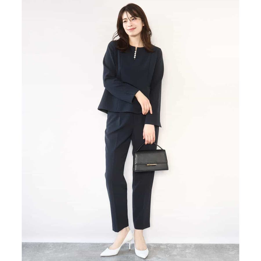 きれい見えのパンツはお仕事からお休みの日まで幅広く活躍してくれます。同素材のブラウスとセットアップでの着こなしもおすすめ。