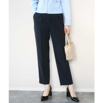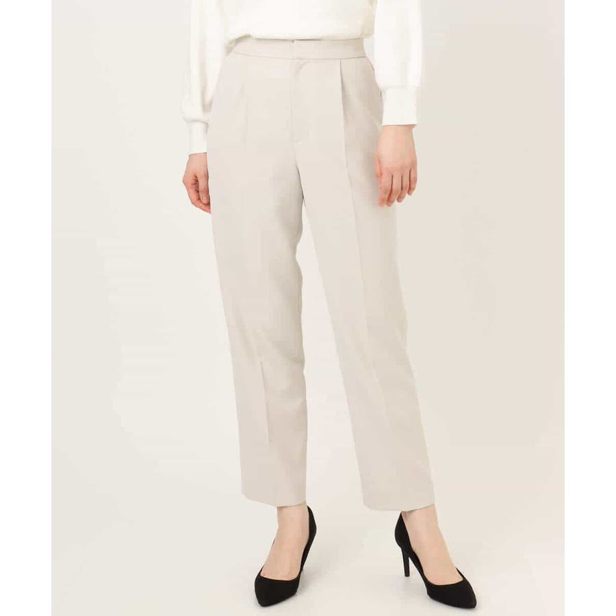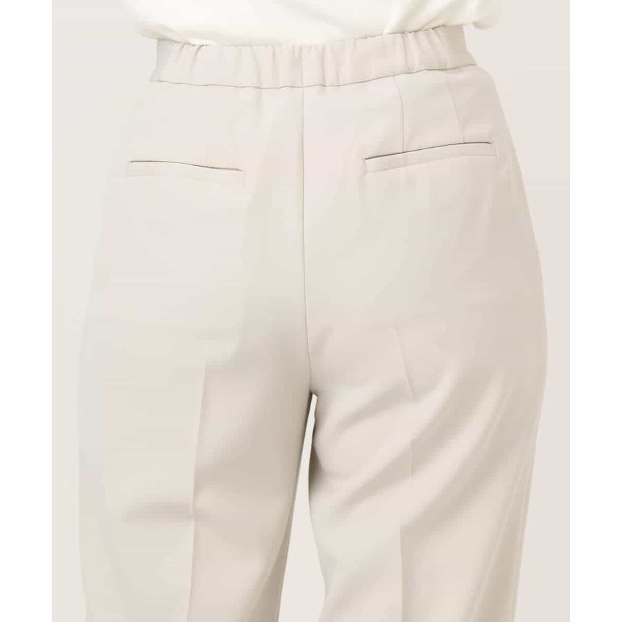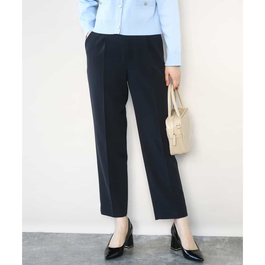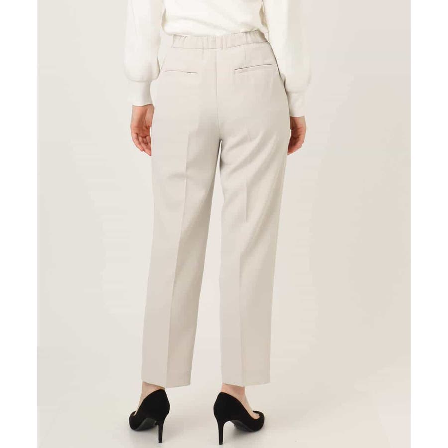 脚のラインがすっきりと見えるセンタープレス入り。ヒールでもフラットシューズでも合わせやすいテーパードシルエットに仕上げました。後ろウエストはゴム仕様なので履き心地も快適。