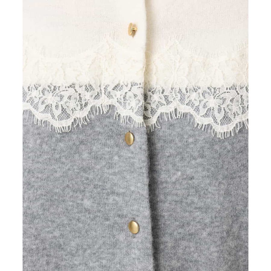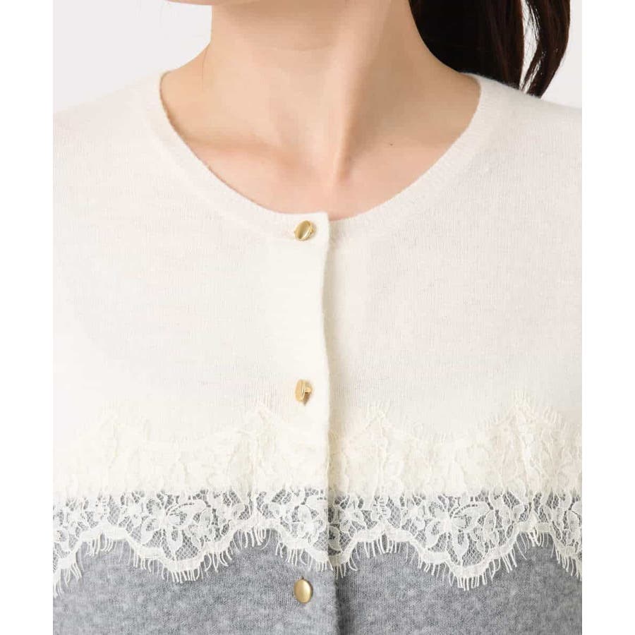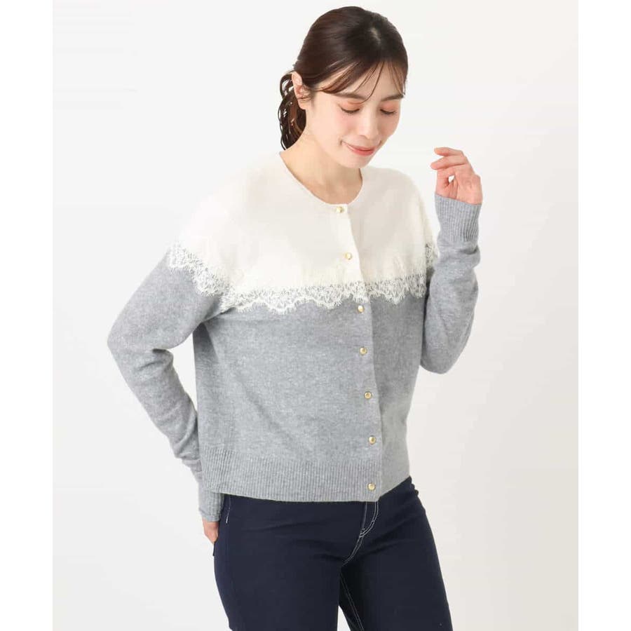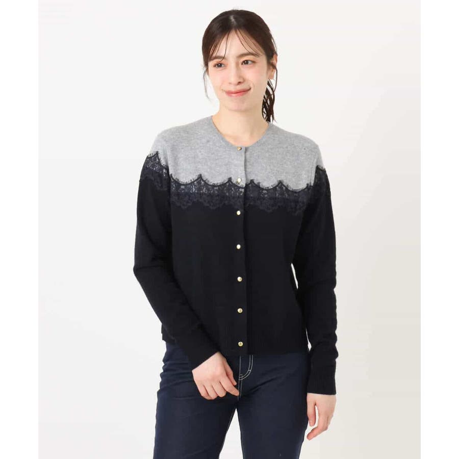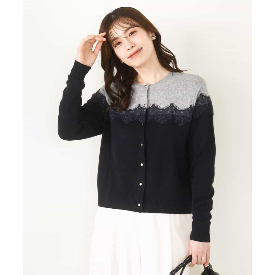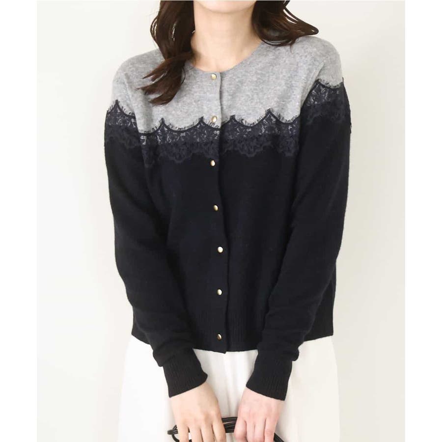 ヨーク部分で切り替えた配色と、繊細なスカラップレースが一枚で着映えるニットカーディガン。ベーシックなカラーの組み合わせはONシーンにもコーディネートしやすいカラー展開です。