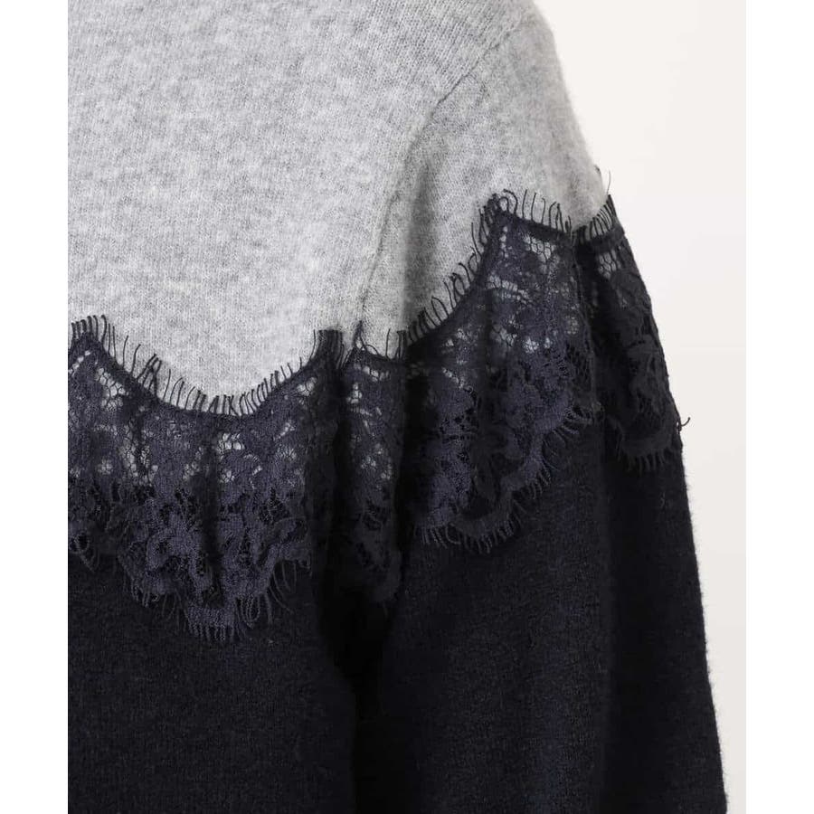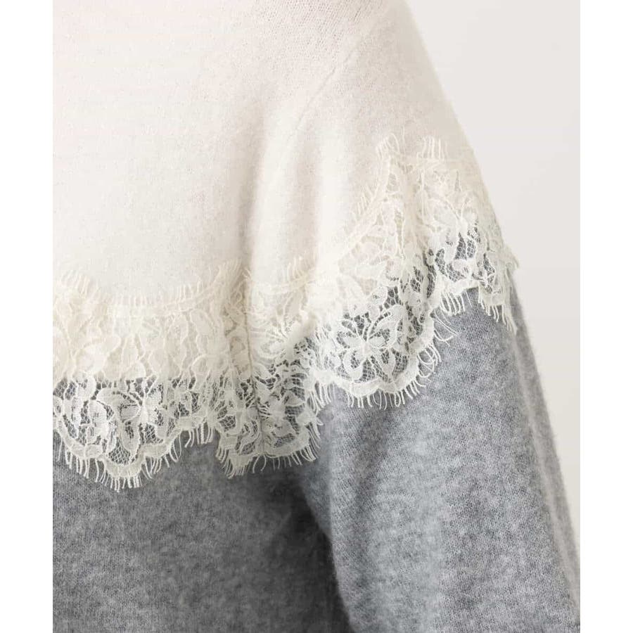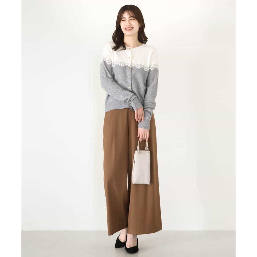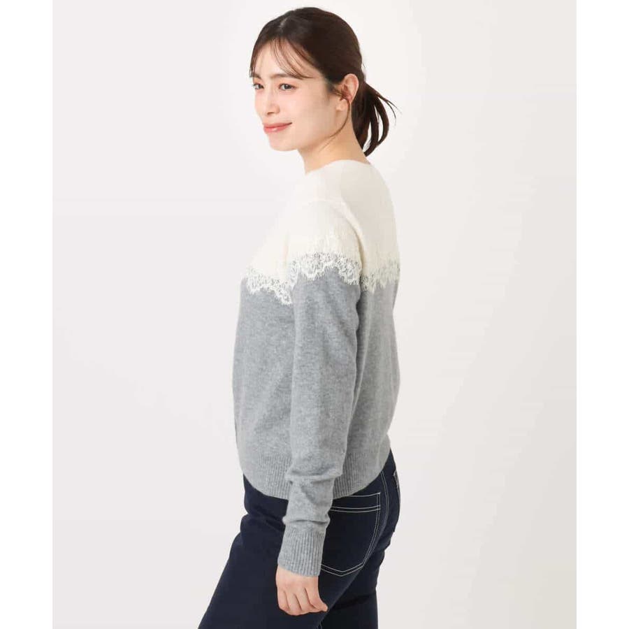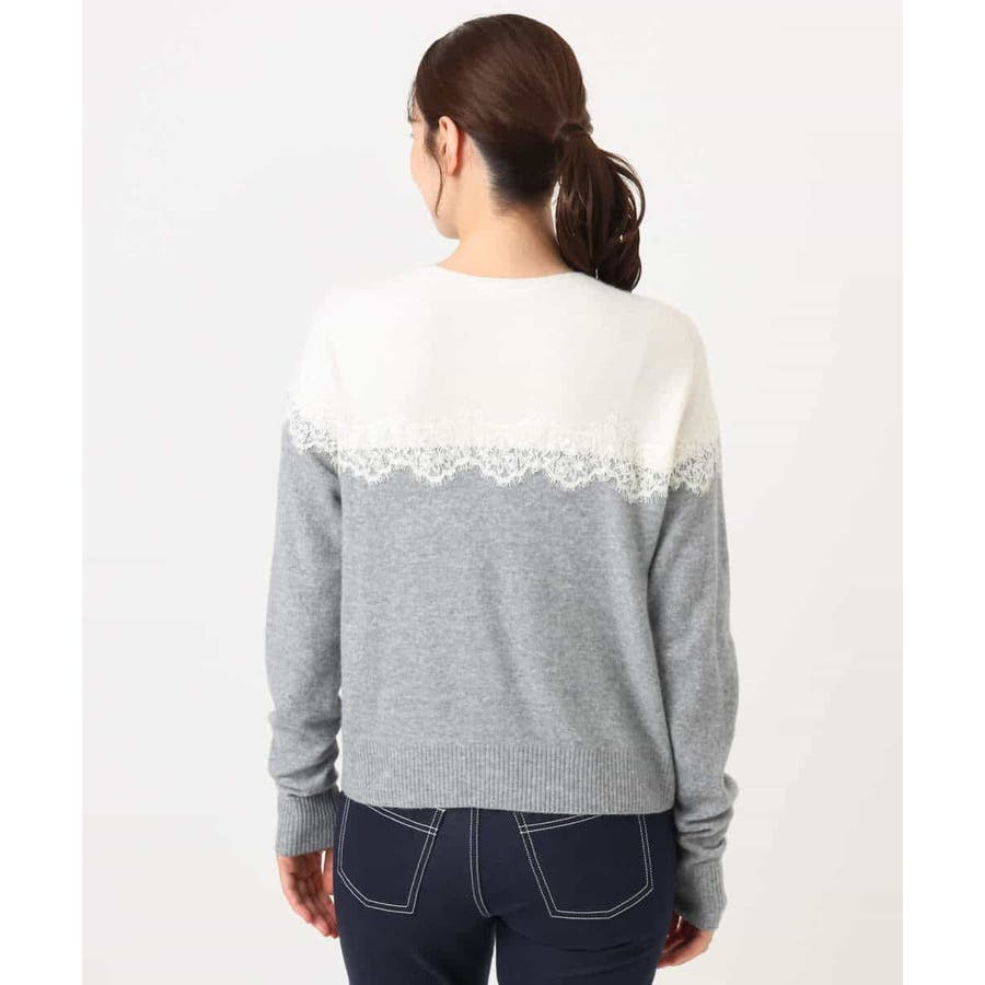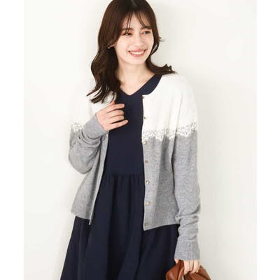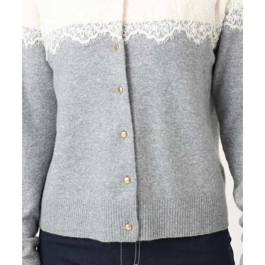 ヨーク部分で切り替えた配色と、繊細なスカラップレースが一枚で着映えるニットカーディガン。ベーシックなカラーの組み合わせはONシーンにもコーディネートしやすいカラー展開です。