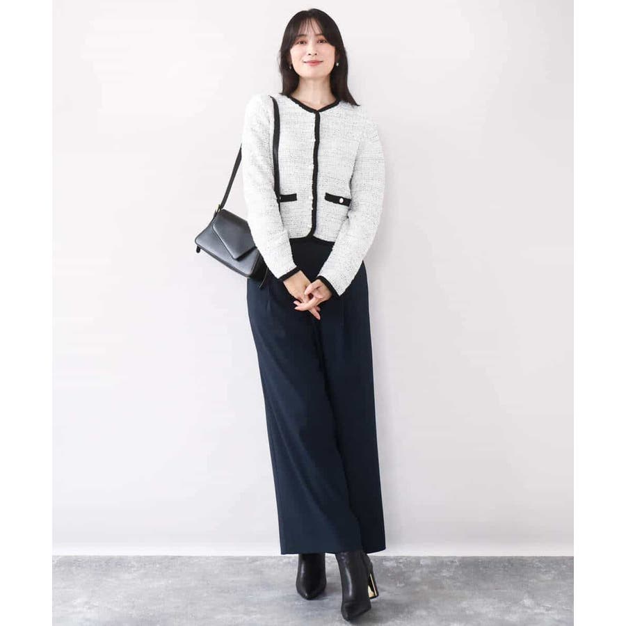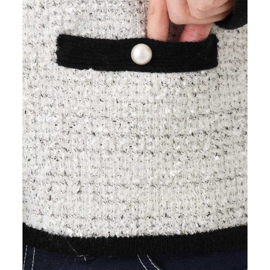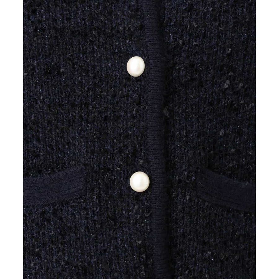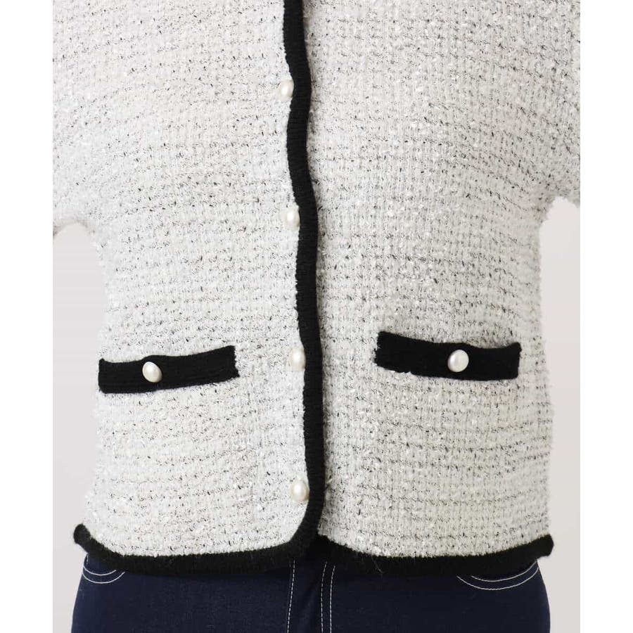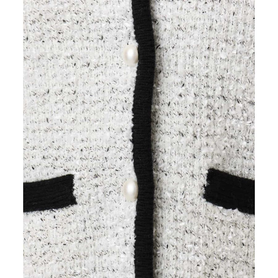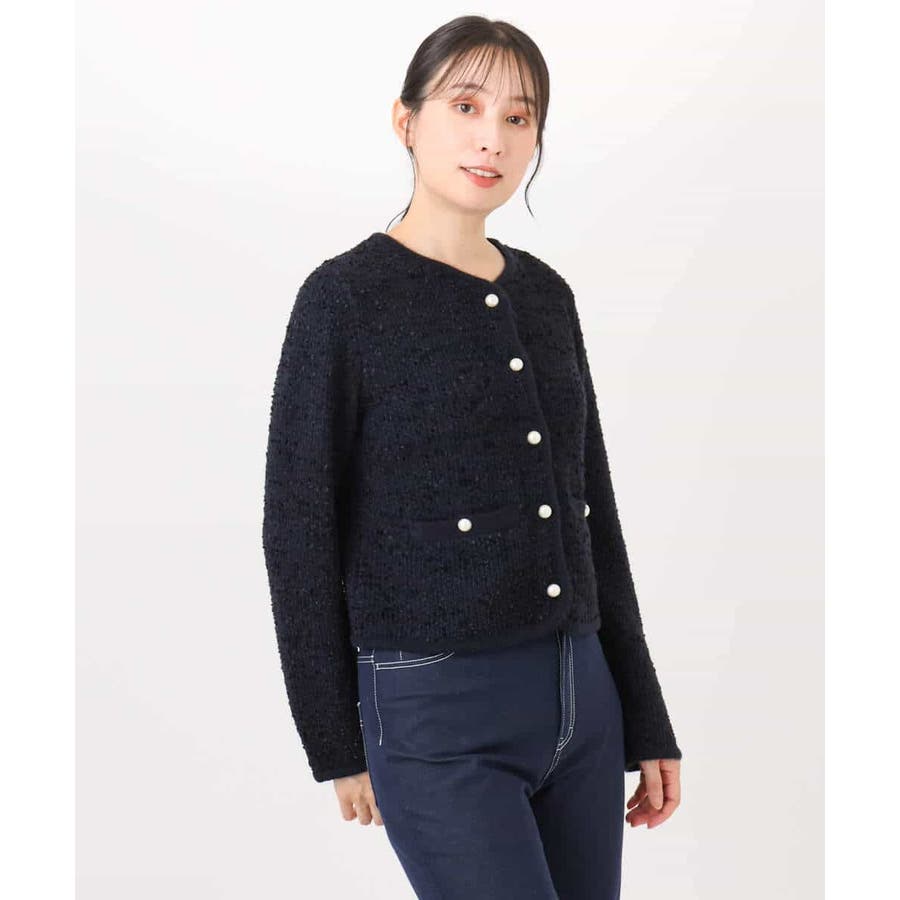さっと気軽に羽織りやすい上品きれい見えなツイードニットジャケット。羽織りとしても良し、釦を留めてプルオーバーとして着こなしても良しなちょうどよく着映えるデザインも嬉しい。