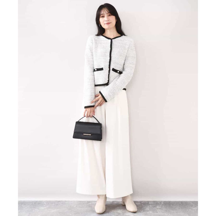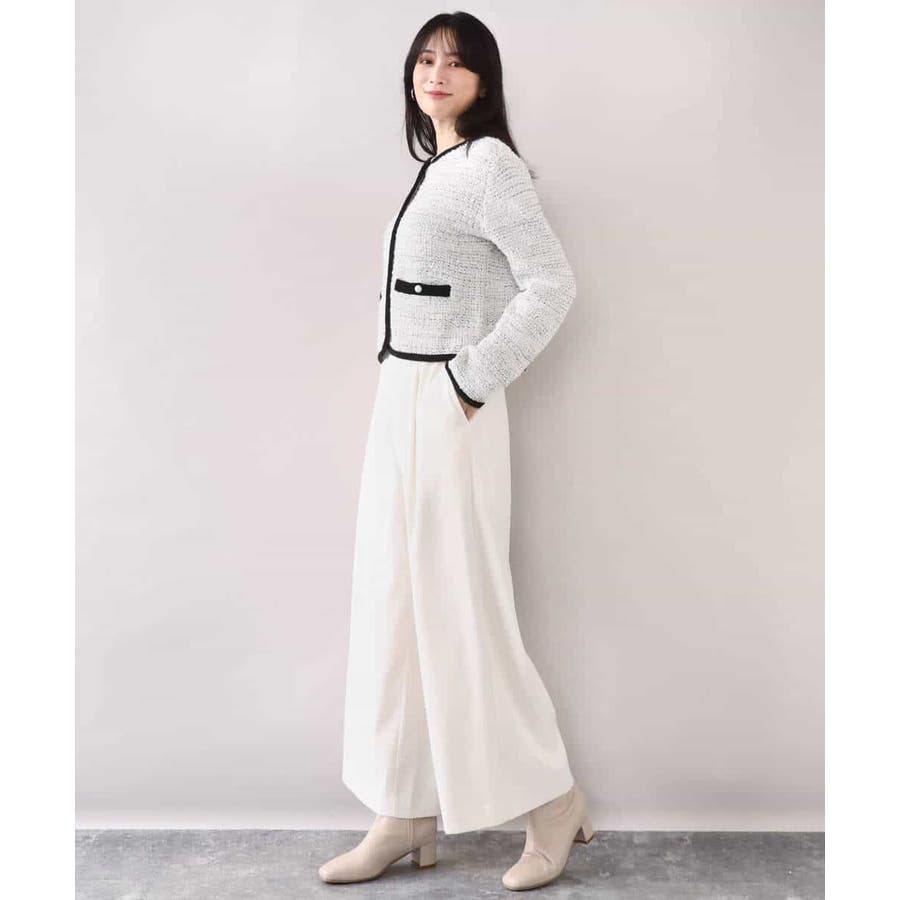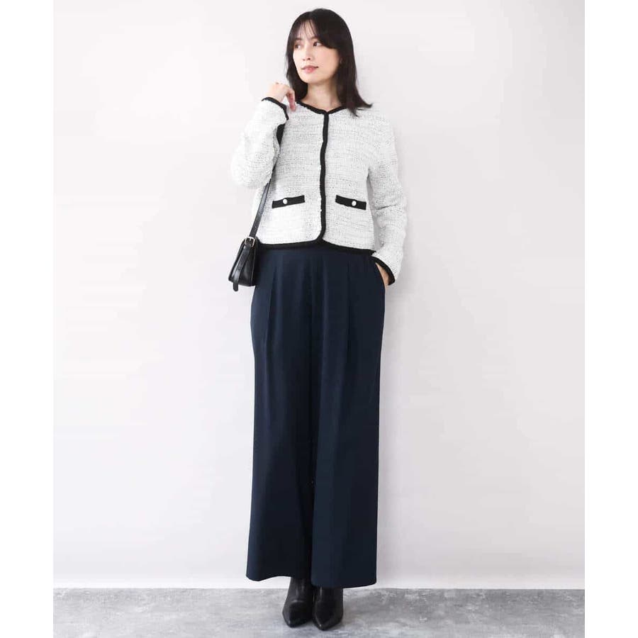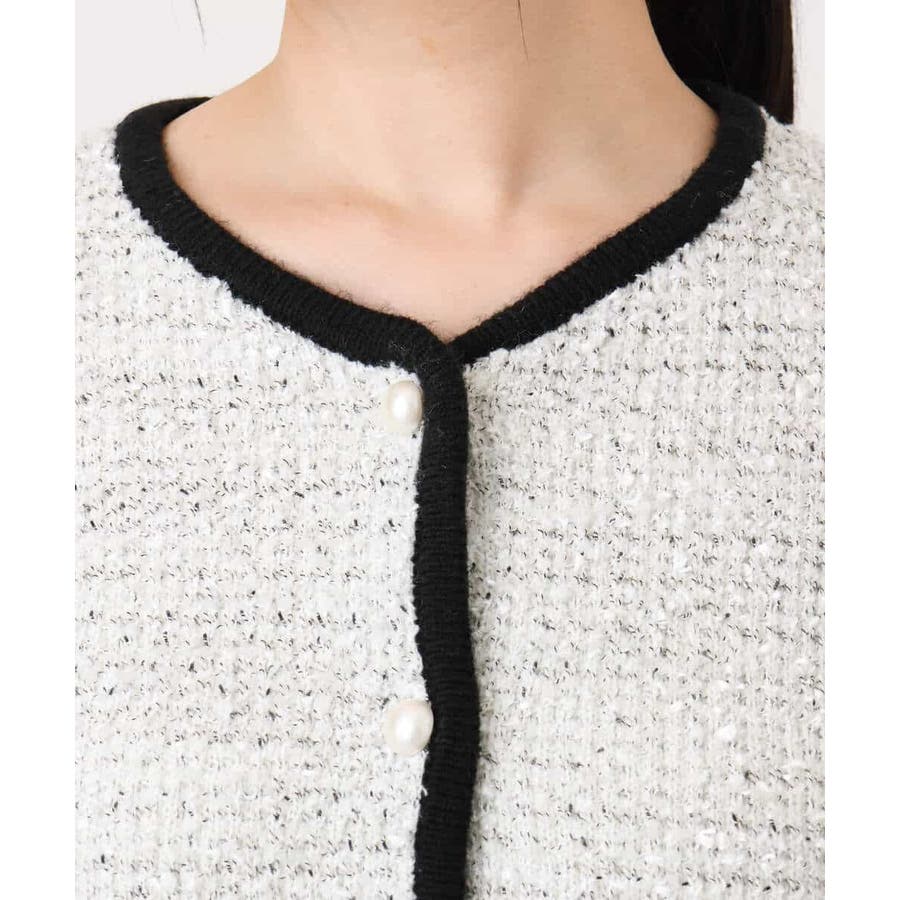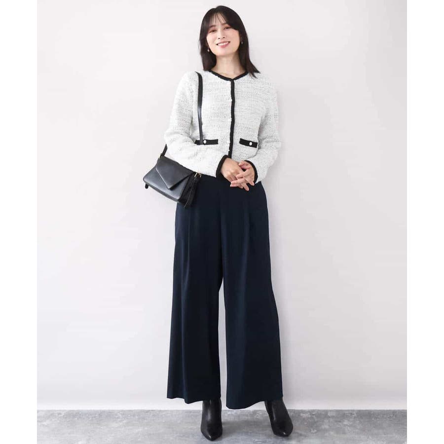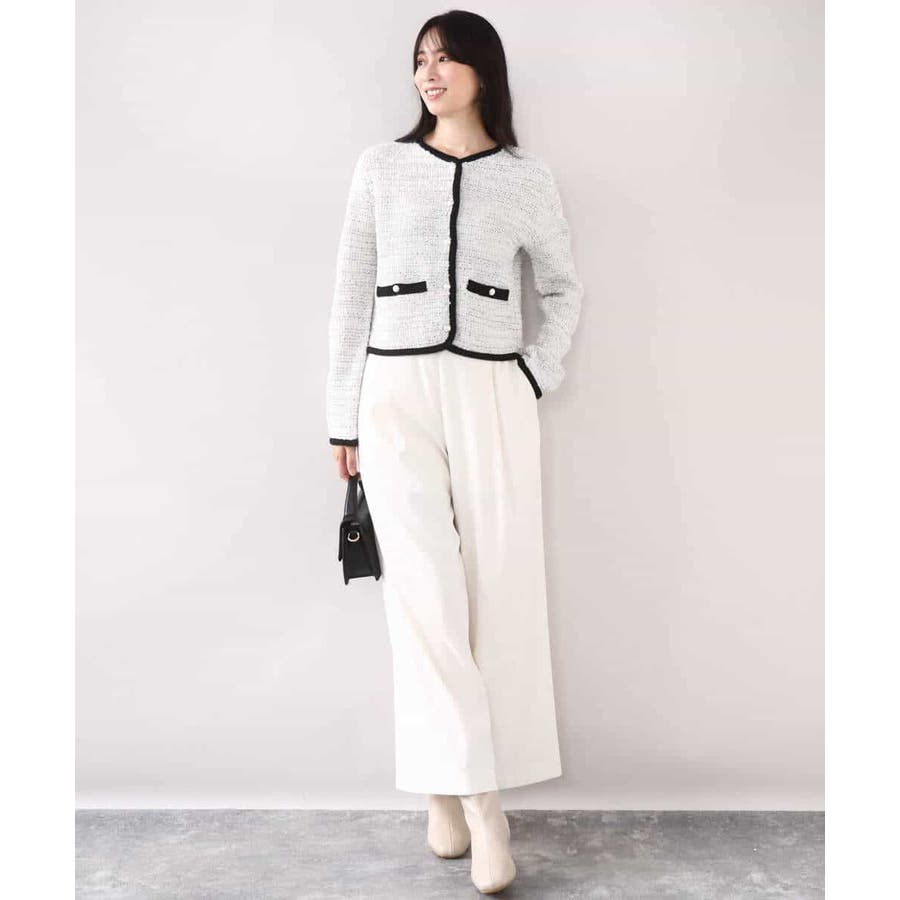 さっと気軽に羽織りやすい上品きれい見えなツイードニットジャケット。羽織りとしても良し、釦を留めてプルオーバーとして着こなしても良しなちょうどよく着映えるデザインも嬉しい。