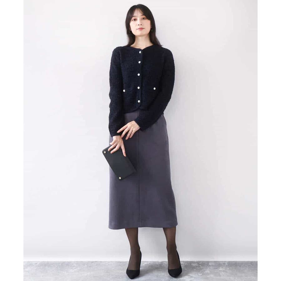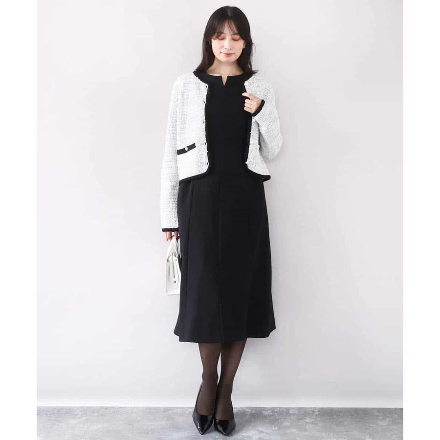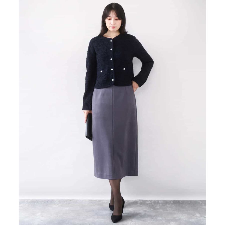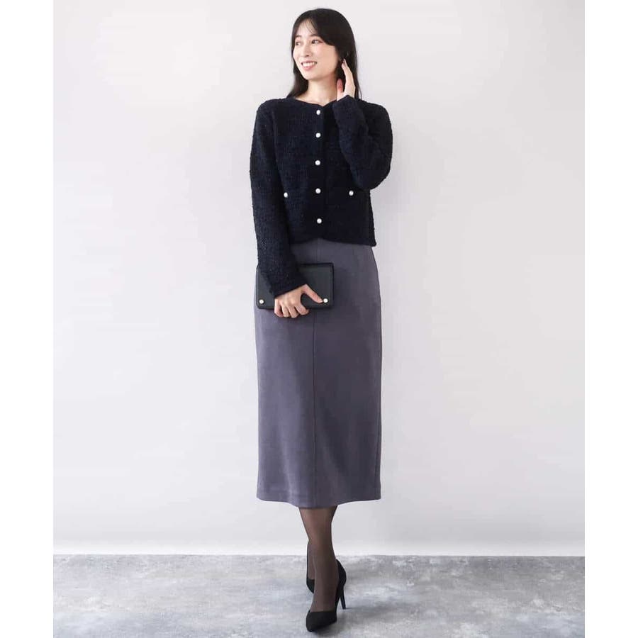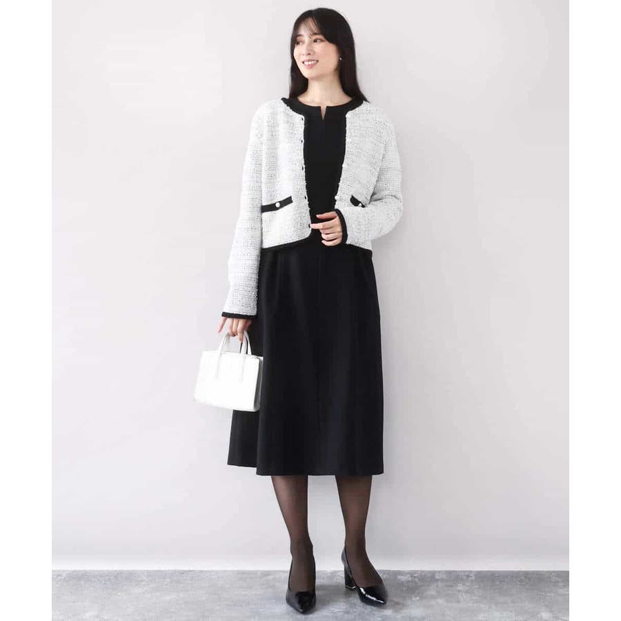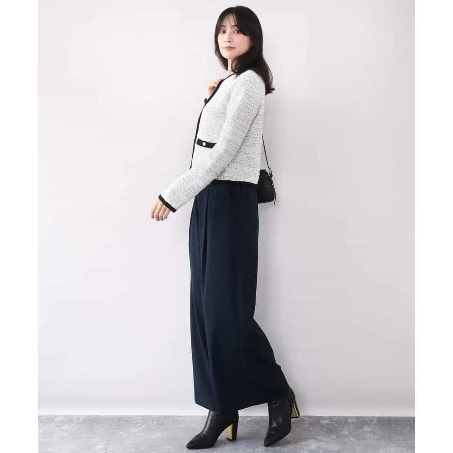 さっと気軽に羽織りやすい上品きれい見えなツイードニットジャケット。羽織りとしても良し、釦を留めてプルオーバーとして着こなしても良しなちょうどよく着映えるデザインも嬉しい。