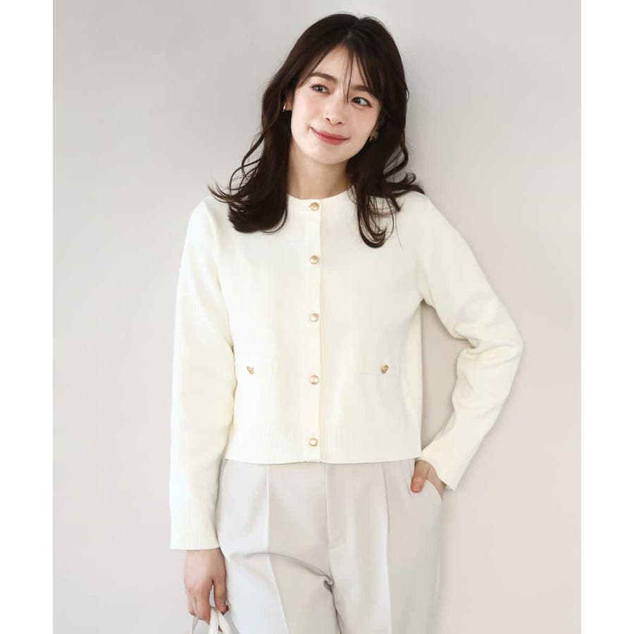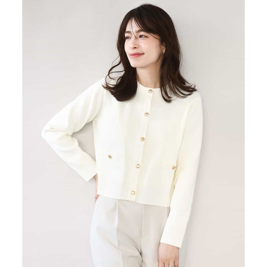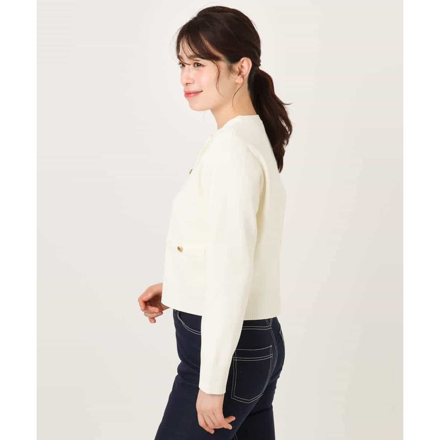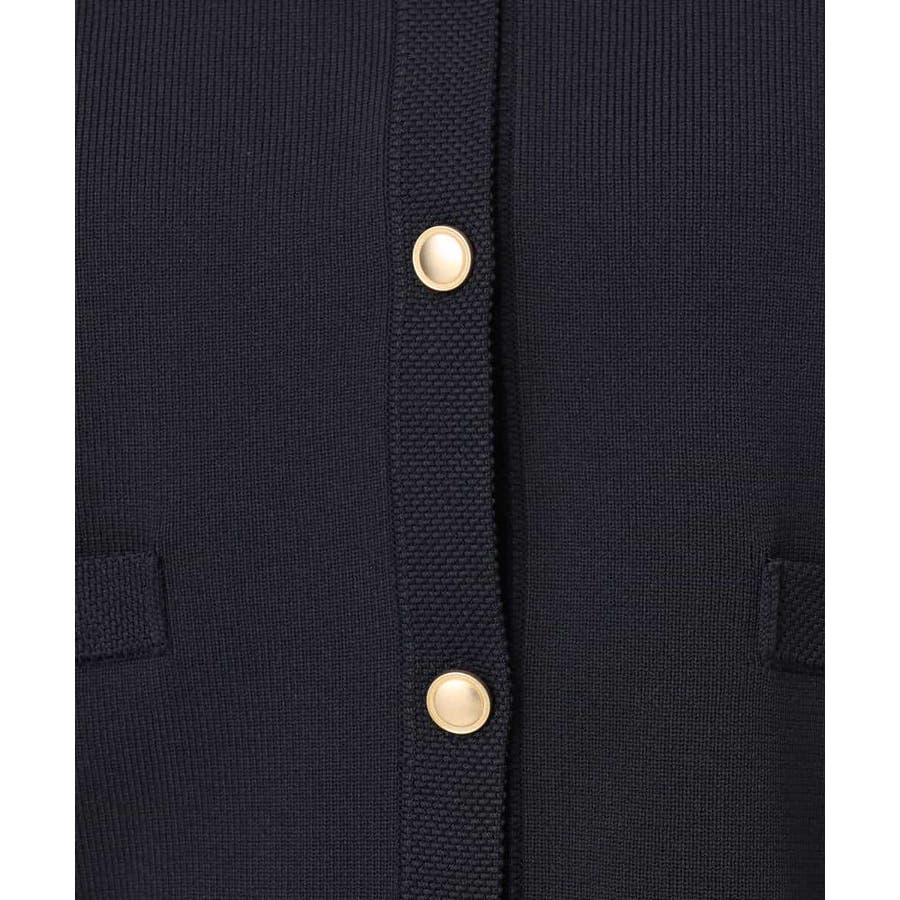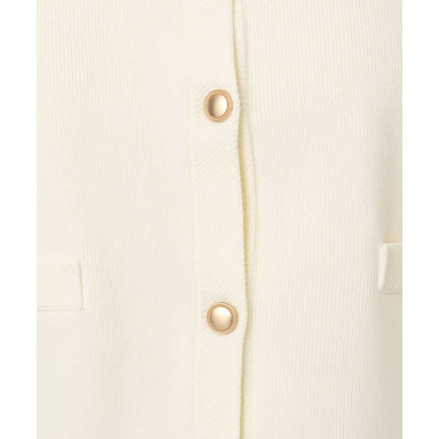 衿や前立て、飾りポケット部分の凹凸編地のトリミングと艶消しのゴールド釦が華やかな印象のニットカーディガン。ジャケットライクなデザインできれいめに着こなせる一枚です。
