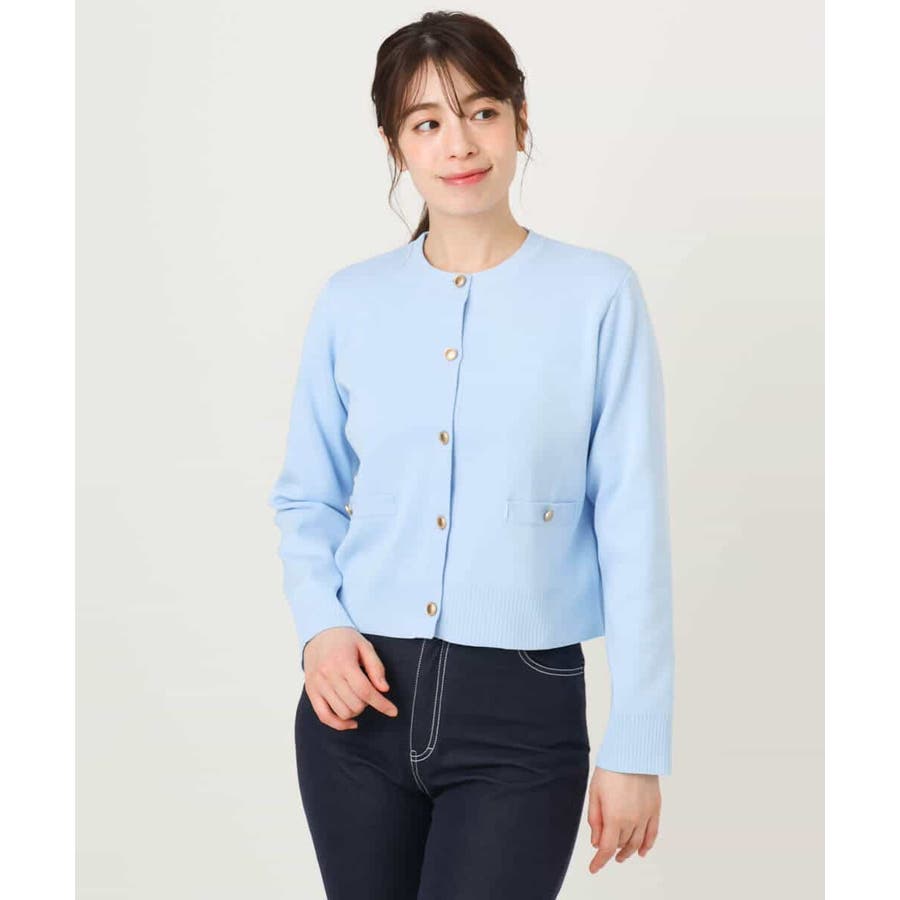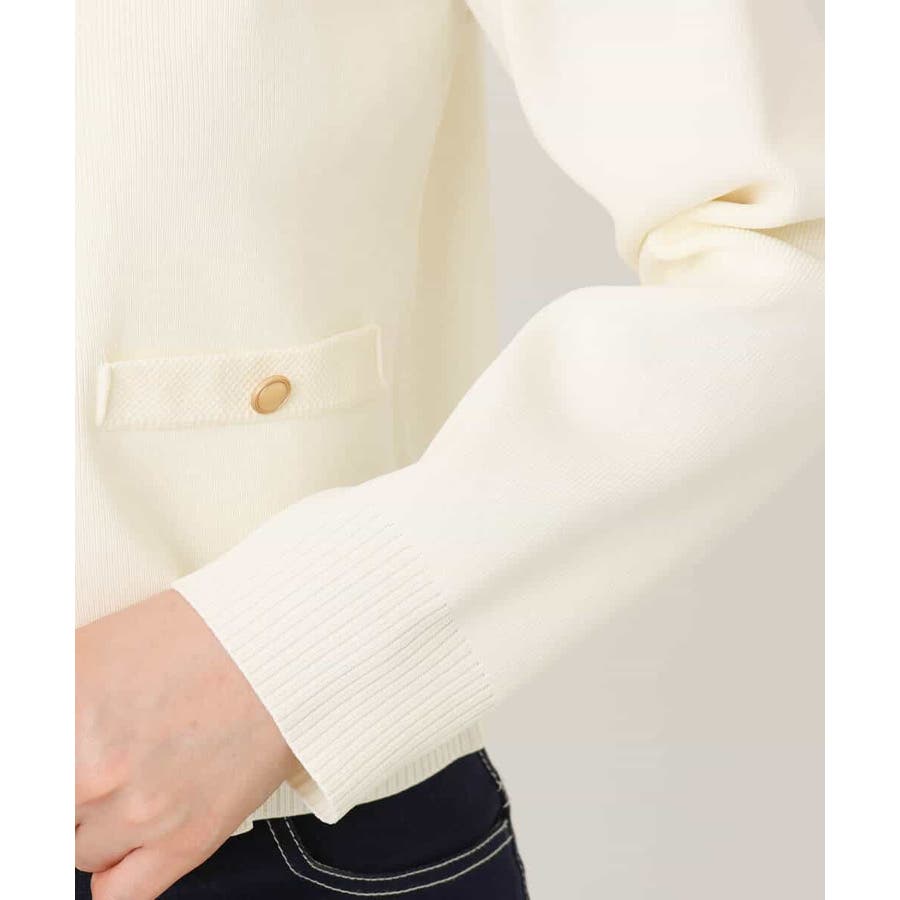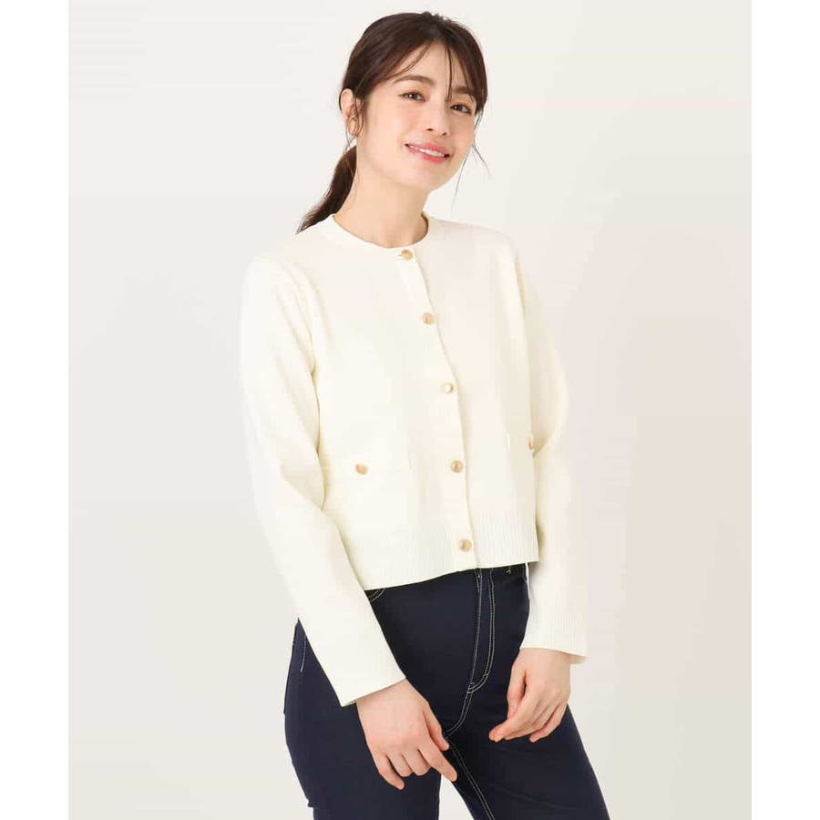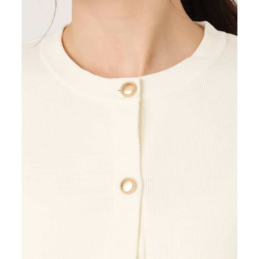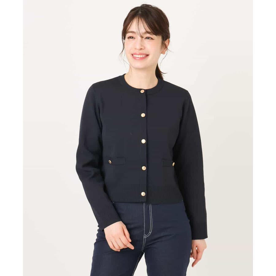 衿や前立て、飾りポケット部分の凹凸編地のトリミングと艶消しのゴールド釦が華やかな印象のニットカーディガン。ジャケットライクなデザインできれいめに着こなせる一枚です。