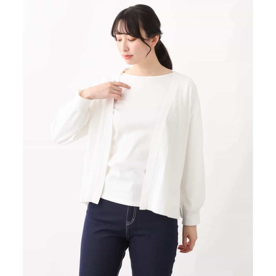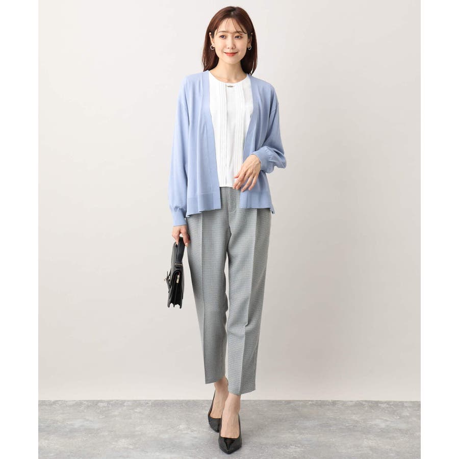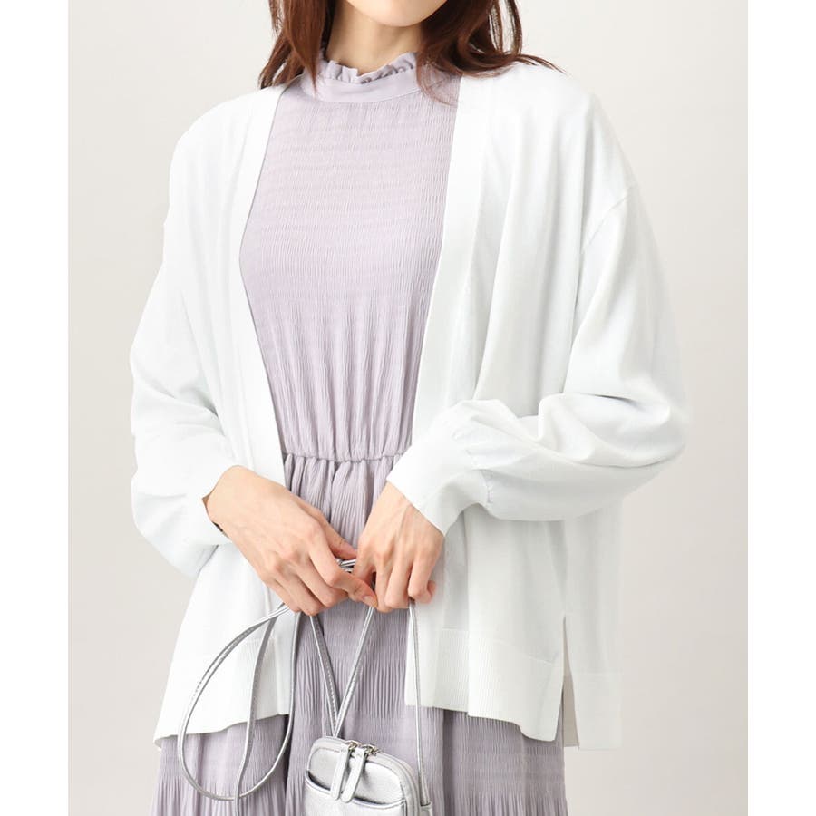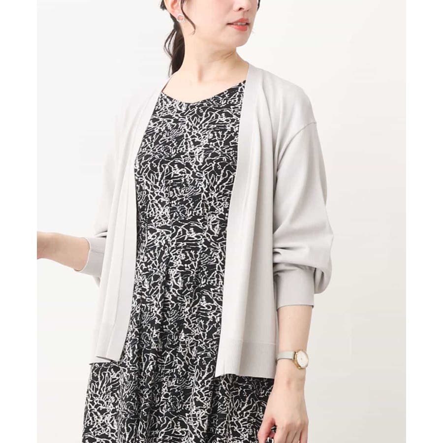 コクーンスリーブの着流しカーディガン。袖はタックアップしてボリュームを出し、こなれた印象で着こなすのがおすすめです。