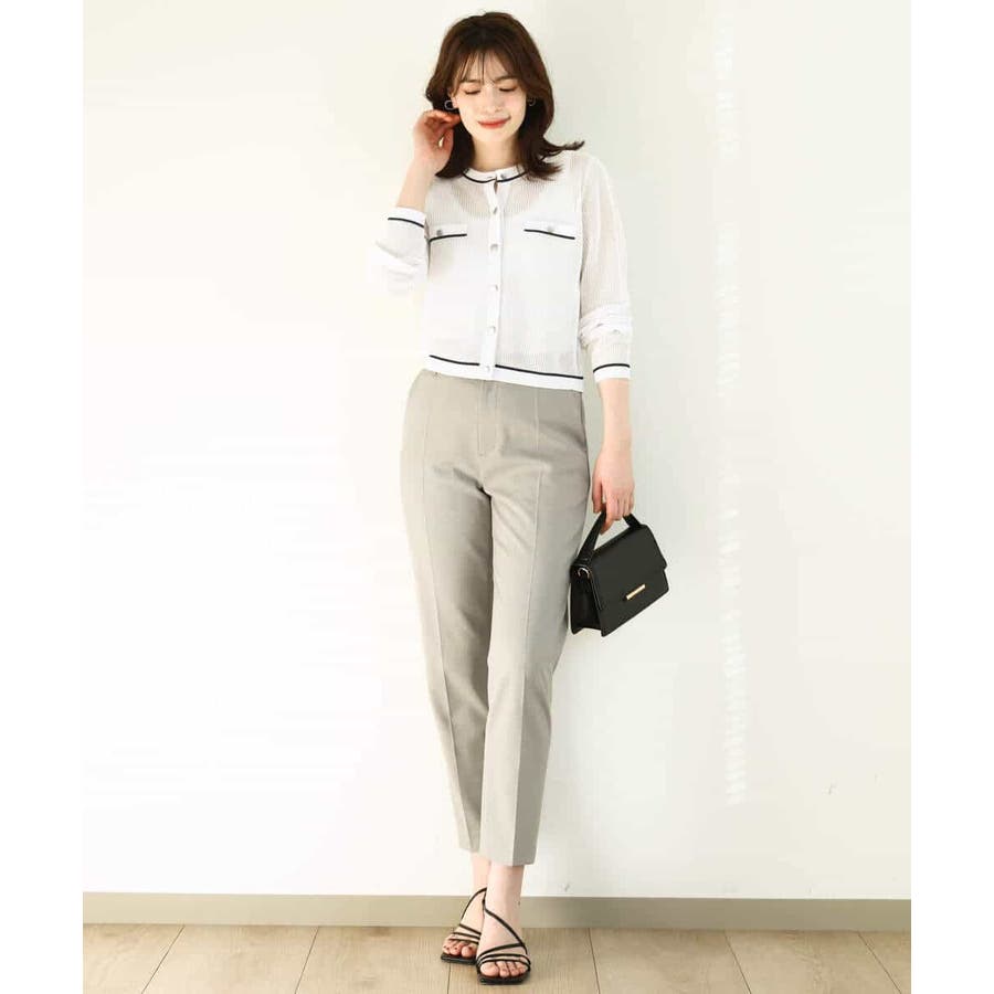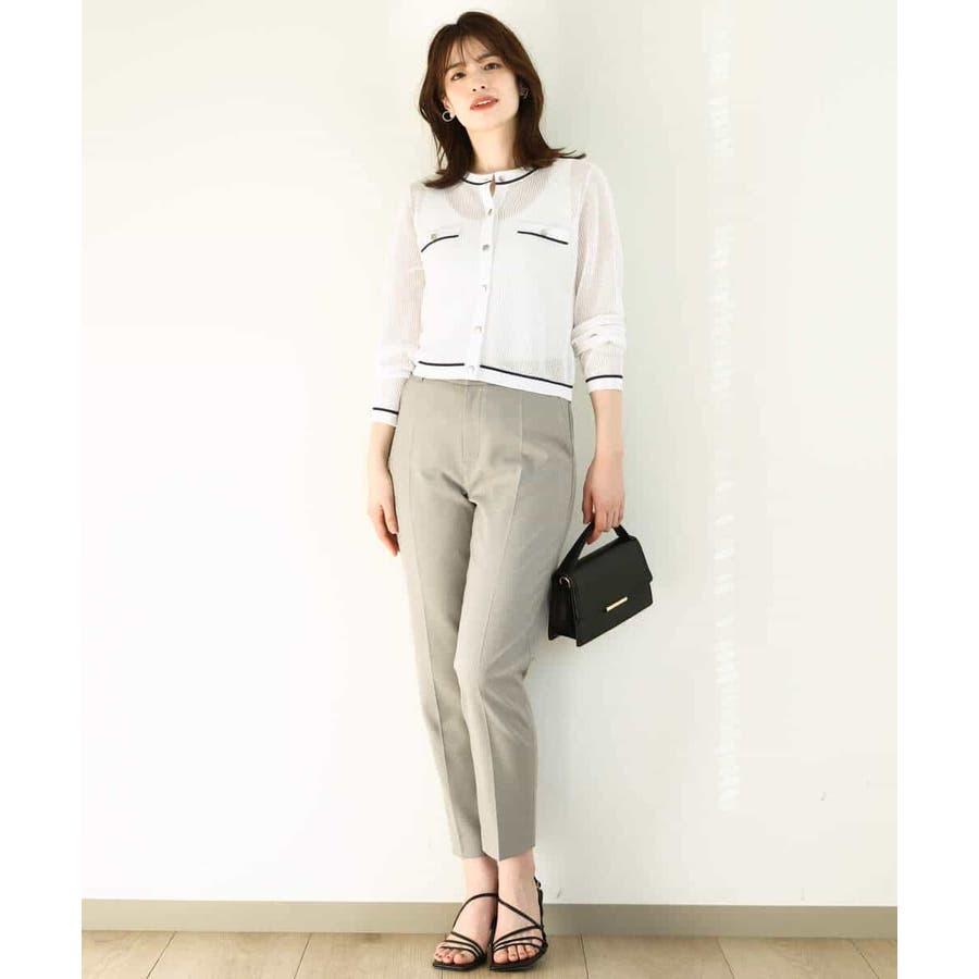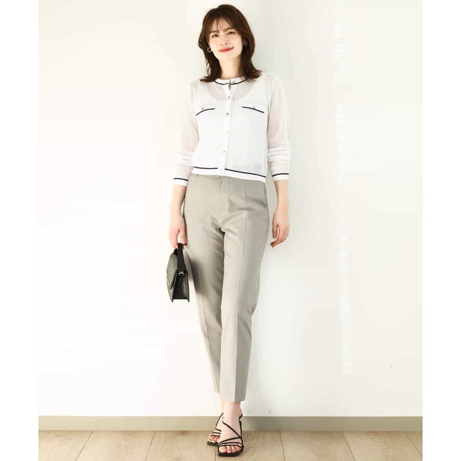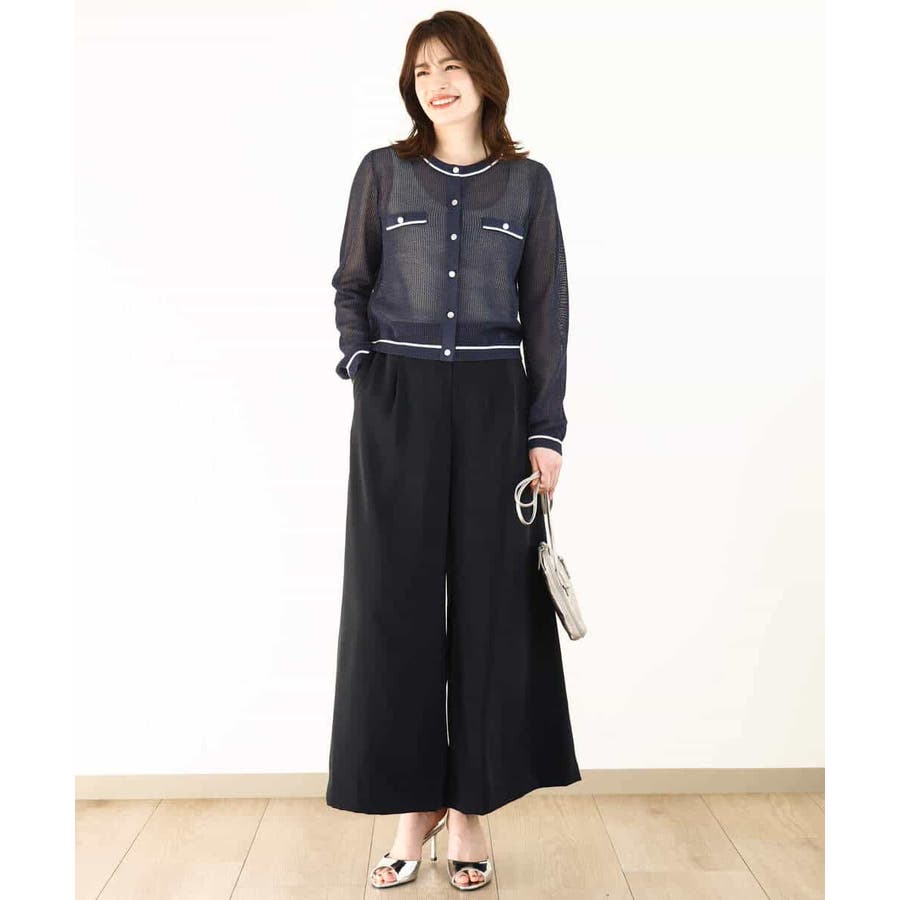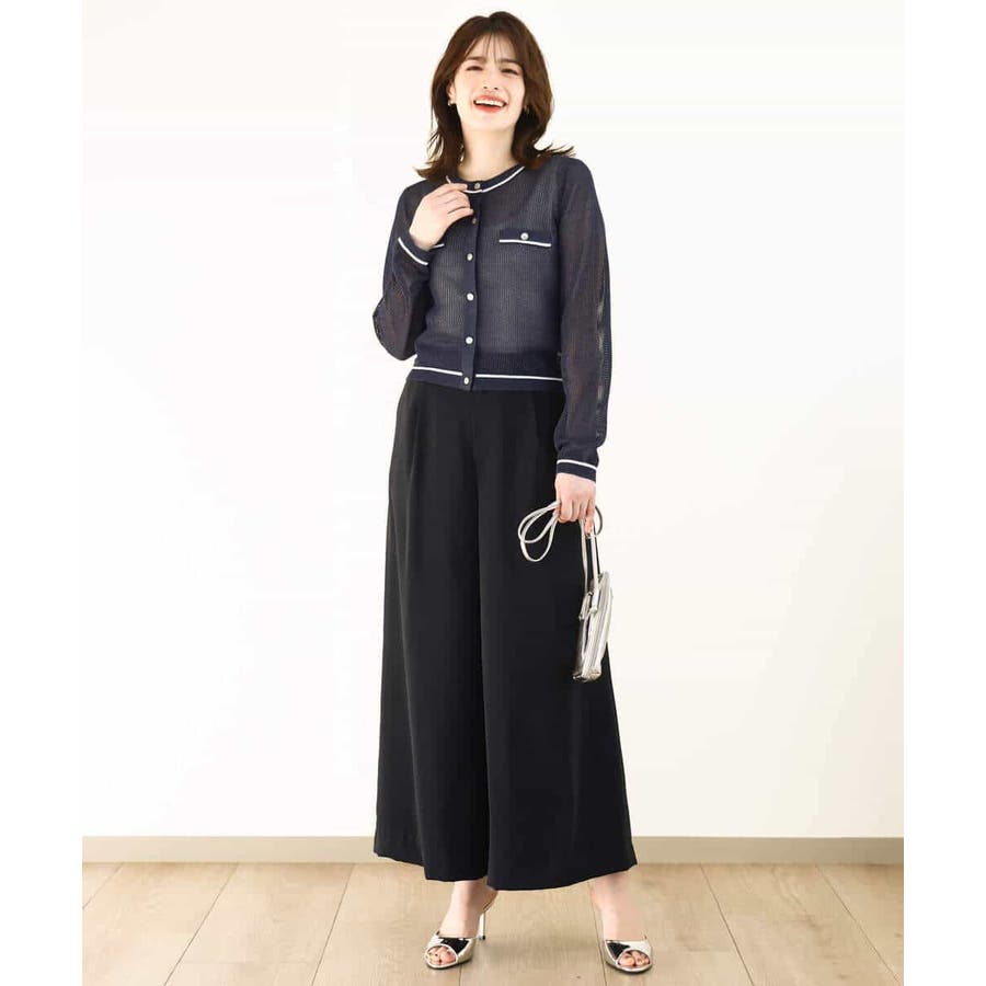 釦をすべて閉じてプルオーバーとしての着こなしがトレンドライクでおすすめ。透け感があるので、軽く羽織りやすく、夏場の羽織りものとしても活躍してくれます。