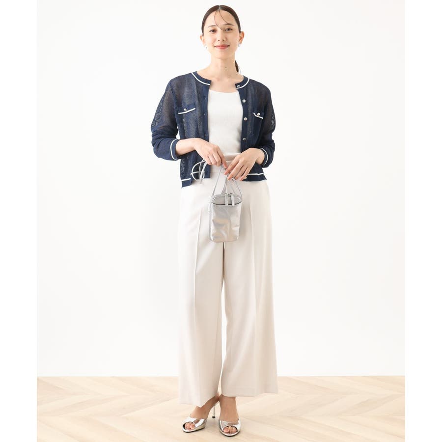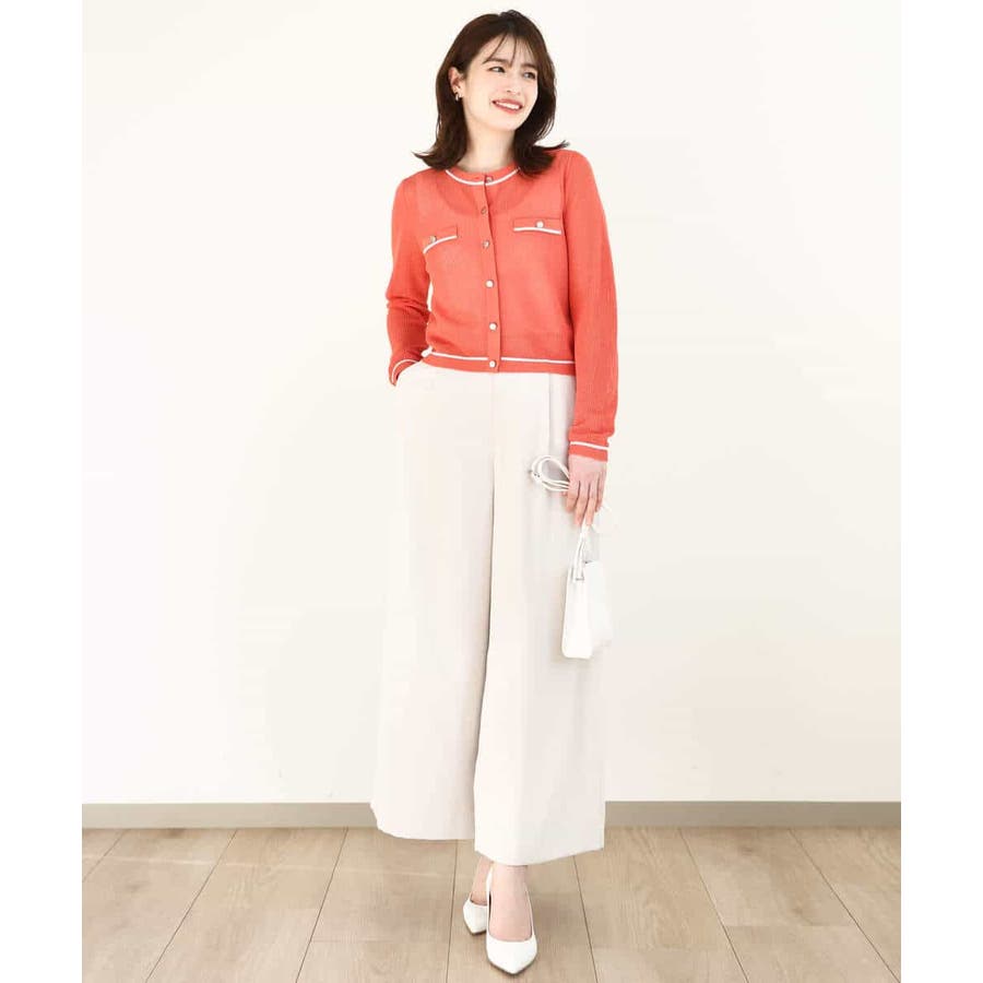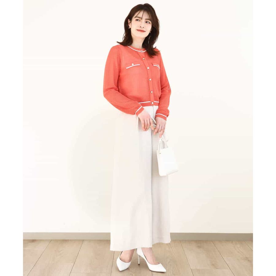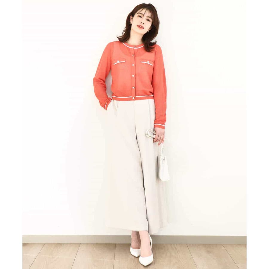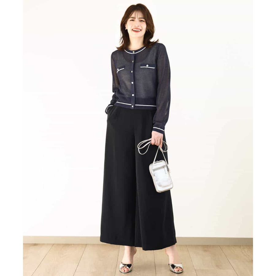 釦をすべて閉じてプルオーバーとしての着こなしがトレンドライクでおすすめ。透け感があるので、軽く羽織りやすく、夏場の羽織りものとしても活躍してくれます。