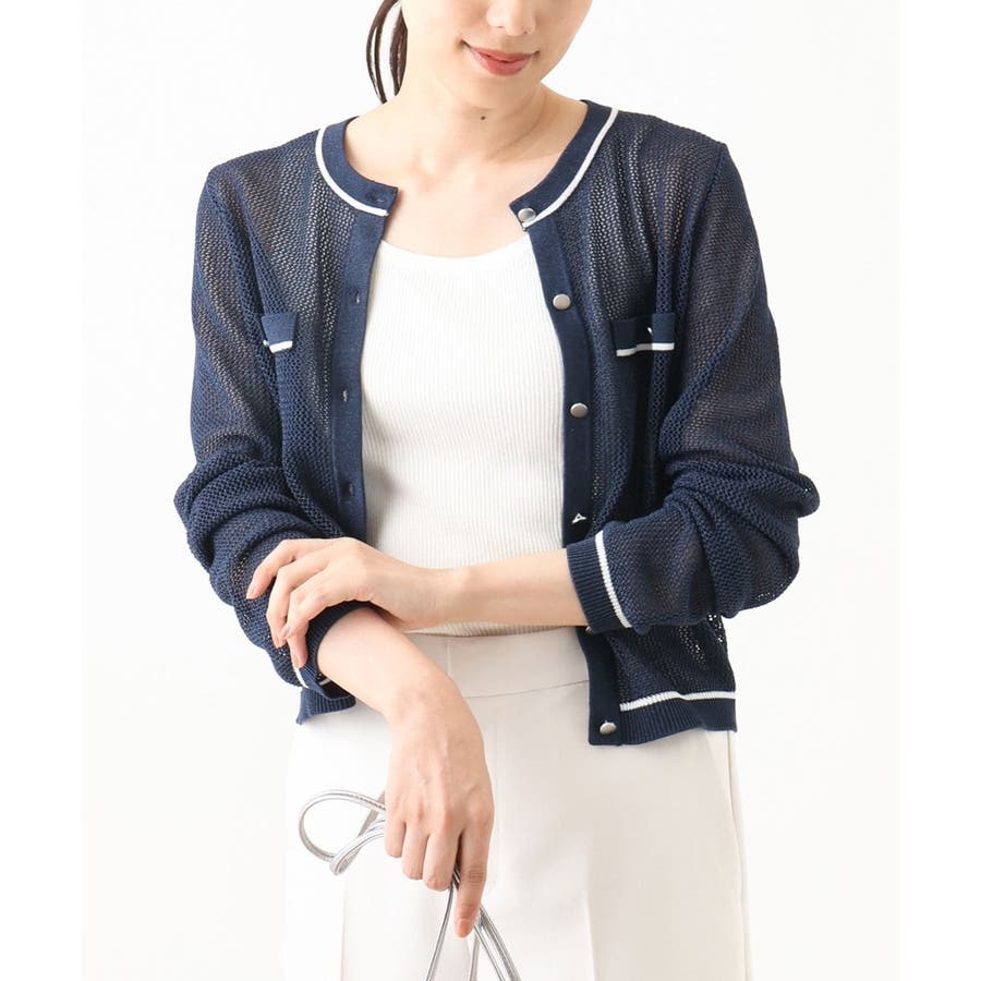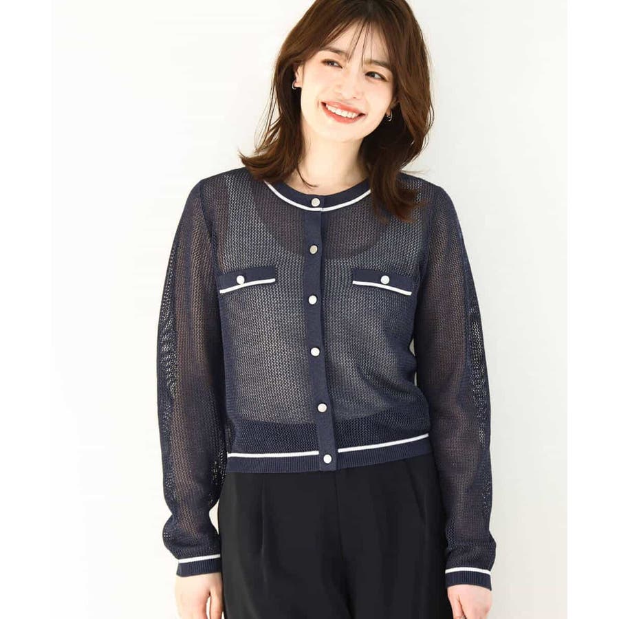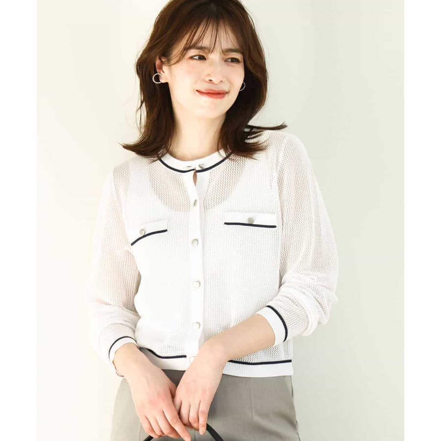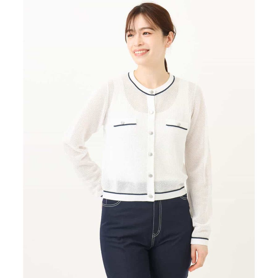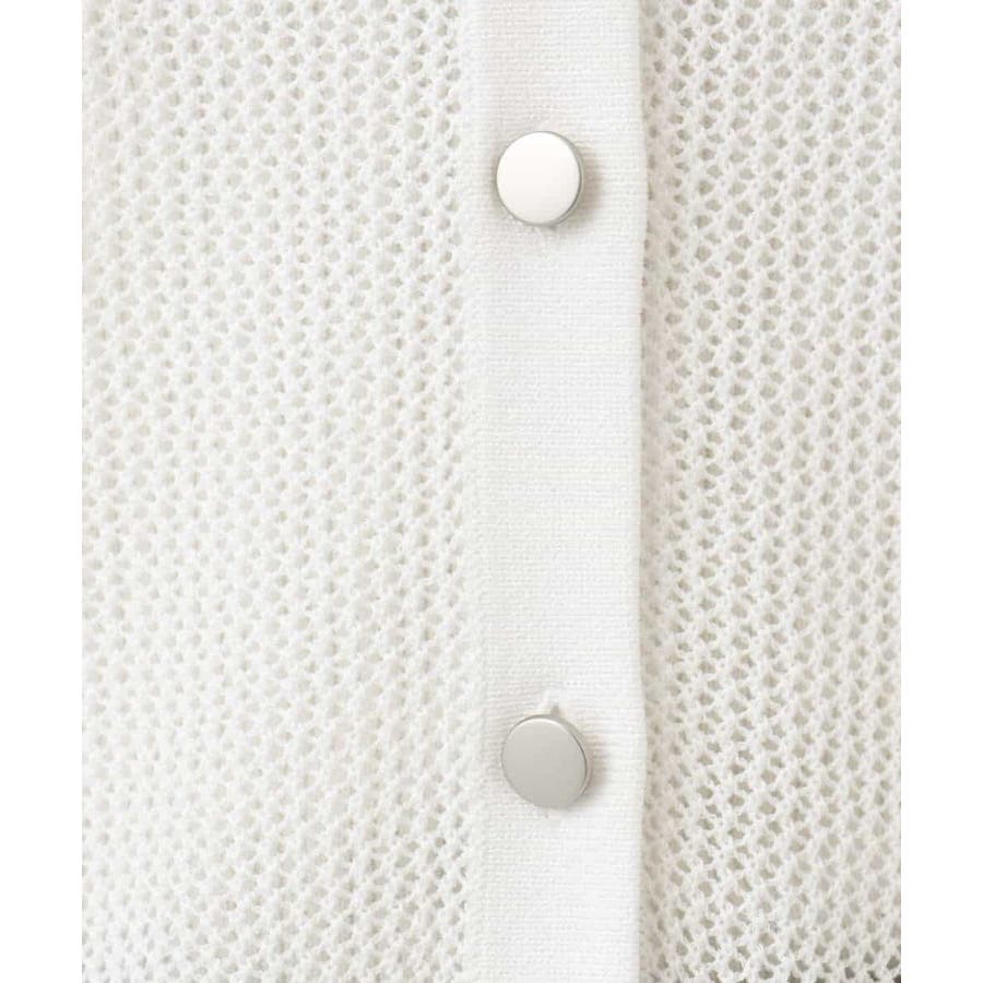 適度な透け感が上品なメッシュ柄で編み立てたニットカーディガン。ジャケットライクな配色使いとメタル調釦がアクセントで着こなせます。