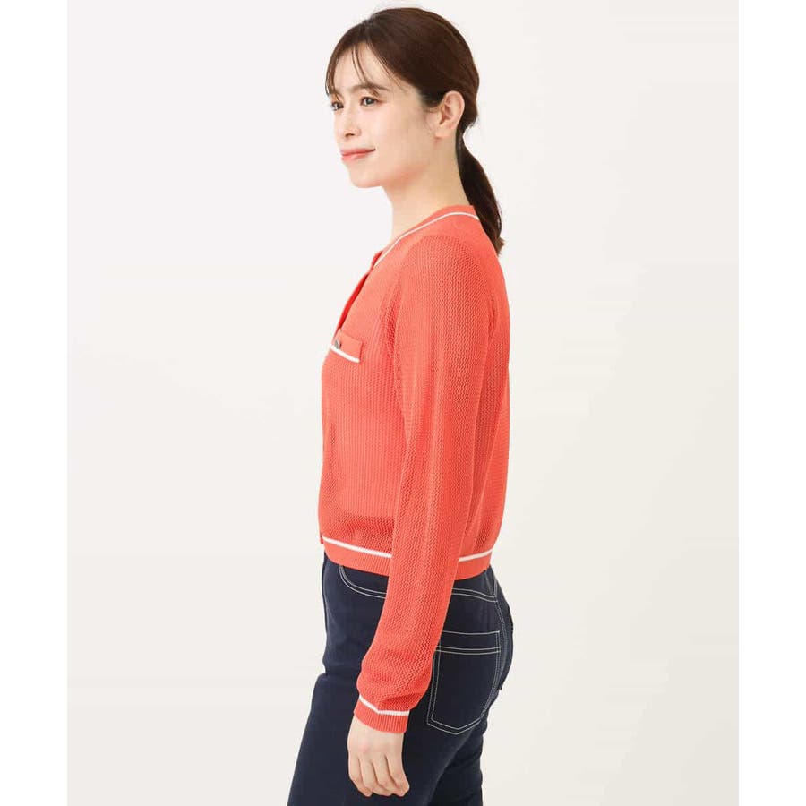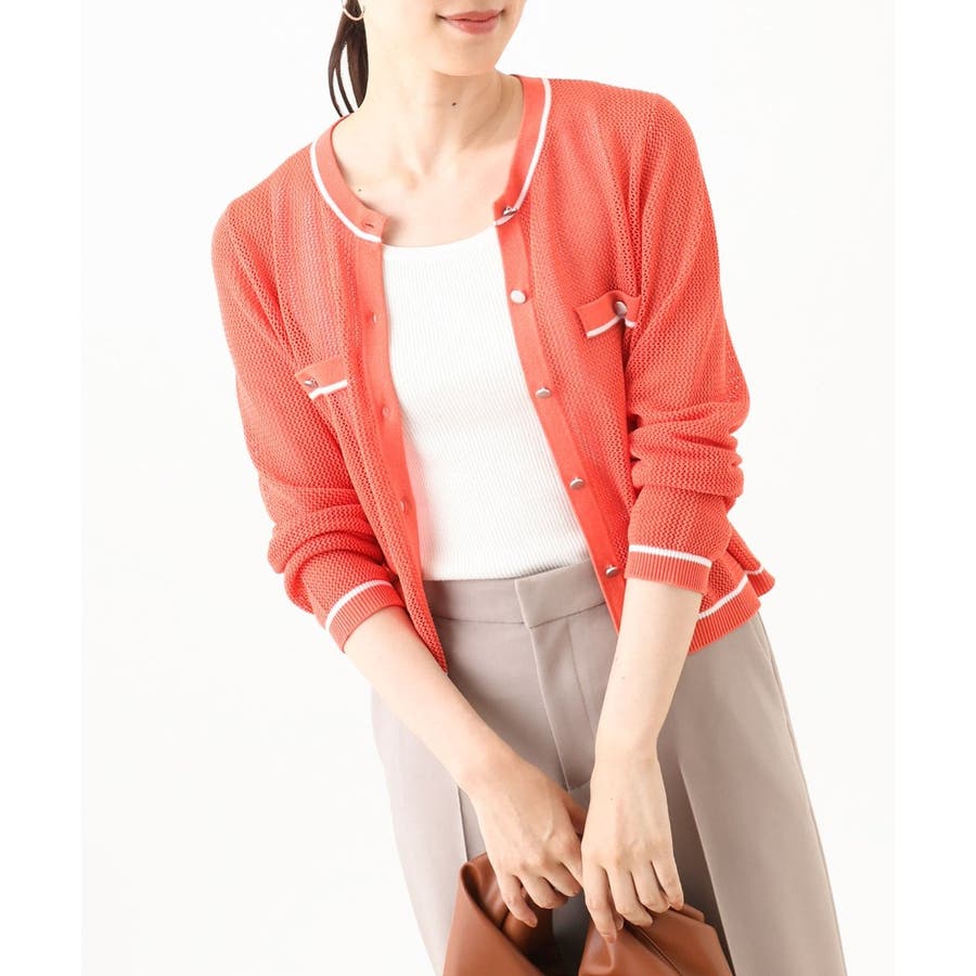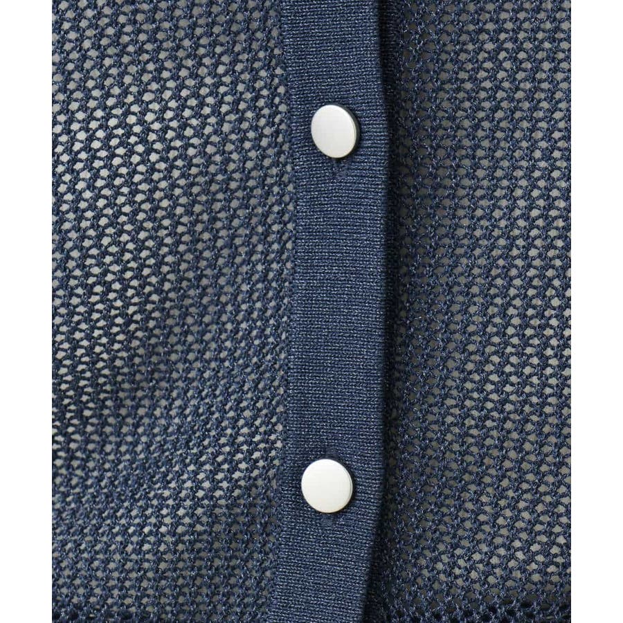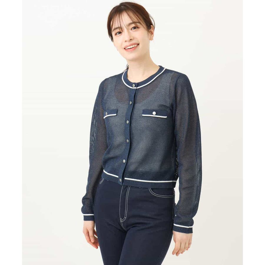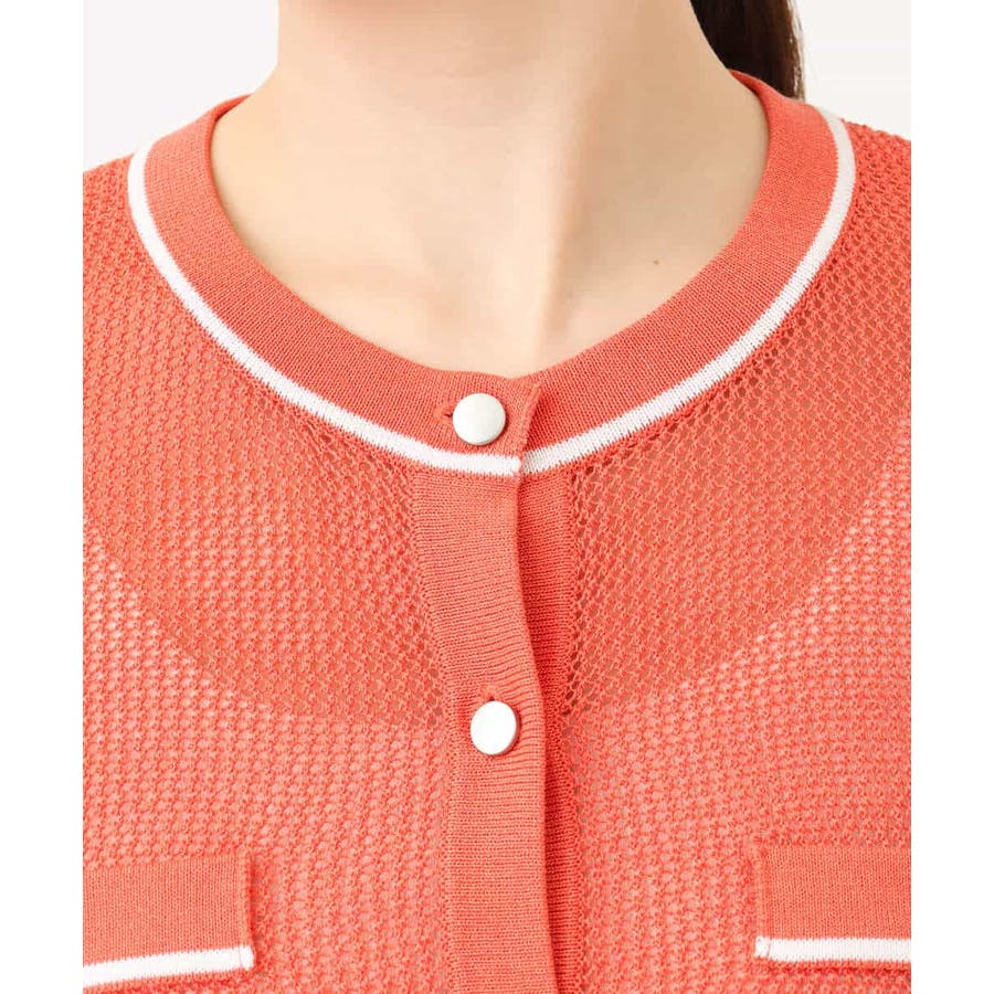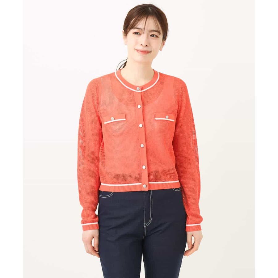 適度な透け感が上品なメッシュ柄で編み立てたニットカーディガン。ジャケットライクな配色使いとメタル調釦がアクセントで着こなせます。