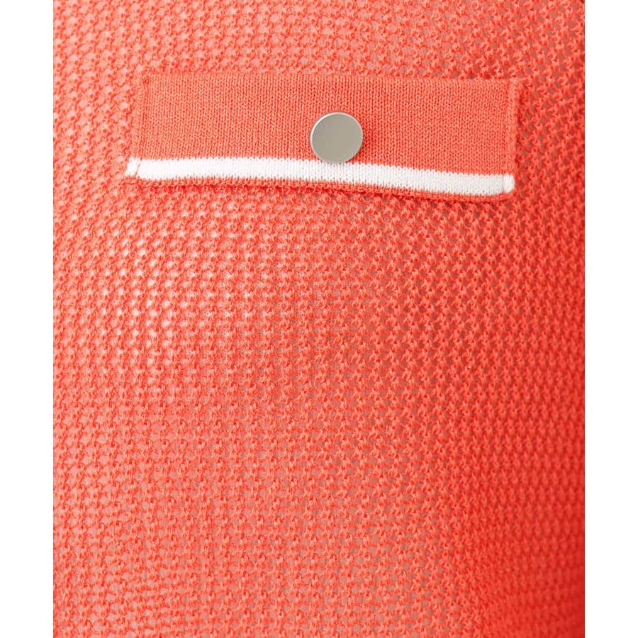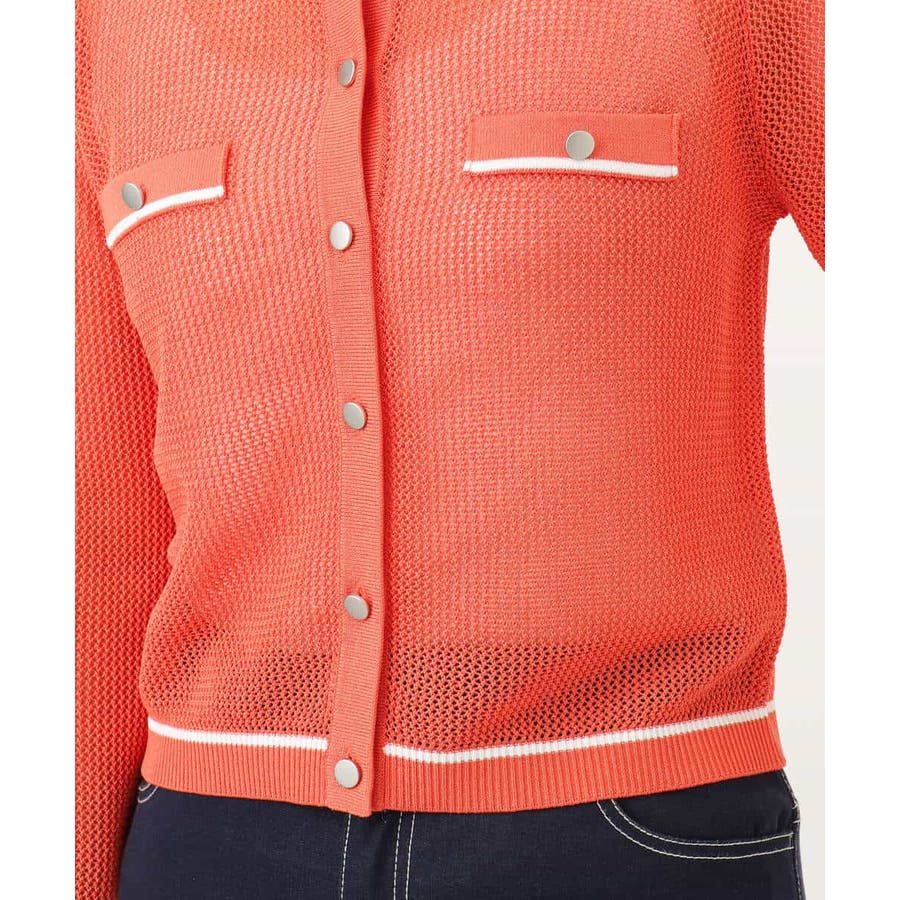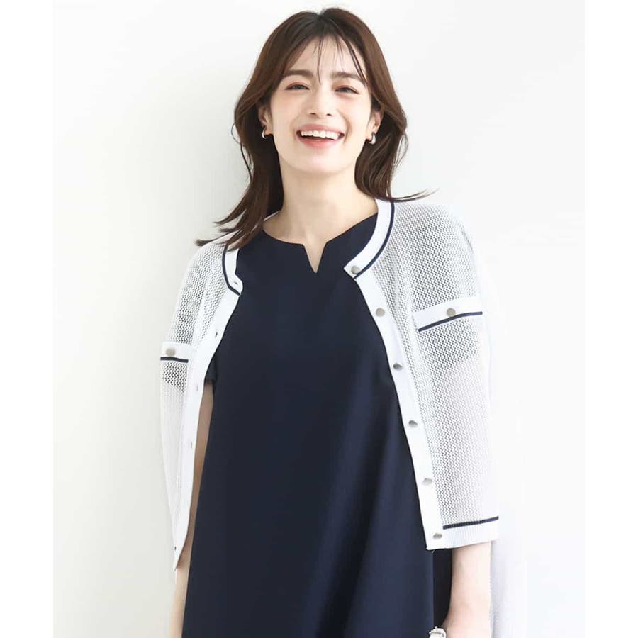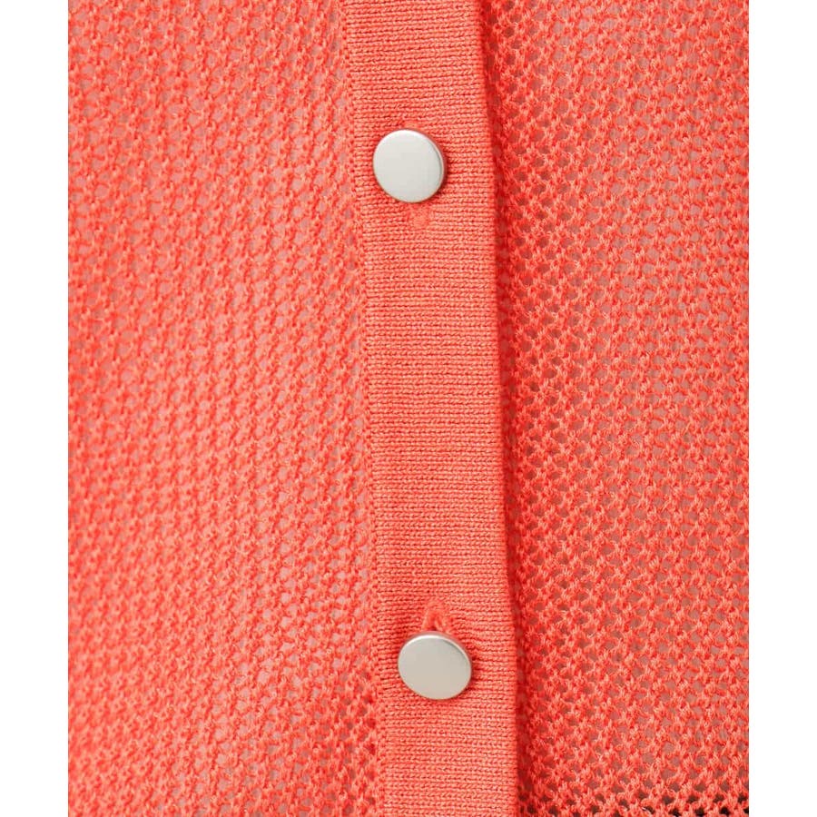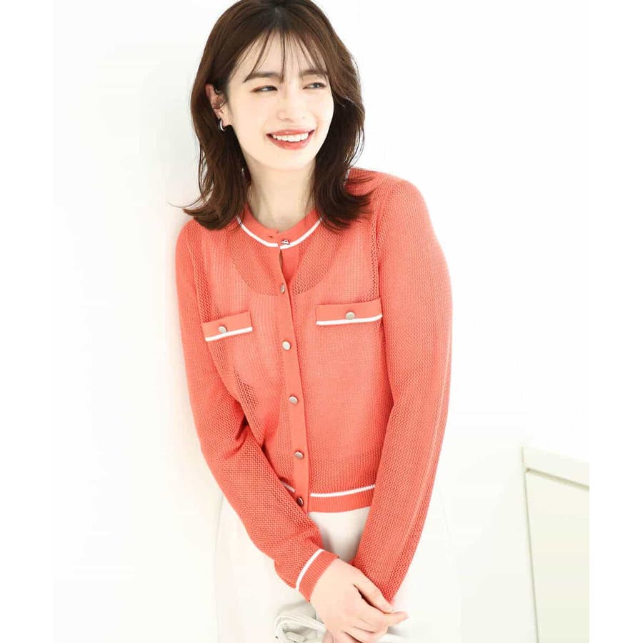 適度な透け感が上品なメッシュ柄で編み立てたニットカーディガン。ジャケットライクな配色使いとメタル調釦がアクセントで着こなせます。