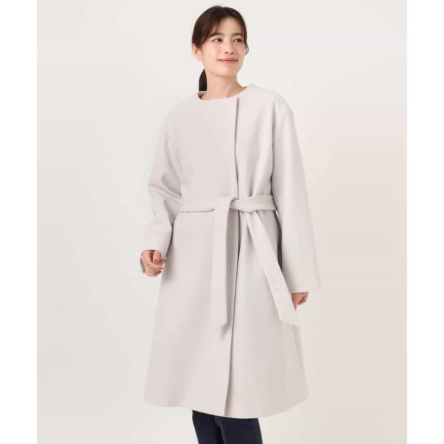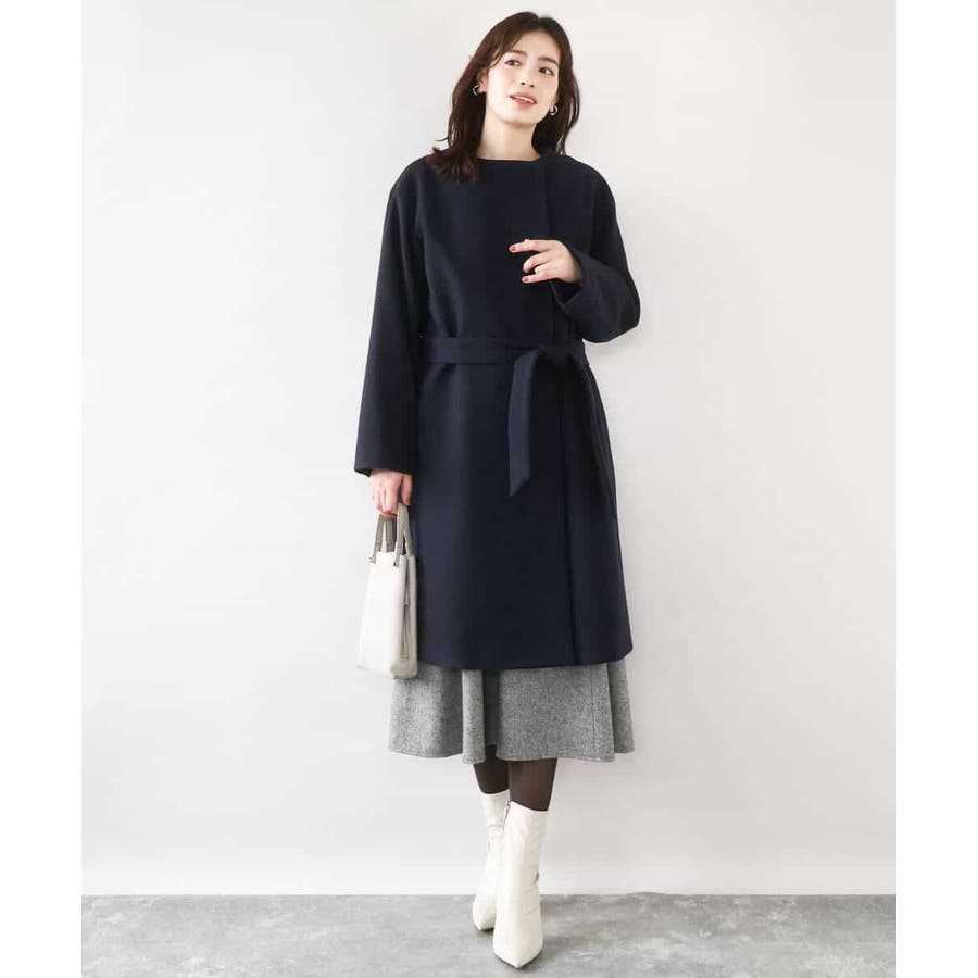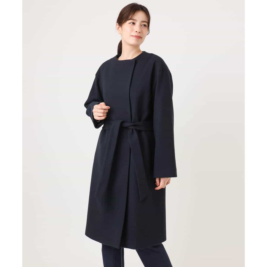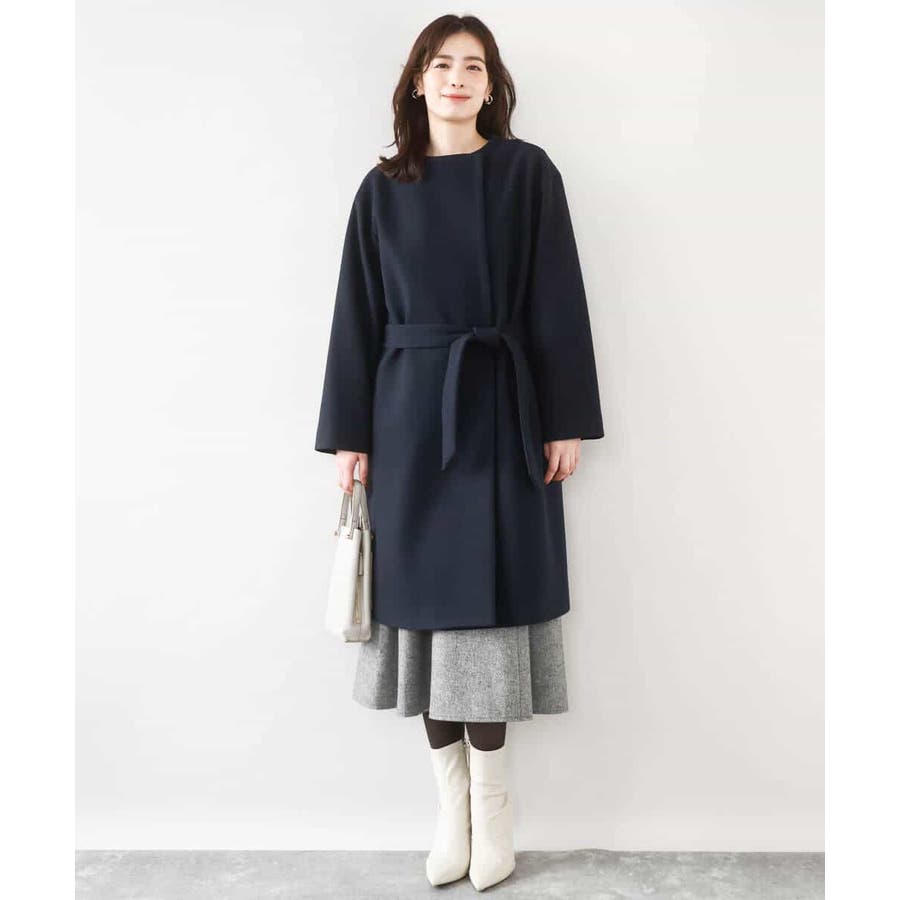 ノーカラーでシンプルなデザインで仕上げたウール混コート。フロントを開けて着ても羽織るだけで決まる便利なデザインはお仕事などのきれいめシーンに最適です。ベルト付きですが、ベルトループがないデザインなので、ベルトを外してすっきりとした着こなしも楽しめます。