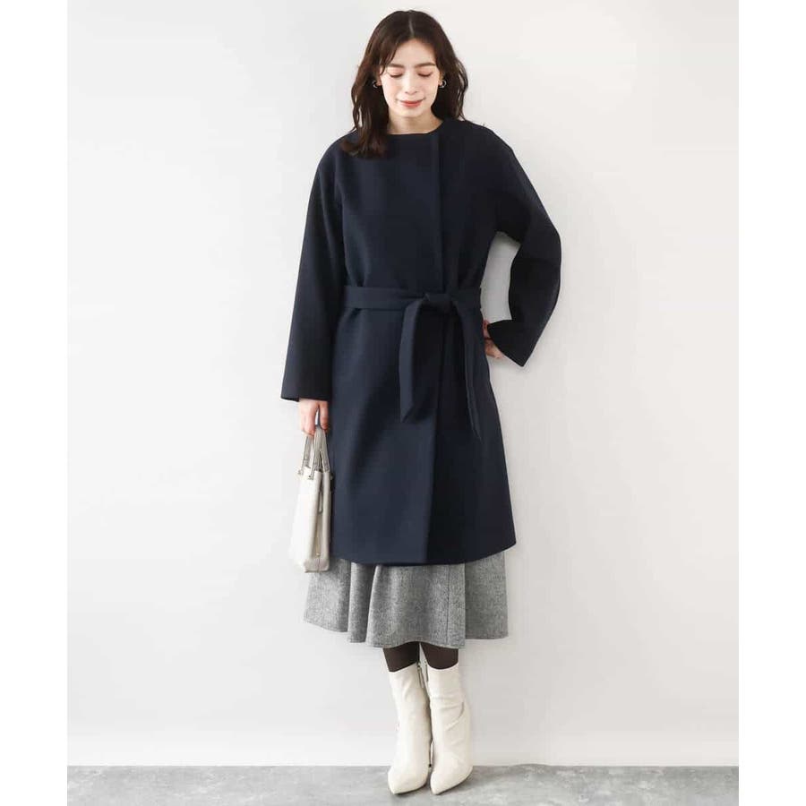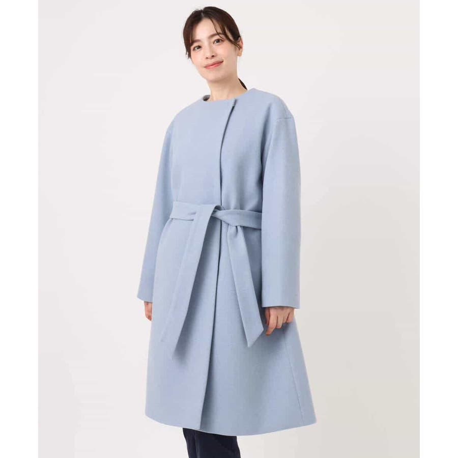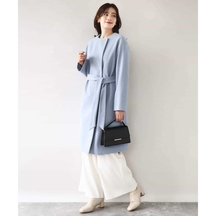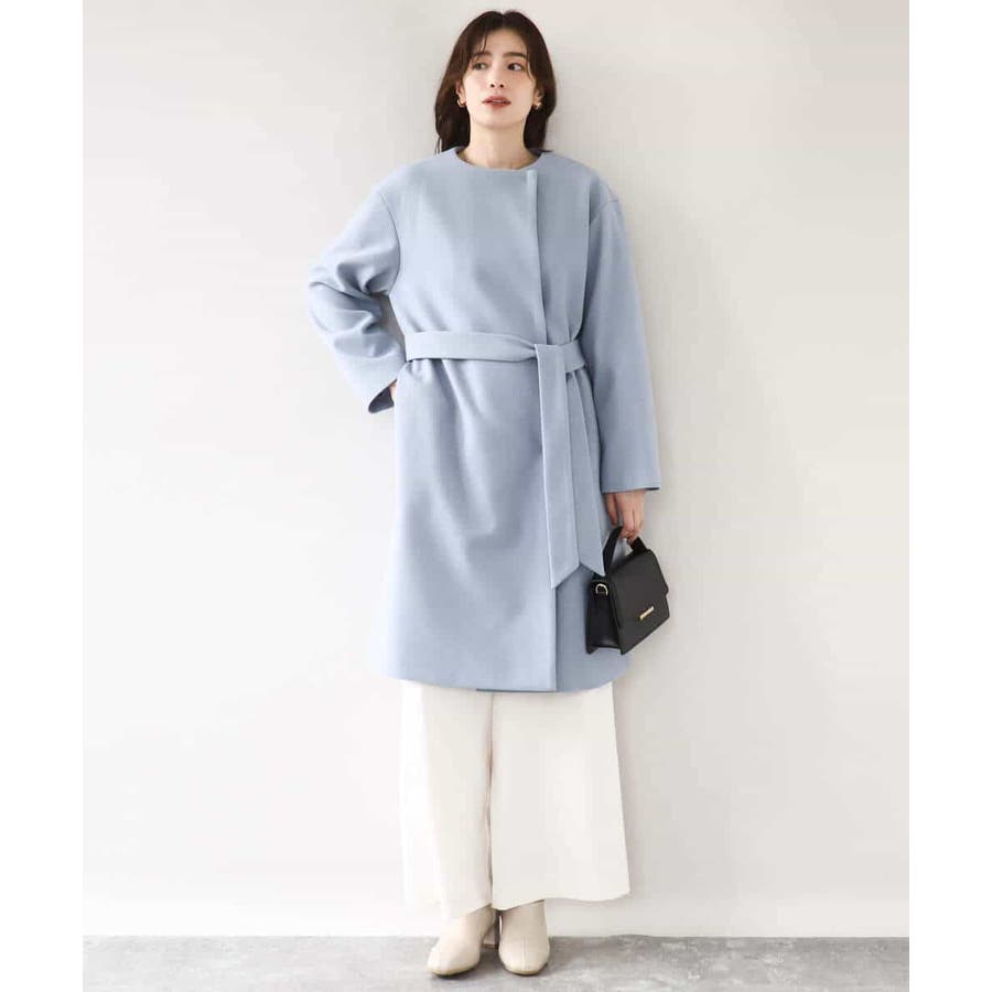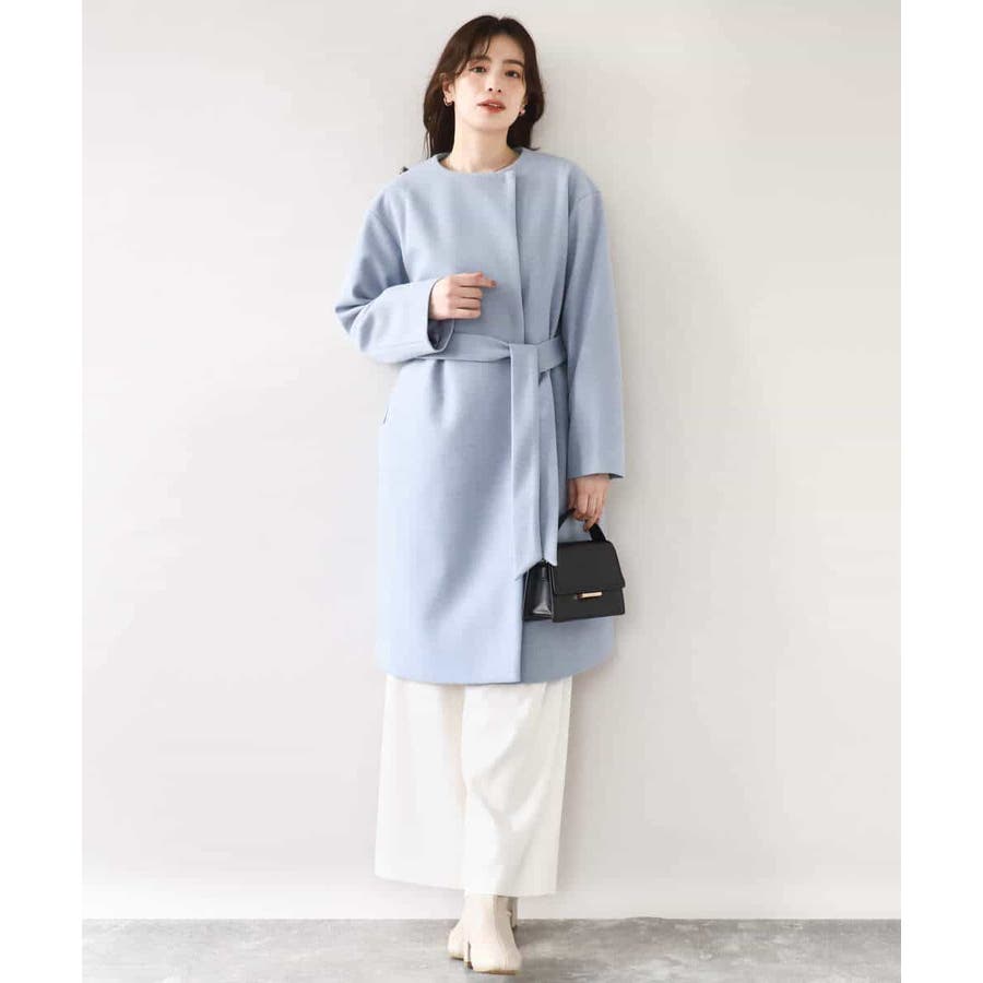 ノーカラーでシンプルなデザインで仕上げたウール混コート。フロントを開けて着ても羽織るだけで決まる便利なデザインはお仕事などのきれいめシーンに最適です。ベルト付きですが、ベルトループがないデザインなので、ベルトを外してすっきりとした着こなしも楽しめます。