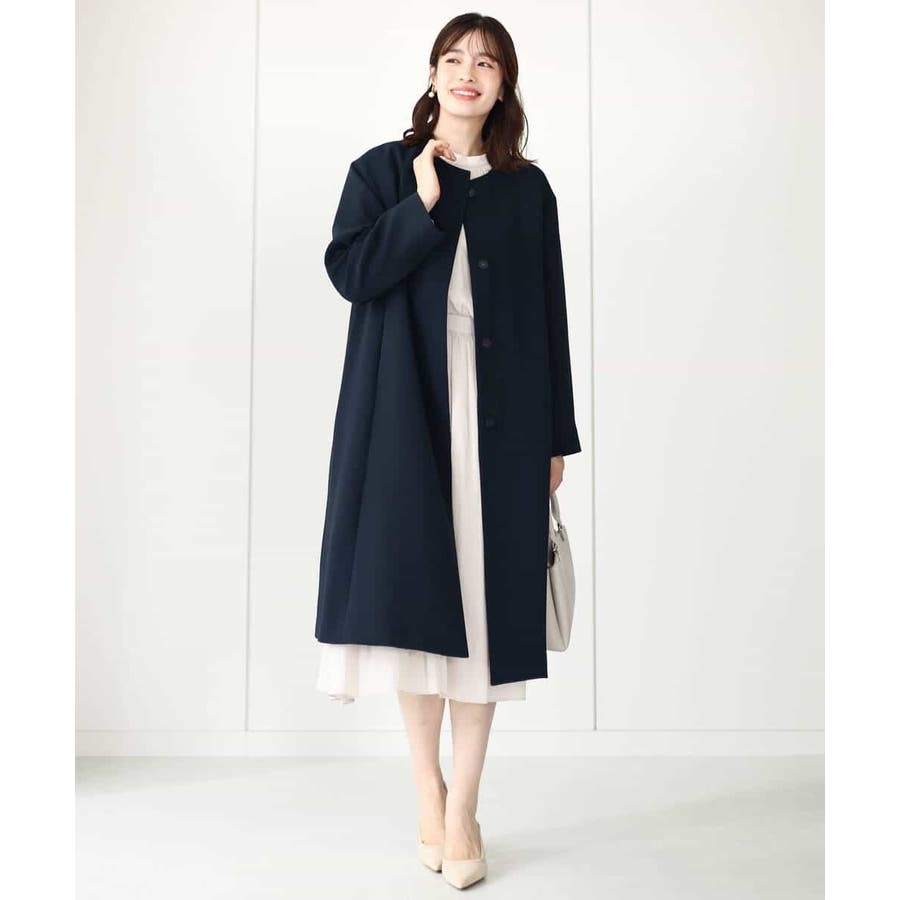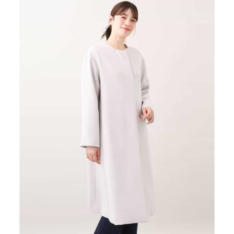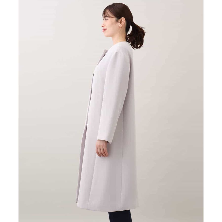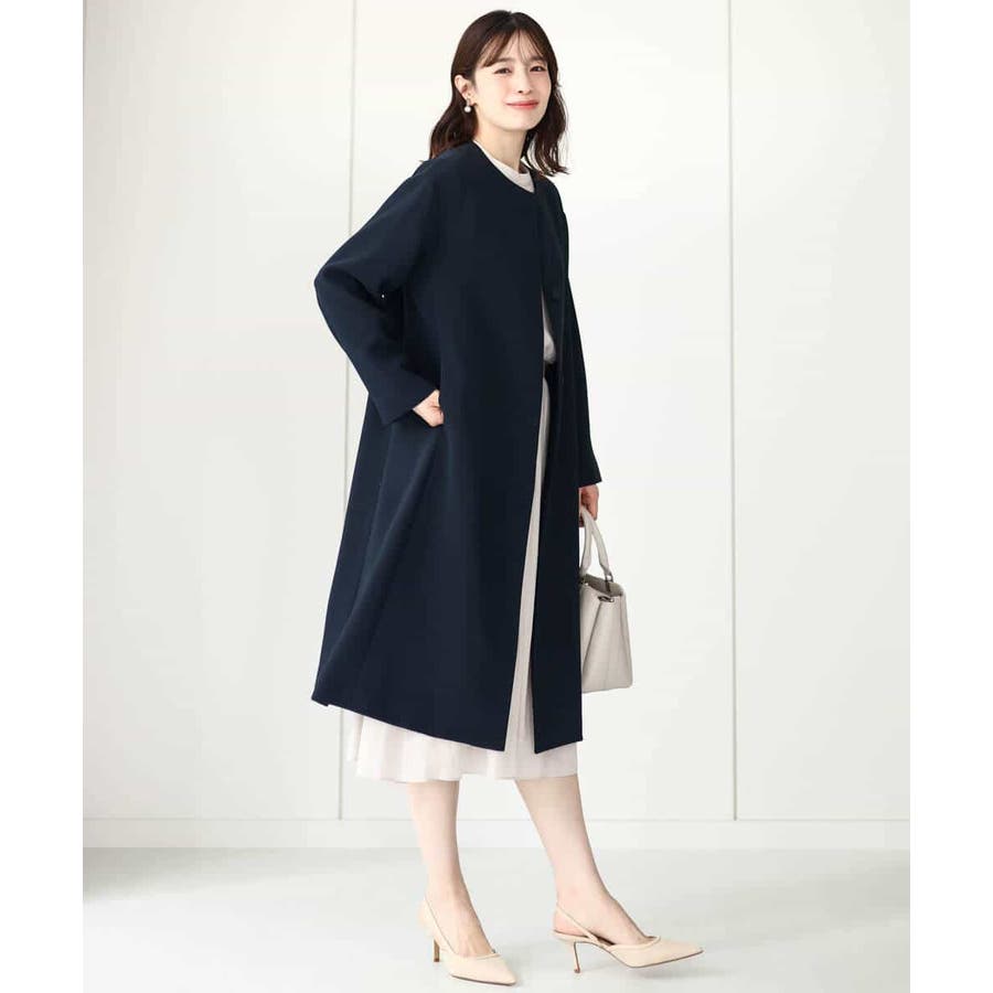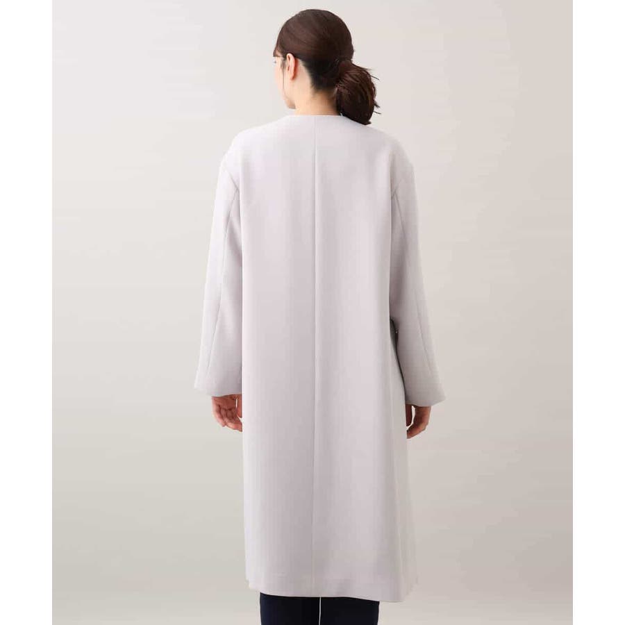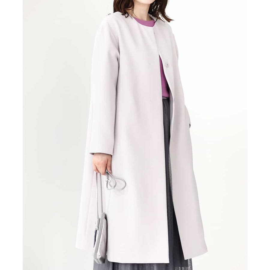 すっきりとしたシンプルなデザインに、裾が緩やかに広がるAラインが上品な大人にぴったりなノーカラーコート。毎回定番のベーシックコートも、今期は前端の重なり部分をカットしすっきりさせるパターンにアップデート。