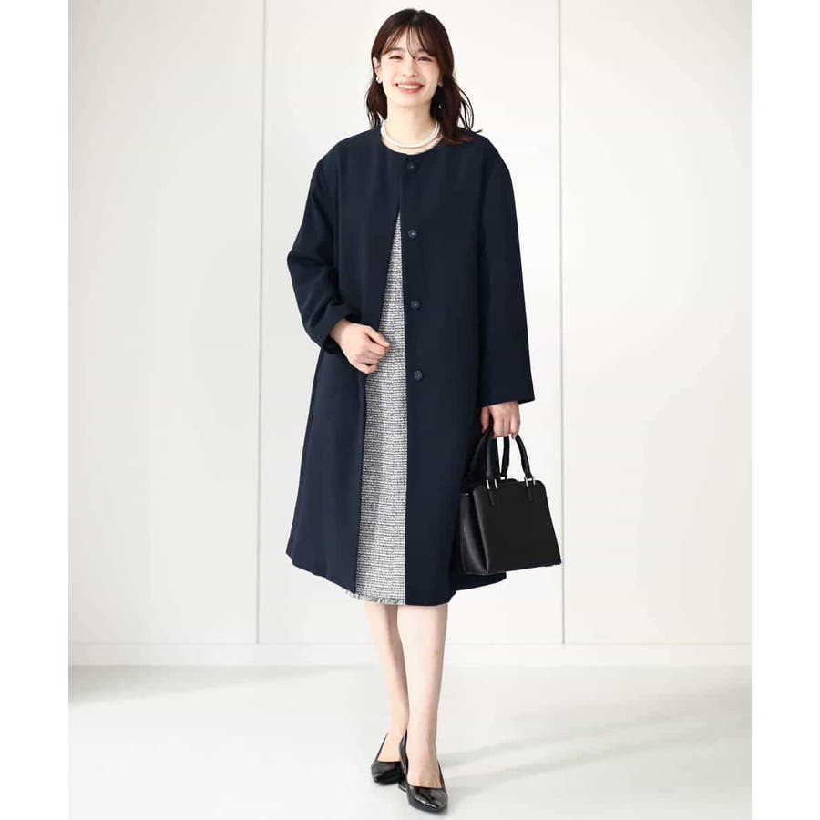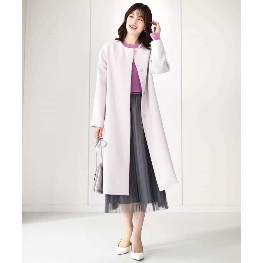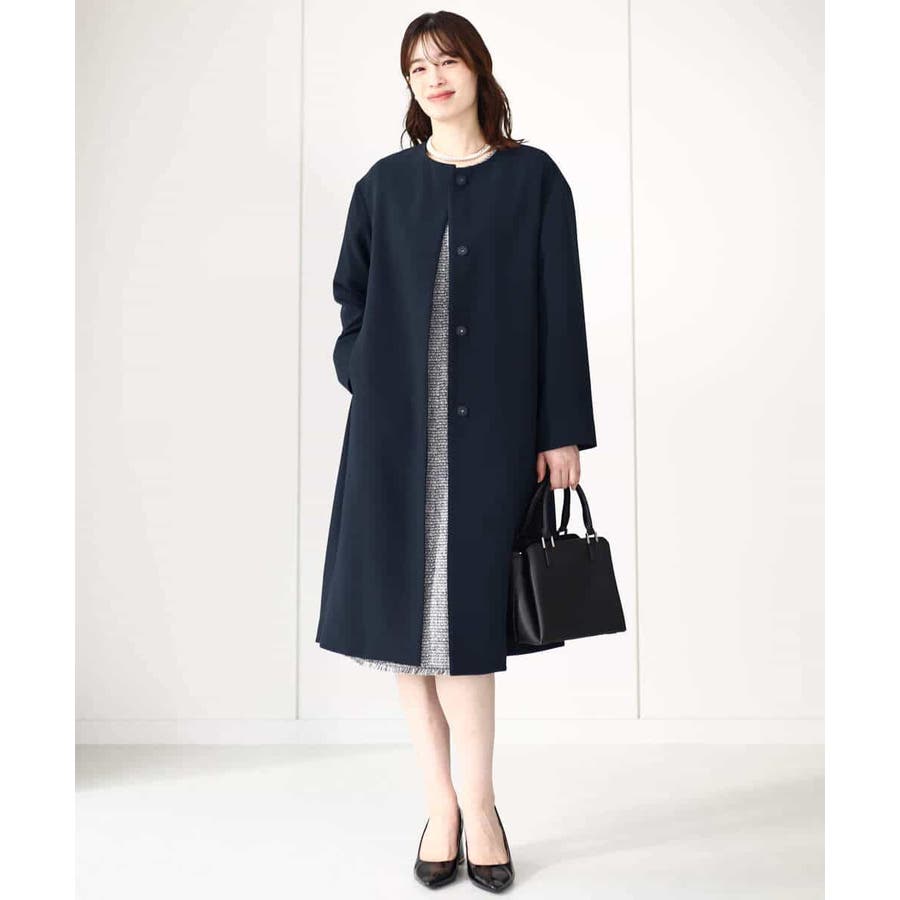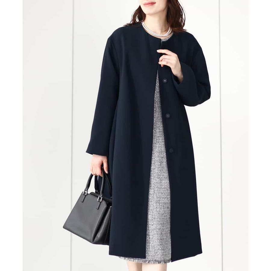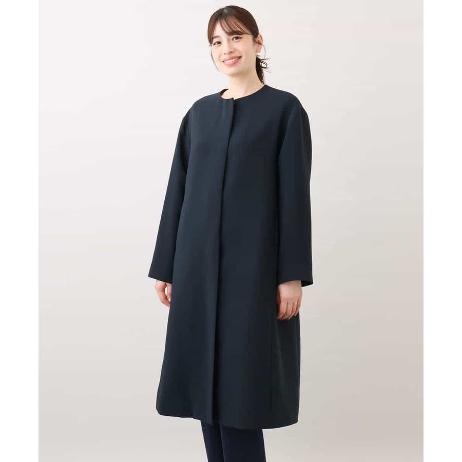 すっきりとしたシンプルなデザインに、裾が緩やかに広がるAラインが上品な大人にぴったりなノーカラーコート。毎回定番のベーシックコートも、今期は前端の重なり部分をカットしすっきりさせるパターンにアップデート。