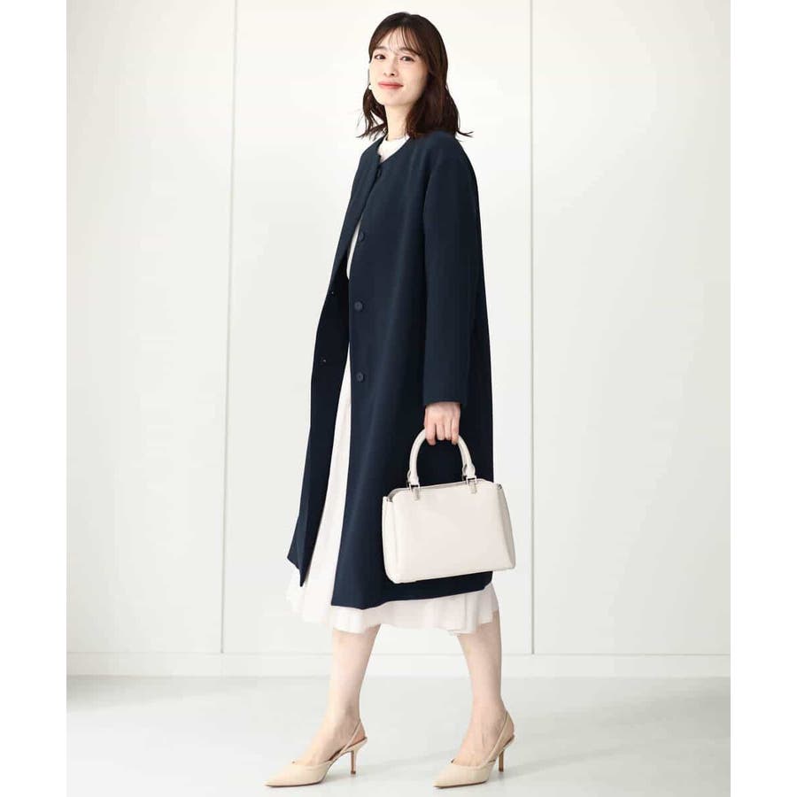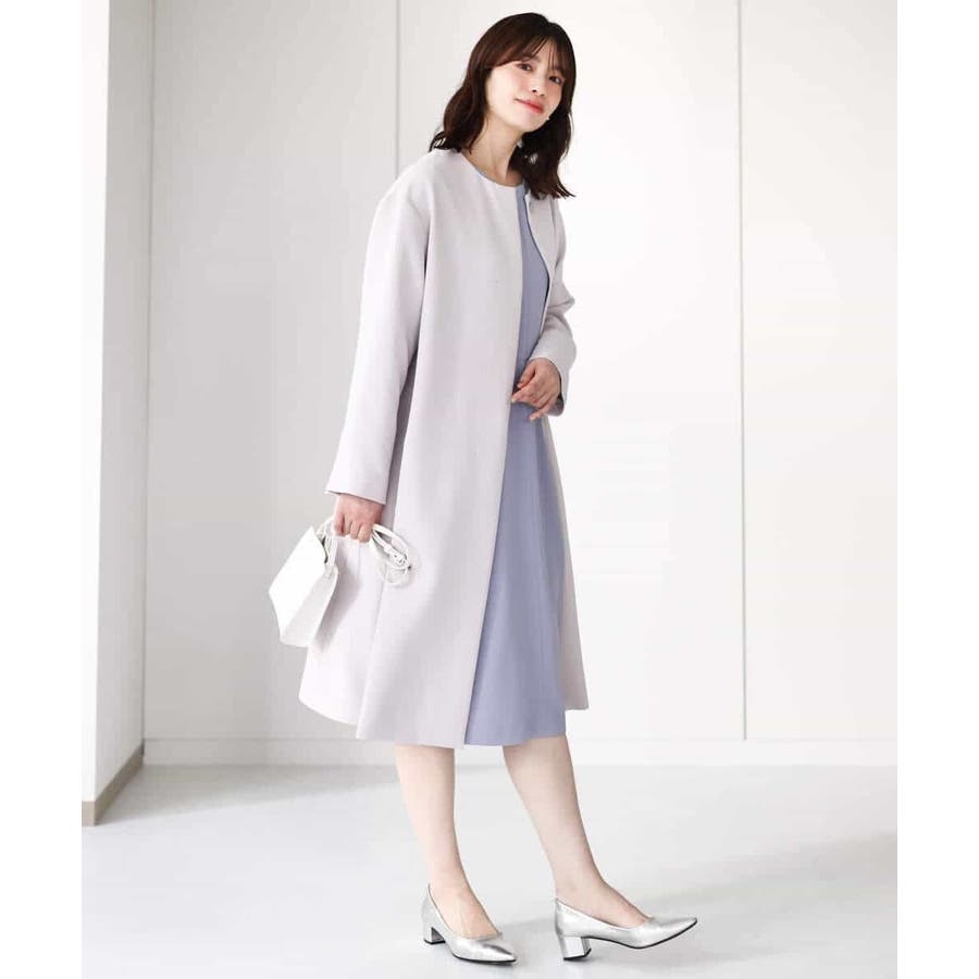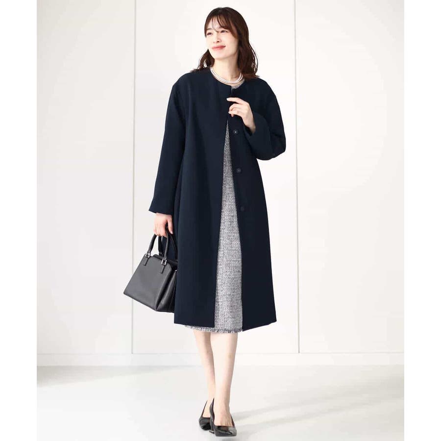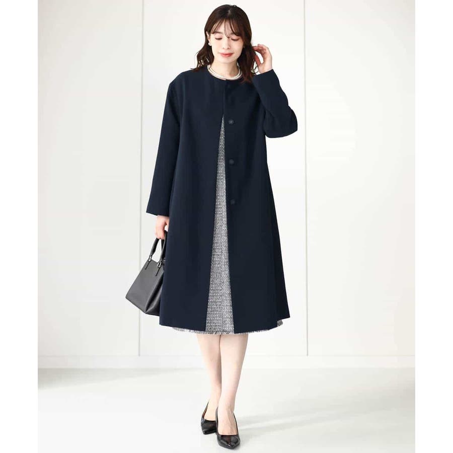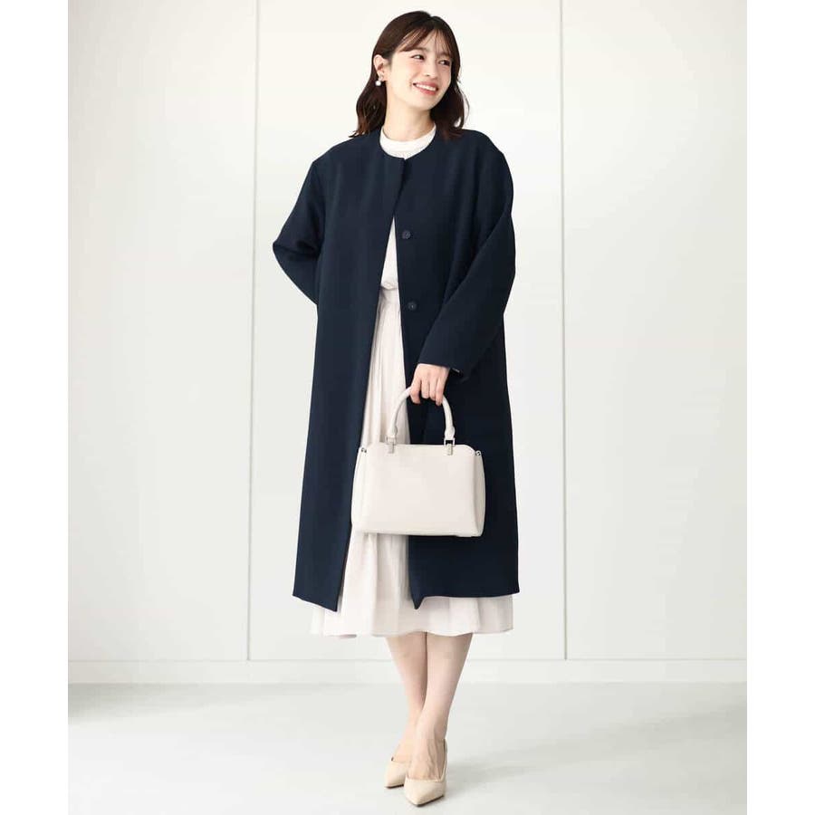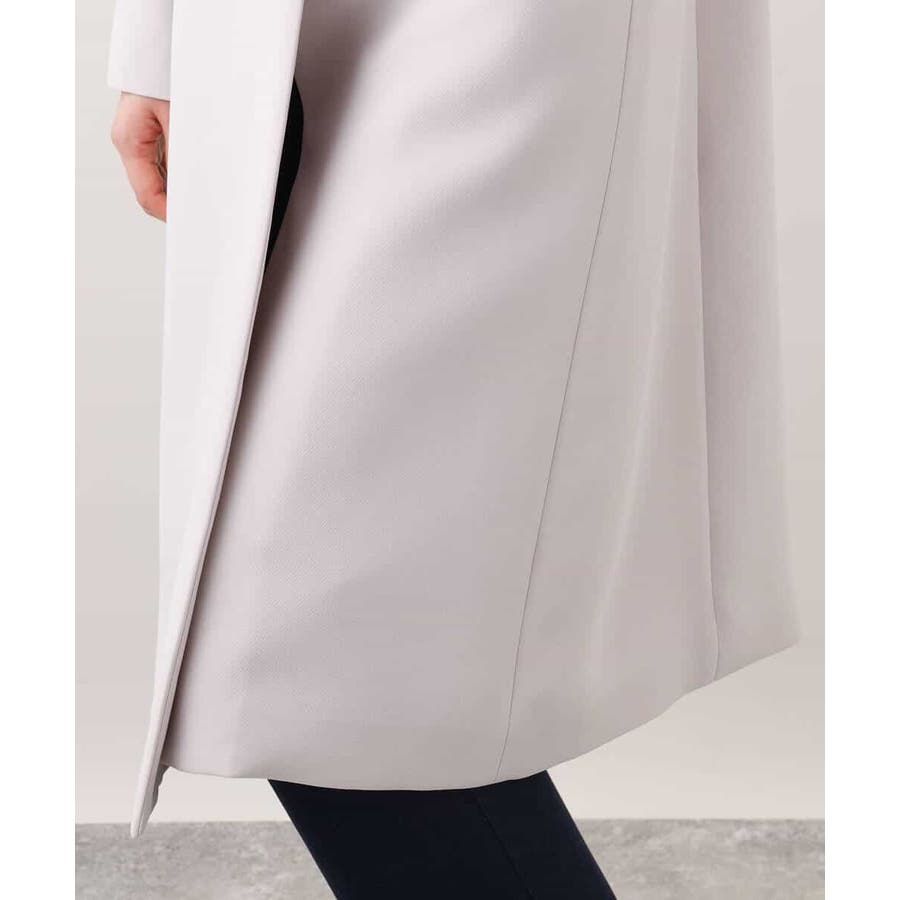 すっきりとしたシンプルなデザインに、裾が緩やかに広がるAラインが上品な大人にぴったりなノーカラーコート。毎回定番のベーシックコートも、今期は前端の重なり部分をカットしすっきりさせるパターンにアップデート。
