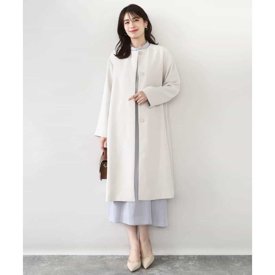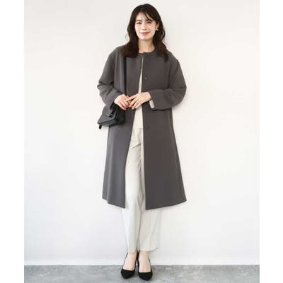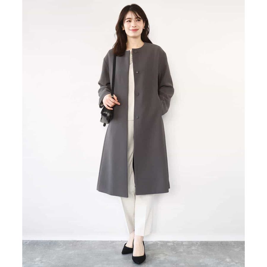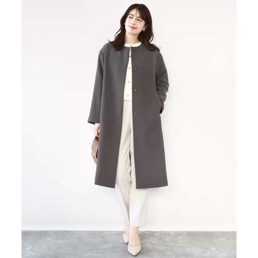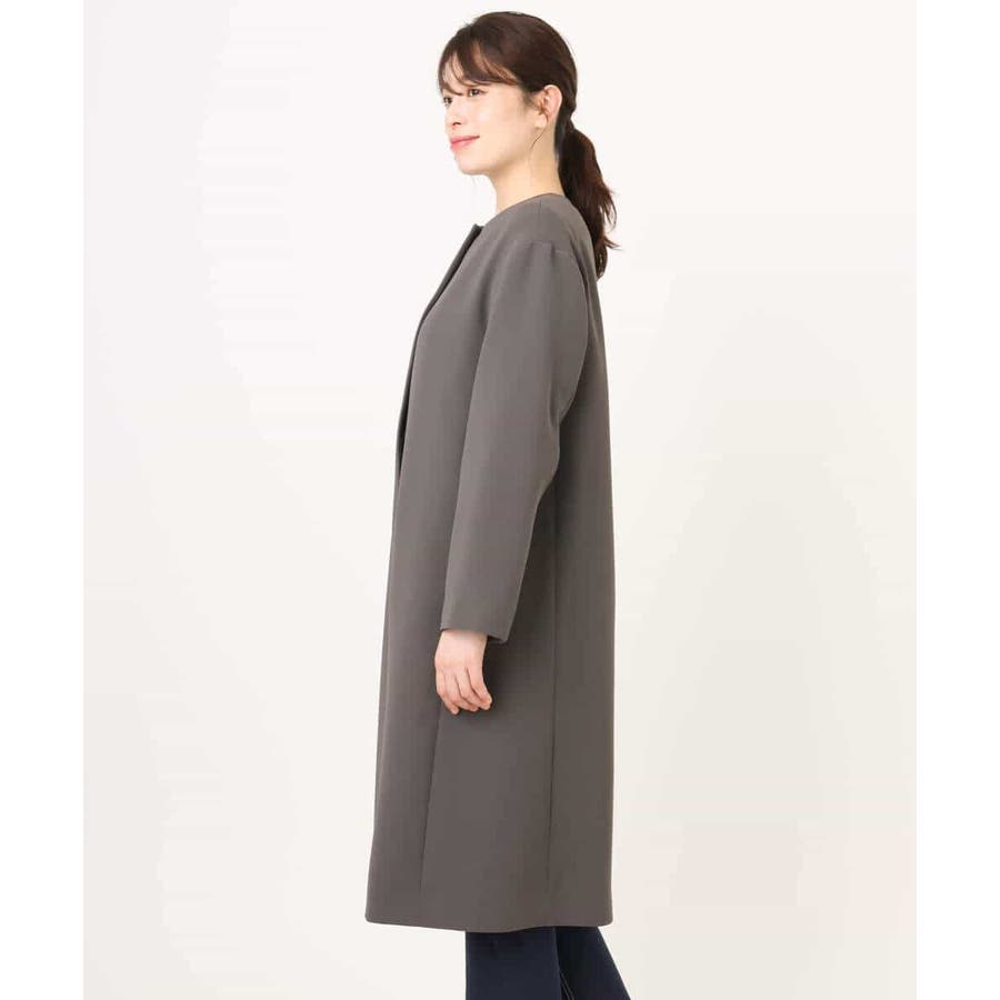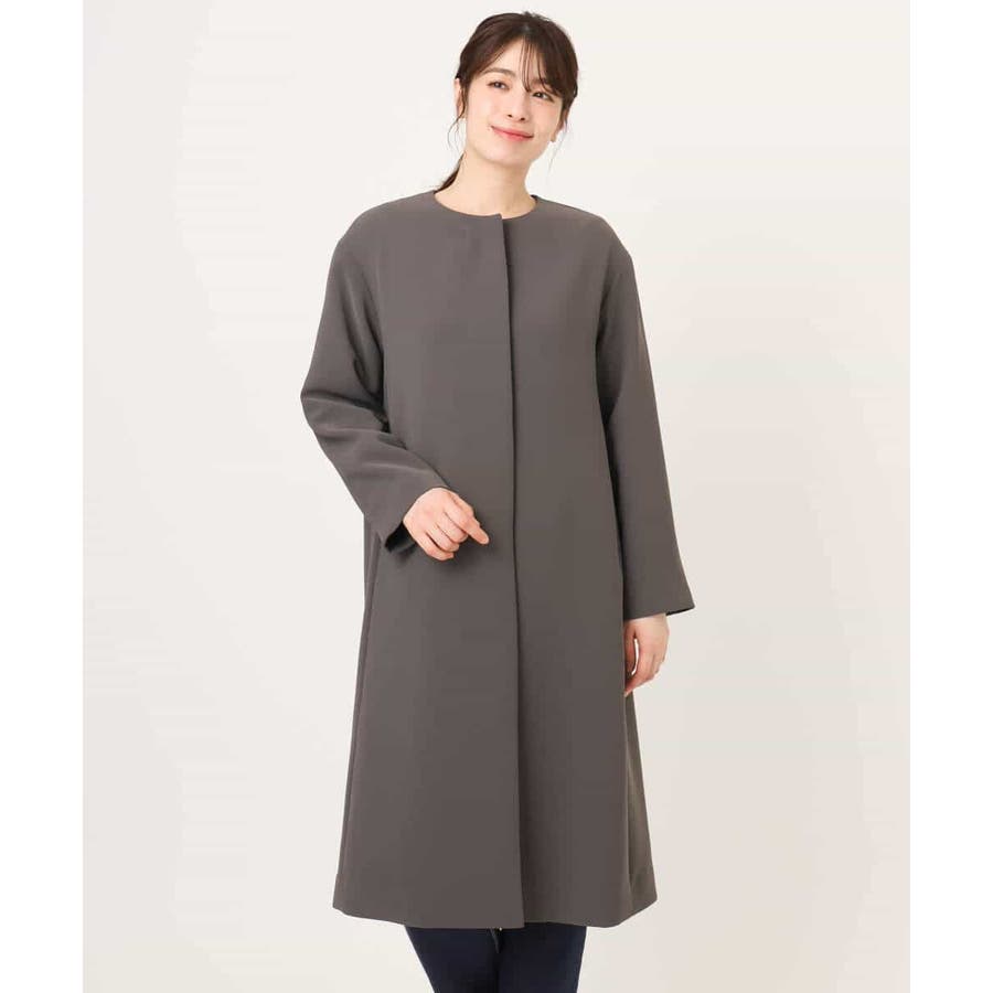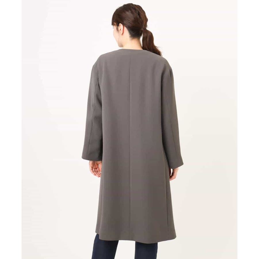 すっきりとしたシンプルなデザインに、裾が緩やかに広がるAラインが上品な大人にぴったりなノーカラーコート。毎回定番のベーシックコートも、今期は前端の重なり部分をカットしすっきりさせるパターンにアップデート。