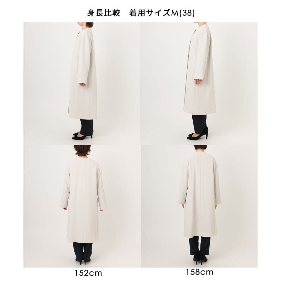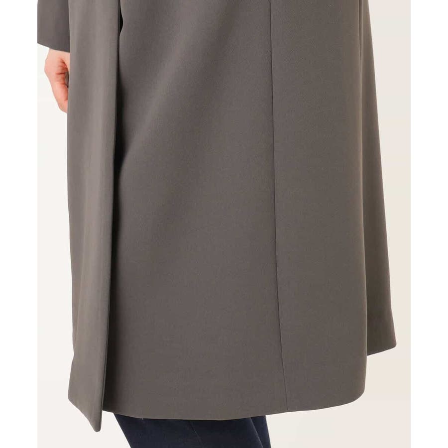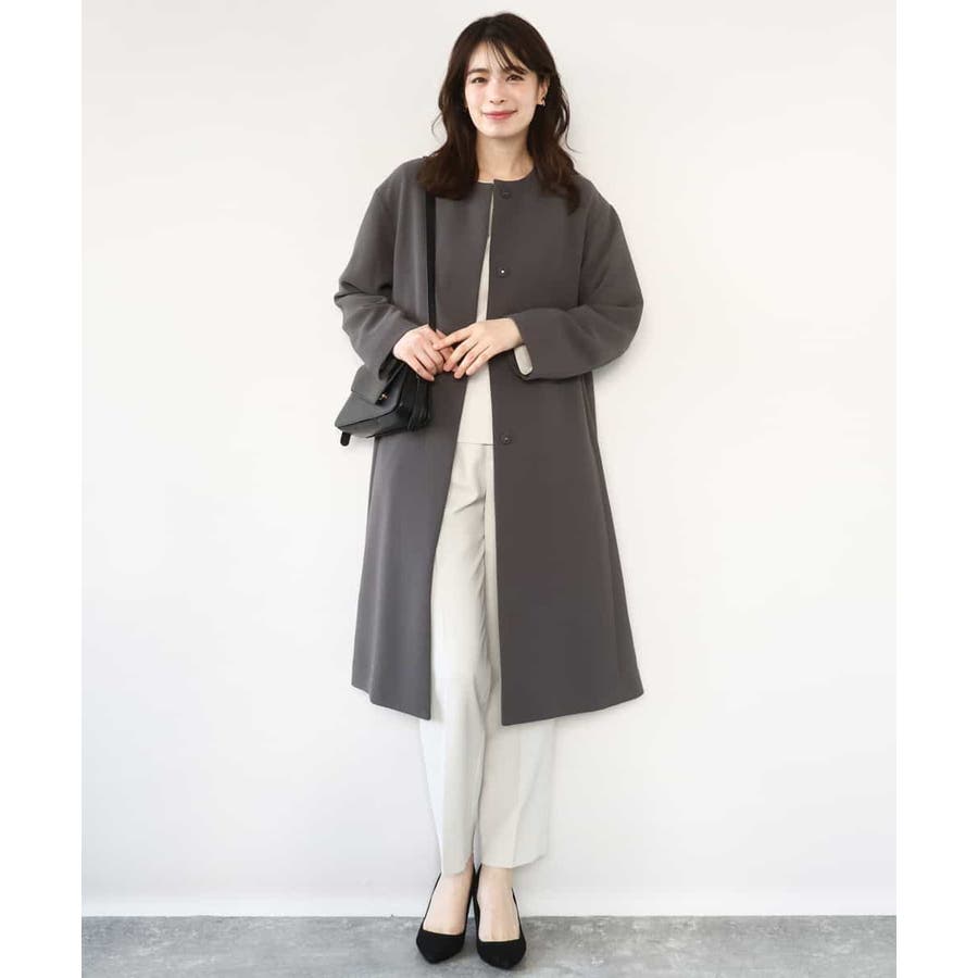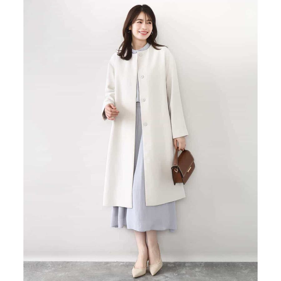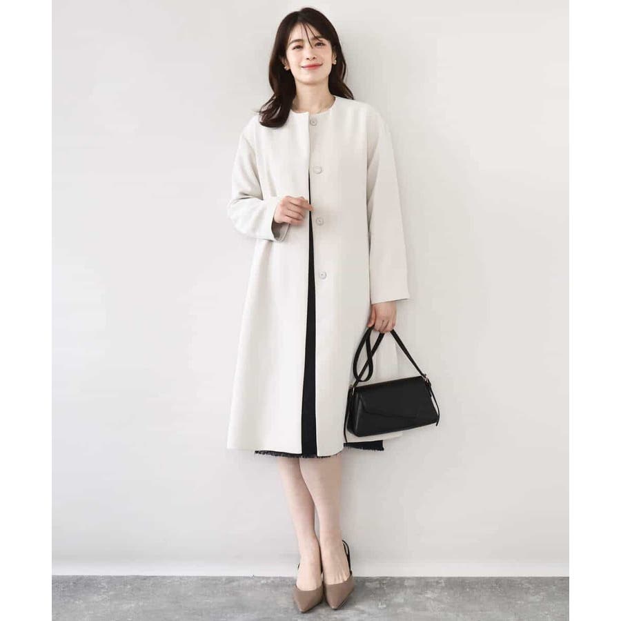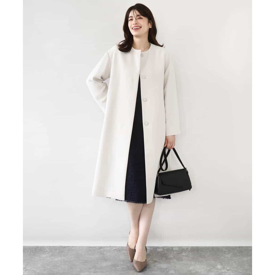 すっきりとしたシンプルなデザインに、裾が緩やかに広がるAラインが上品な大人にぴったりなノーカラーコート。毎回定番のベーシックコートも、今期は前端の重なり部分をカットしすっきりさせるパターンにアップデート。
