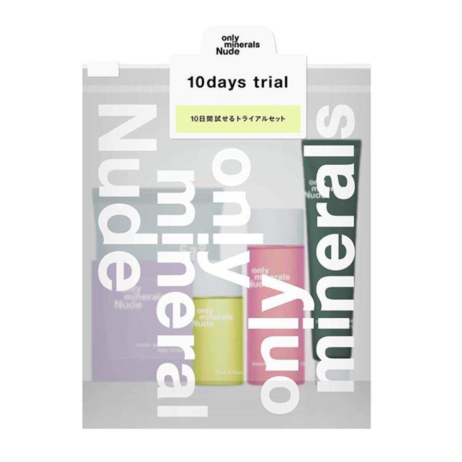 ≪10日間試せる敏感肌のためのスキンケアトライアルセット≫オンリーミネラル Nudeは、敏感肌の声を15年以上聞き続けてきたオンリーミネラルが「敏感肌でもスキンケアを楽しみながら美肌になれる」をコンセプトに掲げて開発したスキンケアラインです。1.Nude ポアクレイソープぬらした手で転がすだけですぐに泡立ち、もっちり弾力泡が作れる洗顔ソープ。多彩なミネラルを含むクレイ(ベントナイト)を配合し、毛穴汚れや古い角質を吸着。汚れをすっきり落としながらも洗い上がりはカサつきにくい枠練り製法です。ミネラルメイクなら石けん洗顔で気持ちよく落とすことができます。2.Nude ファーストCブースト洗顔後の肌をうるおいでほぐし、次に使うお手入れのなじみをよくするブースターセラム。とろみのあるテクスチャーがぐんぐんなじみ、土台を整えます。共通成分である3種の植物エキスのほか、ソメイヨシノ葉 エキス*、シソ葉エキス*、ドクダミエキス*を配合。 揺らぎがちな肌もしっとり、穏やかに。*整肌成分3.Nude バウンシーエッセンスローション乾燥してゆらぎやすい肌に穏やかに水分を補給し、環境のいい湿潤状態を作ることを目指した化粧水。水分をたっぷり抱え込むシロキクラゲ多糖体*とスイゼンジノリ多糖体*を配合。さらにアミノ酸*も配合し、与えた水分をキープします。適度なとろみと浸透感で、満足感のあるテクスチャーにこだわりました。*保湿成分4.Nude クロノナイトチャージジェル肌が日中受けた乾燥などのダメージをケアするジェルクリーム。夜の肌のために厳選した植物エキス、レチノール※1や3種のセラミド※2などを抱え込んだテクスチャーが肌にぴたっと密着し、翌朝までじっくり包み込みます。厚めにたっぷり重ねればナイトマスクとしても。※1整肌成分 ※2保湿成分5.Nude マルチディフェンスデイクリームたっぷりのうるおいで肌を包み、日中の乾燥を防止。日常紫外線防止効果と淡いピンクで明るさを演出する効果も備え、朝のスキンケアの仕上げにふさわしいクリームです。もっちり感がありながらベタつきにくいテクスチャーで、メイク下地としても。※SPF11/PA+【セット内容】・Nude ポアクレイソープ 10g (約10日間分)・Nude ファーストCブースト 10mL (約10日間分)・Nude バウンシーエッセンスローション 20mL (約10日間分)・Nude クロノナイトチャージジェル 10g (約10日間分)・Nude マルチディフェンスデイクリーム 2回分