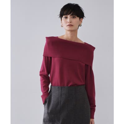 ・顔周りがすっきりと見えるオフショルダーデザインのニットトップス。