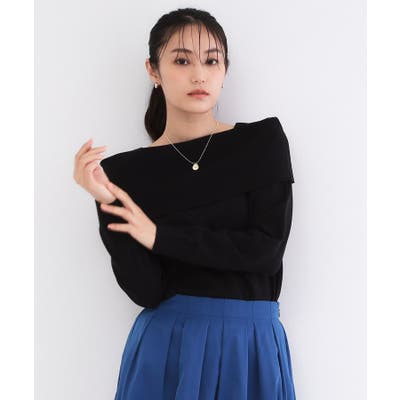 ・顔周りがすっきりと見えるオフショルダーデザインのニットトップス。