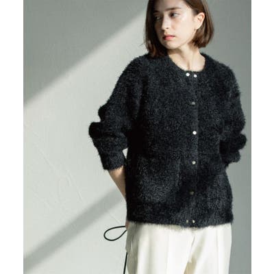 ・毛足感のあるシャギー糸とポリエステル糸をダブルフェイスで編み立てたニットカーディガン。