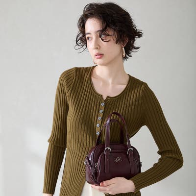 光沢のある素材を使用したボストンバッグはさりげないシルバーの金具が大人見えするデザイン。さらにフロント部分がファスナー付きのポケットになっているので小物の収納にぴったり。しっかりめのマチがあるので小ぶりのサイズ感ながらも毎日の必需品が収まる容量なのも使いやすい。取り外し可能なショルダーストラップ付き。