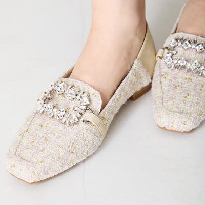 | モチーフ部分が付け替え可能な特別感のあるローファーが登場。 デザインの違う3種類のモチーフが付いているので、 その日のシーンやスタイルに合わせてデザインをカスタムできるのが嬉しい。 厚手クッション入りのインソールで疲れにくく、 さらに踵が踏めるバブーシュ仕様で気になる踵の負担を軽減。 1足でマルチに大活躍してくれること間違いなしの注目アイテム。 ◆素材 合成皮革、ピンク→ツイード生地(ポリエステル、レーヨン、毛)×合成皮革 ライニング(内側):マイクロファイバー(合成繊維) 靴底:合成底 生産国:中国 |