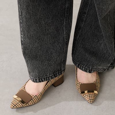 存在感たっぷりの大きなスクエアモチーフにゴールドのプレートがこなれ感をより演出するパンプス。ポインテッドトゥで足元を綺麗に見せながら、安定感のある太めの台形ヒールに、つま先や踵には柔らかな芯を採用することで見た目以上に履き心地面も考えられたアイテム。ツイード素材のブラウンは、落ち着きのあるカラーリングながらもスタイリングのアクセントになるカラー。
