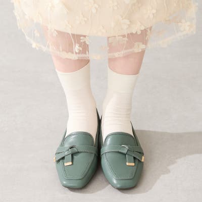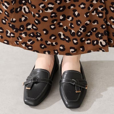 シルエットの綺麗なスマートなスクエアトゥに、複雑に編みこんだリボンのベルトを組み合わせた大人可愛いローファー。アッパーやベルトに入れたステッチで抜け感がありながら、リボン先端にはゴールドの金具を施したデザインが高見えポイント。つま先や中敷にクッションを搭載することで、指先や足全体の負担を軽減してくれる優しい仕様。