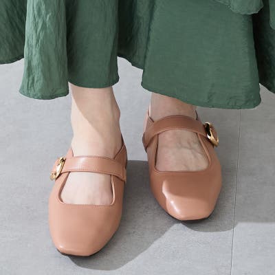 ほんのりスクエアカットしたラインでこなれ感を出しつつ、ゴールドの変形バックルでひとクセ加えたストラップパンプス。甲をホールドする太めのベルトに、つま先クッション入りで足を包み込むようなフィット感を実現。つま先から全体にかけて柔らかな素材に、踵を踏んでも履けるバブーシュデザインなど、心地よい履き心地でデイリー使いにぴったりの1足。