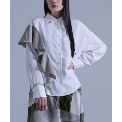 ■デザイン 右肩のフリルが個性的な印象に導くデザインシャツ。カフス部分に入った斜めの配色ラインがアクセントになります。 ■素材 さらりとした肌触りの良い布帛生地のシャツ。フリル部分はつるりとした光沢感とハリ感のある、キレイなフリルのシルエットが出る生地です。 ■コーディネート 落ち着いた配色感なので、シンプルなボトムスはもちろん柄物のスカートやパンツとも好相性です。ボタン開きで羽織にも使え、一枚着るだけでモードな印象に。 |