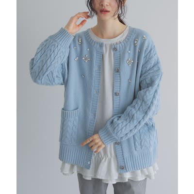 ■デザイン ビジューをあしらった華やかな印象のニットカーディガン。襟・袖口・ポケット口にはラメ糸を編み込み、ポイントにしました。ボタン付け糸にもラメ糸を使用し、細部にまでこだわったデザインです。 ■コーディネート シンプルなアイテムの上にさっと羽織るだけで華やかな着こなしに。ビジューは胸元のみなので派手過ぎず、パンツにもスカートにも合わせやすい一枚です。 ■素材 アクリル糸を使用した、柔らかく暖かな着心地のニット。ケーブル編みを取り入れて編地にも変化をつけました。 |