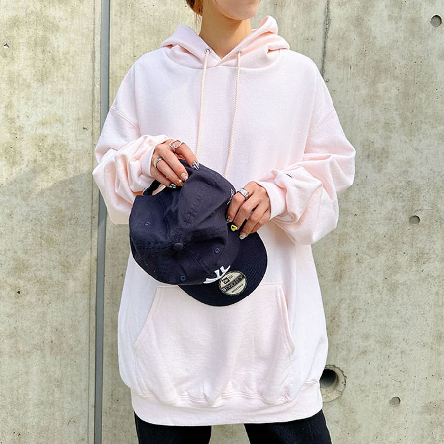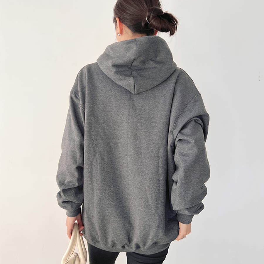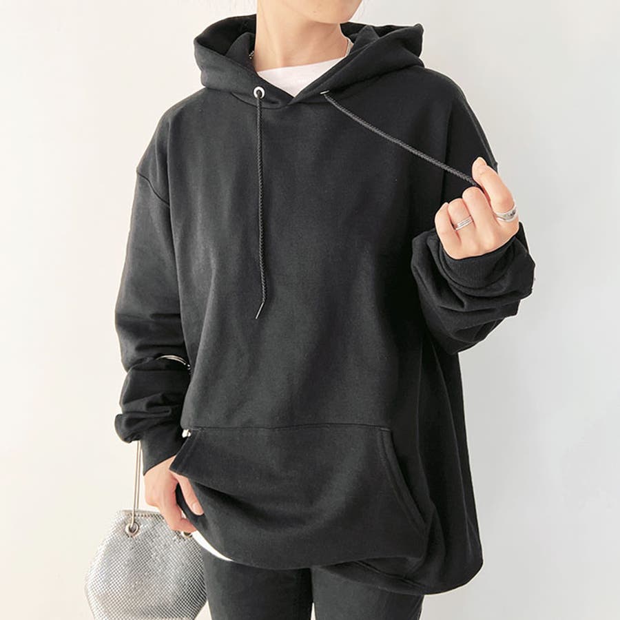 ゆとりのある身幅、ワイドなボリューム袖、前面にはカンガルーポケット付き。
