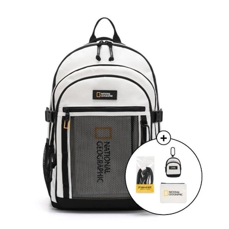 フロントのメッシュポケットに付属のロゴポーチとストリングベルトを使用し、3タイプの演出が可能。