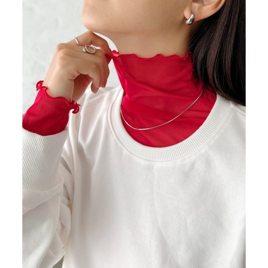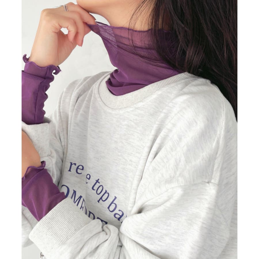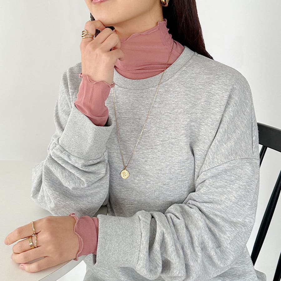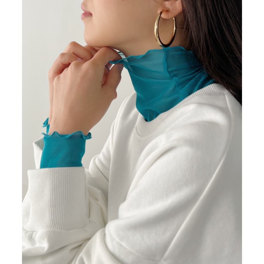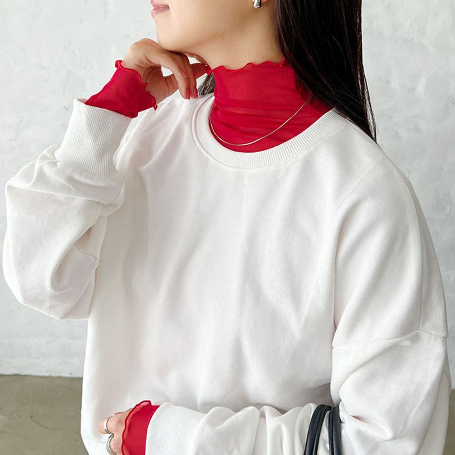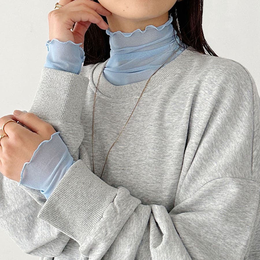 シアーインナーとしてニットやスウェット、シャツのインナーに着て首元や袖元のフリルをのぞかせると今年らしい旬なスタイリングに◎