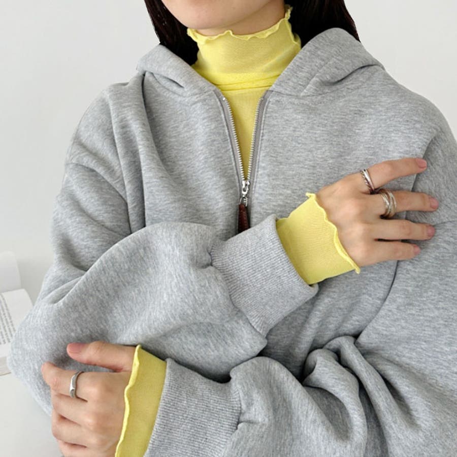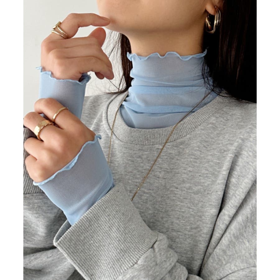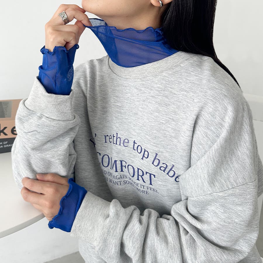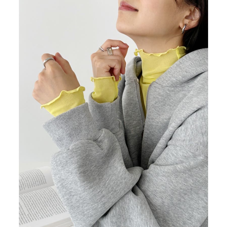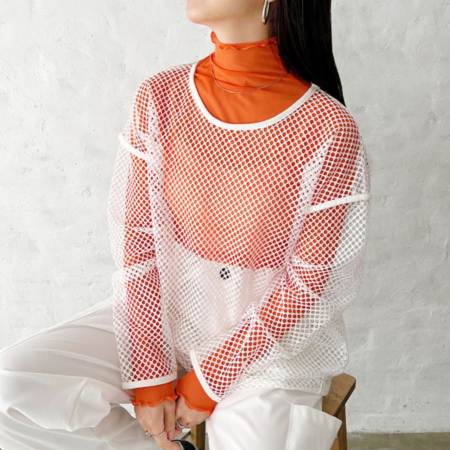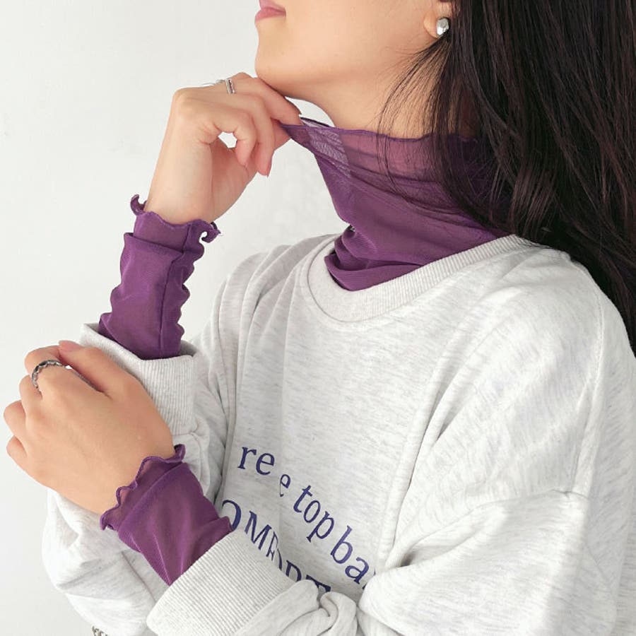 シアーインナーとしてニットやスウェット、シャツのインナーに着て首元や袖元のフリルをのぞかせると今年らしい旬なスタイリングに◎