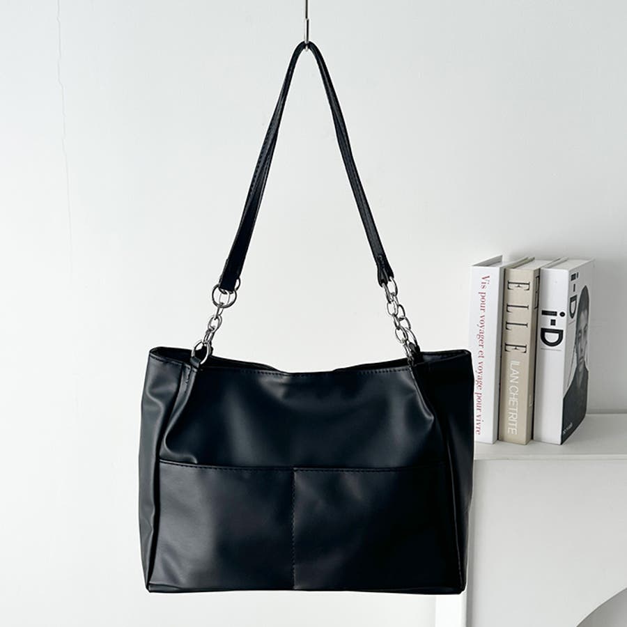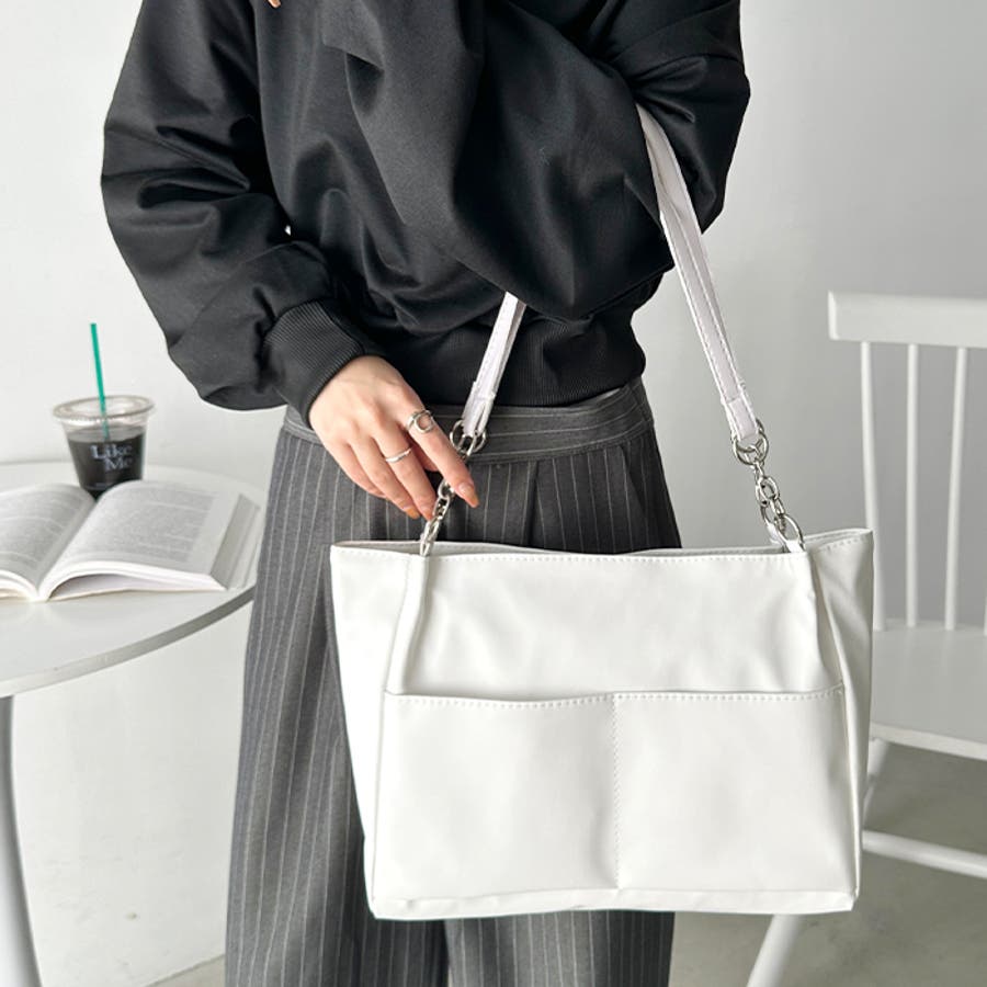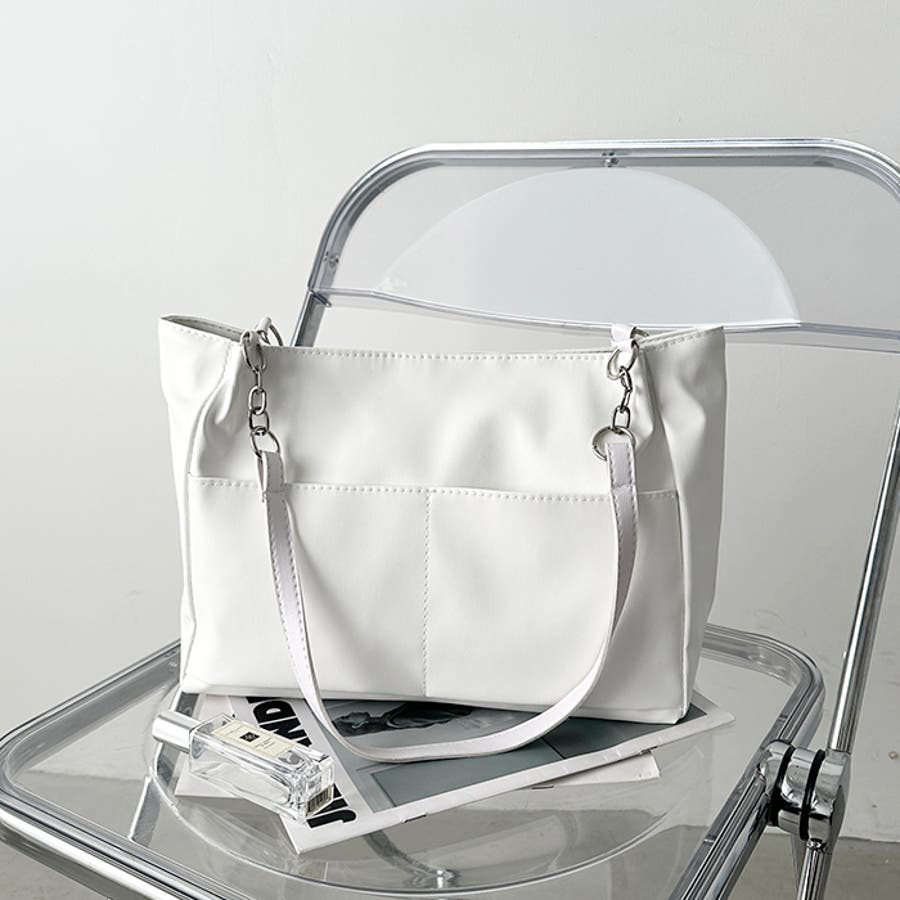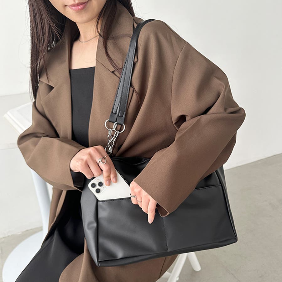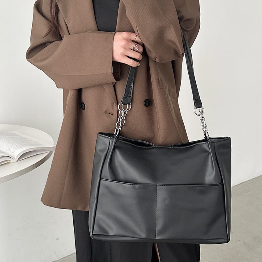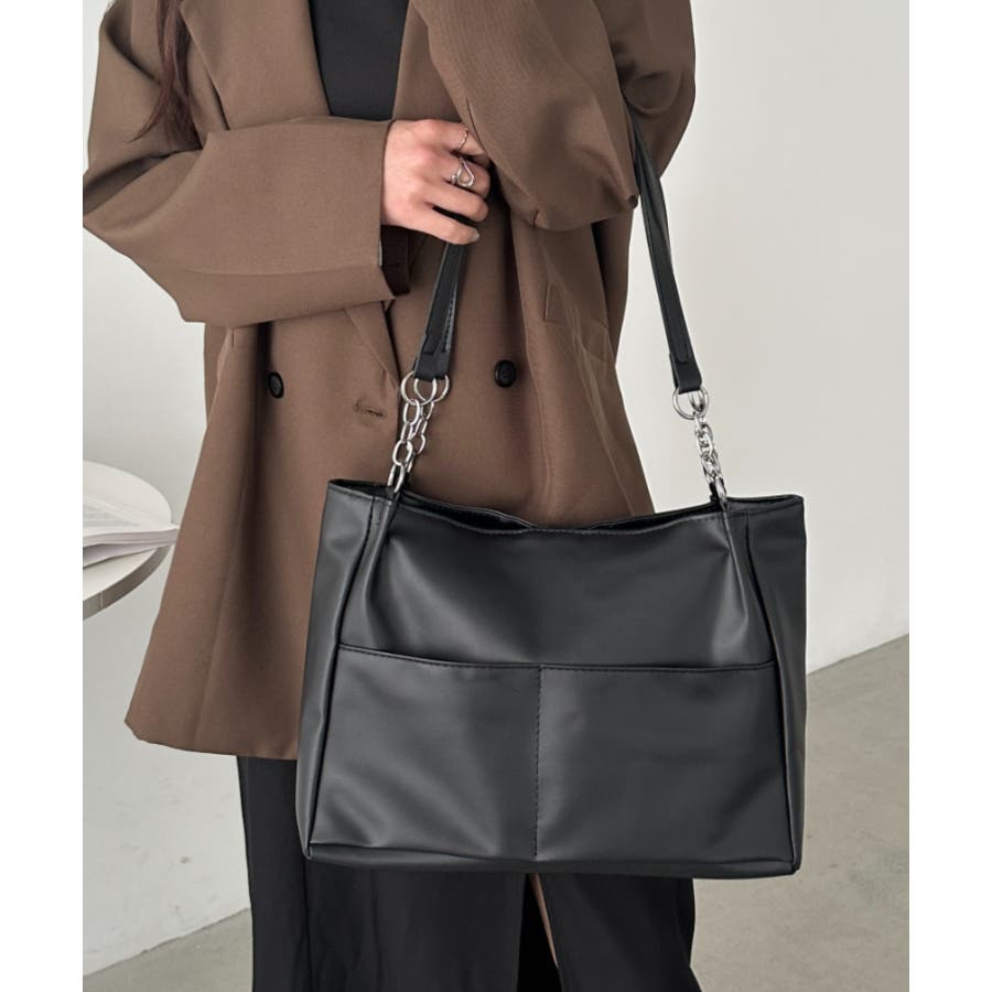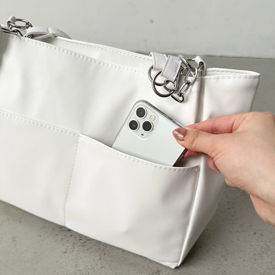 外ポケットが2つ付いた、オンオフ使いやすいPU素材のトートバッグ。