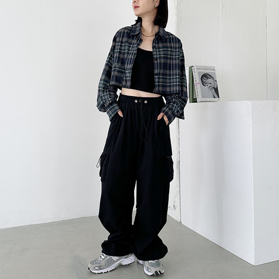 トレンドのカーゴパンツやデニムパンツで合わせると
