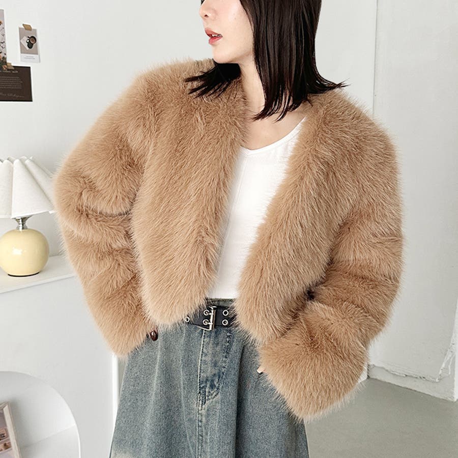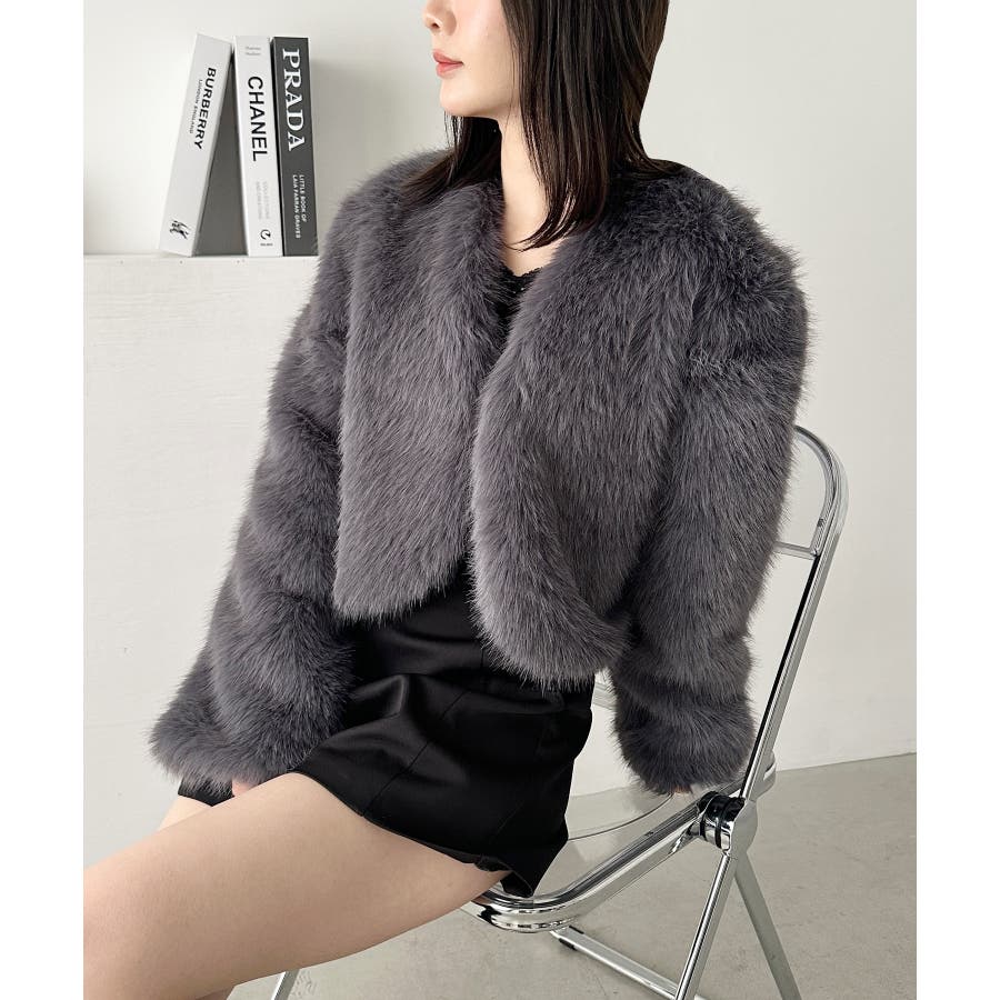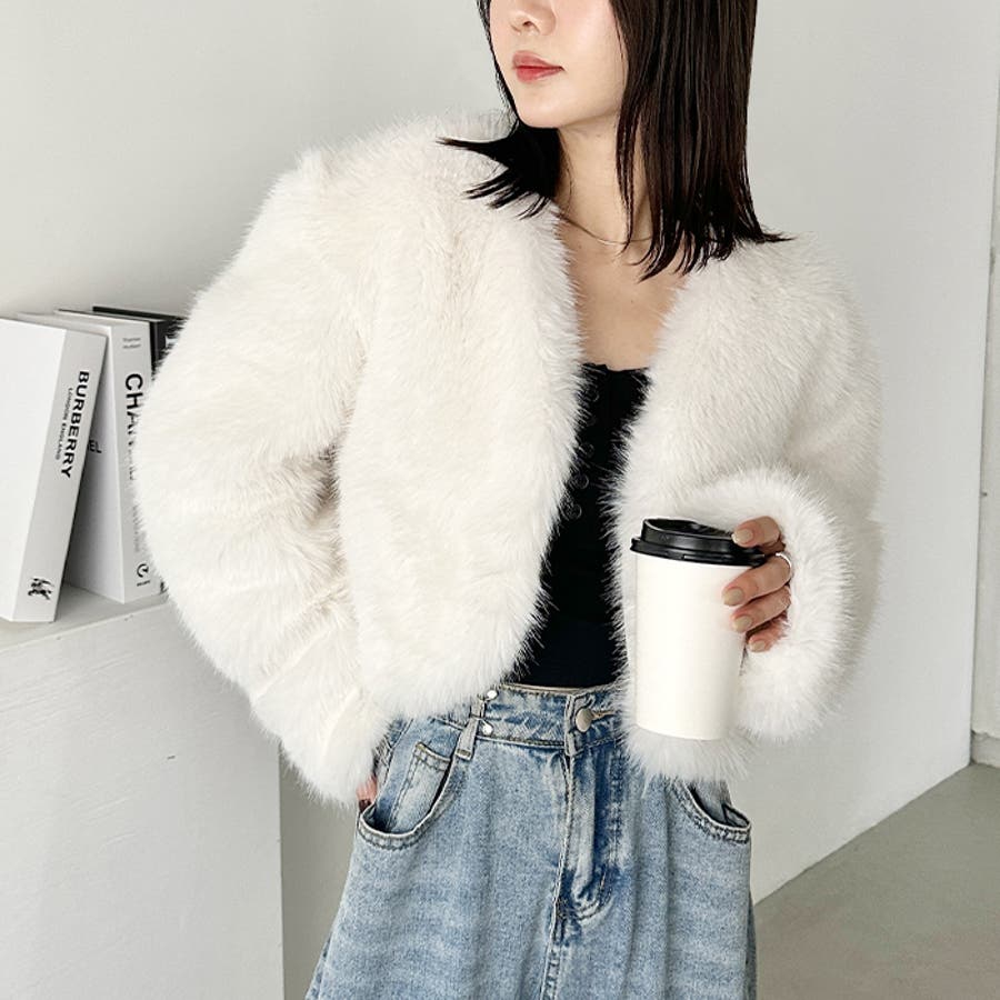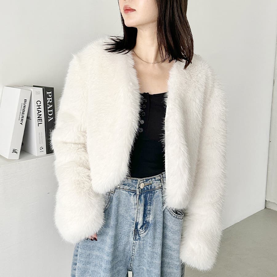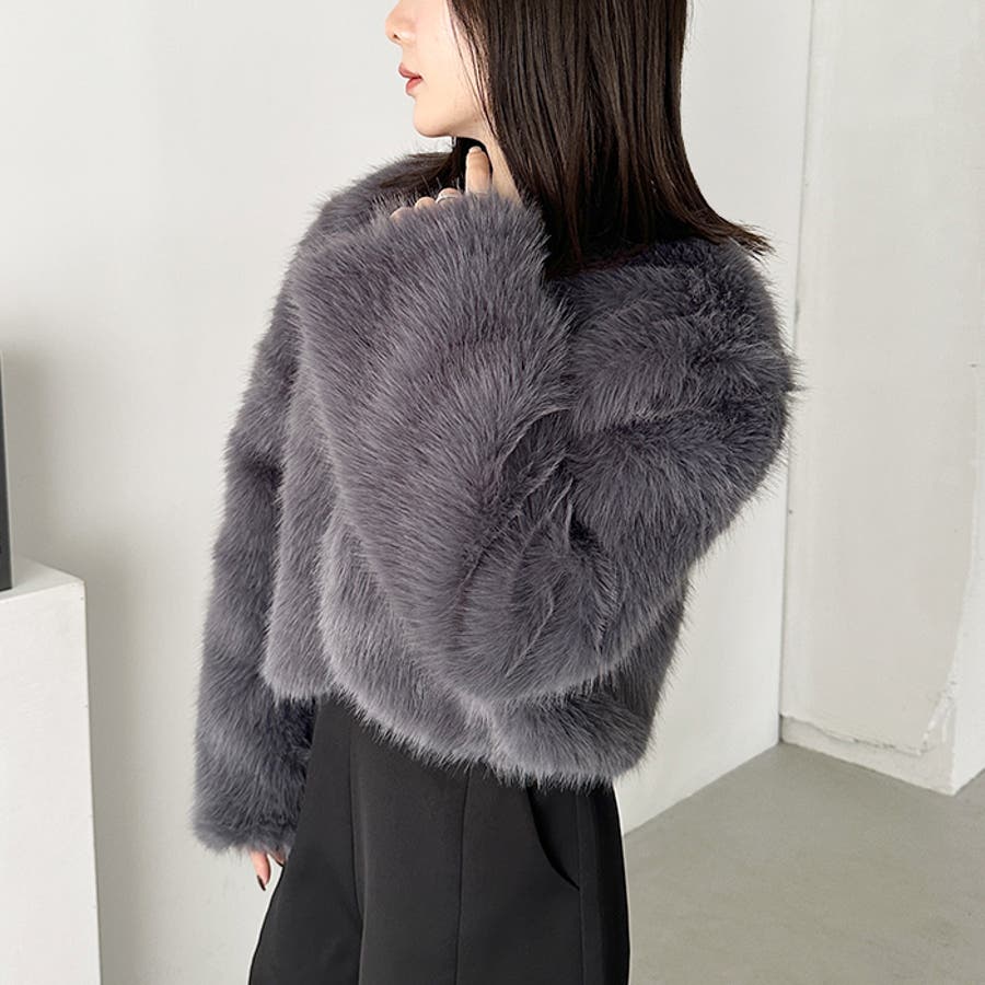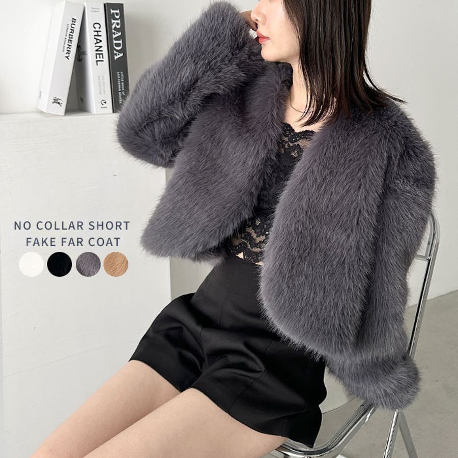 ノーカラーショートフェイクファーコート